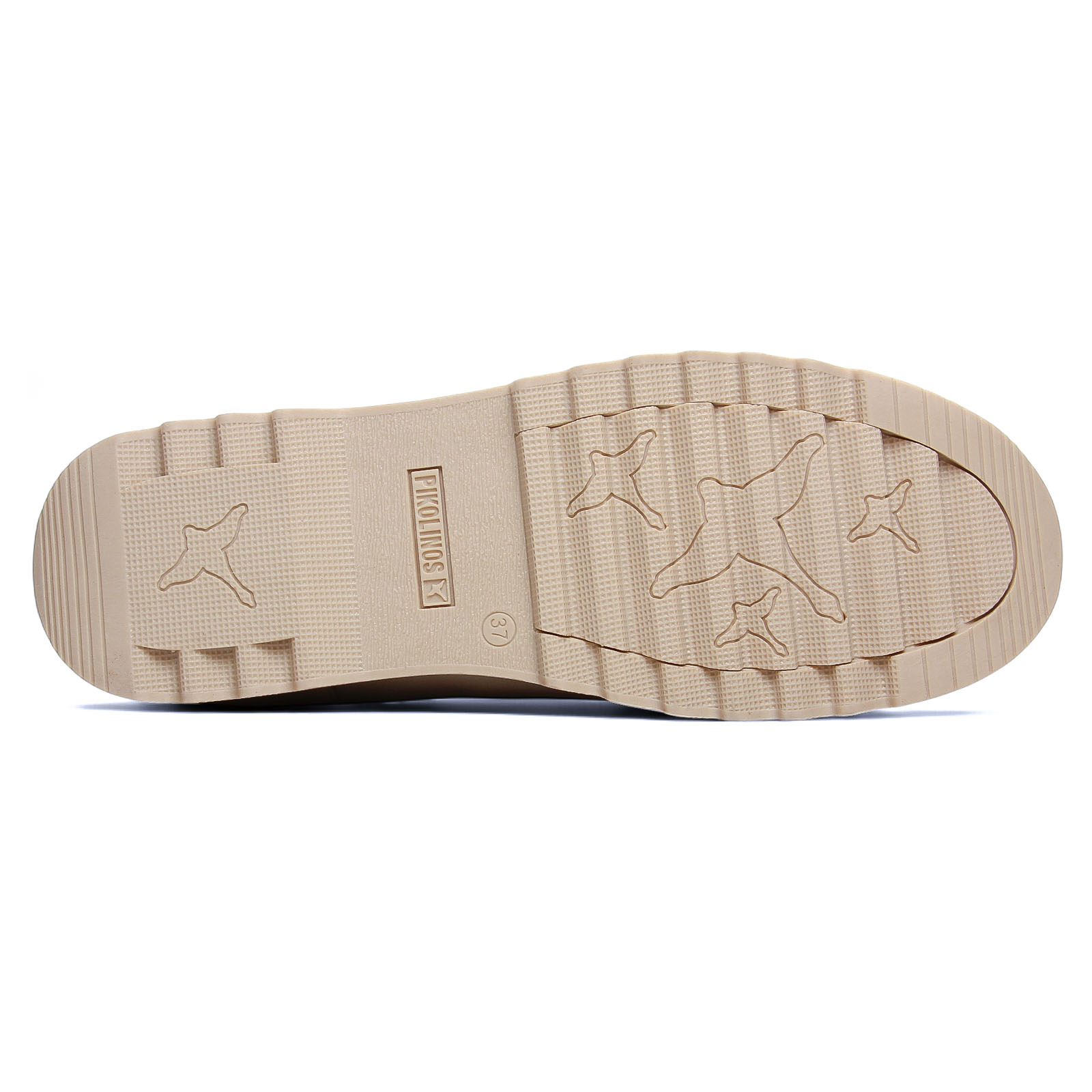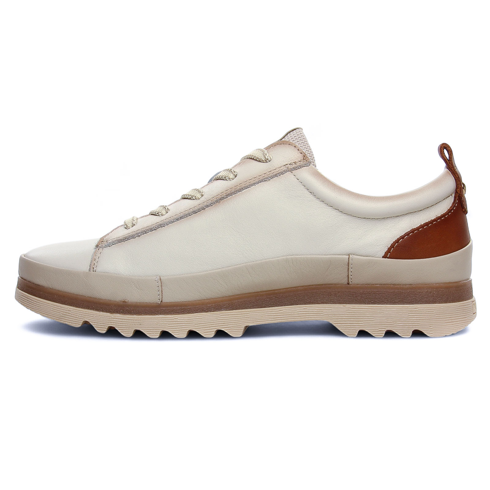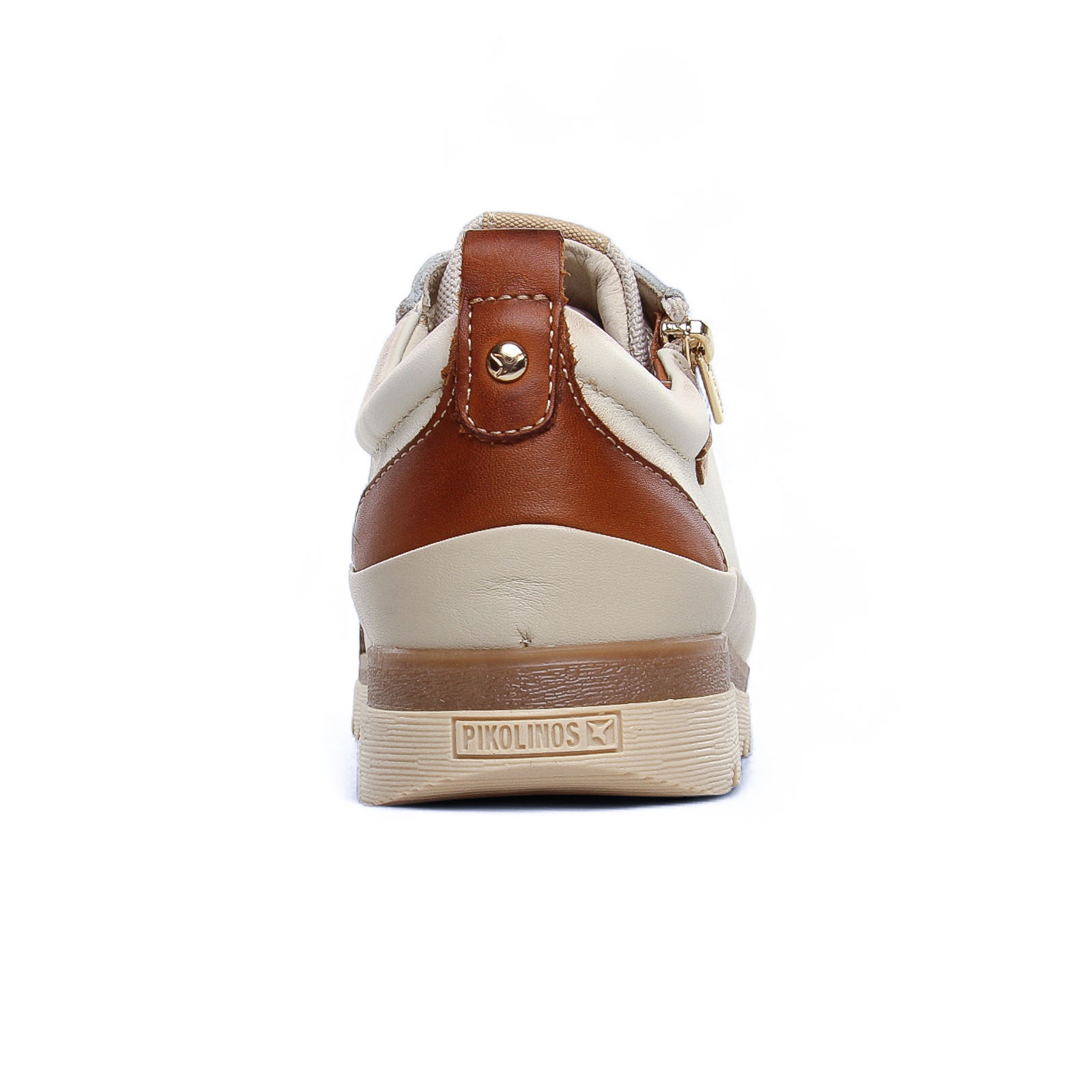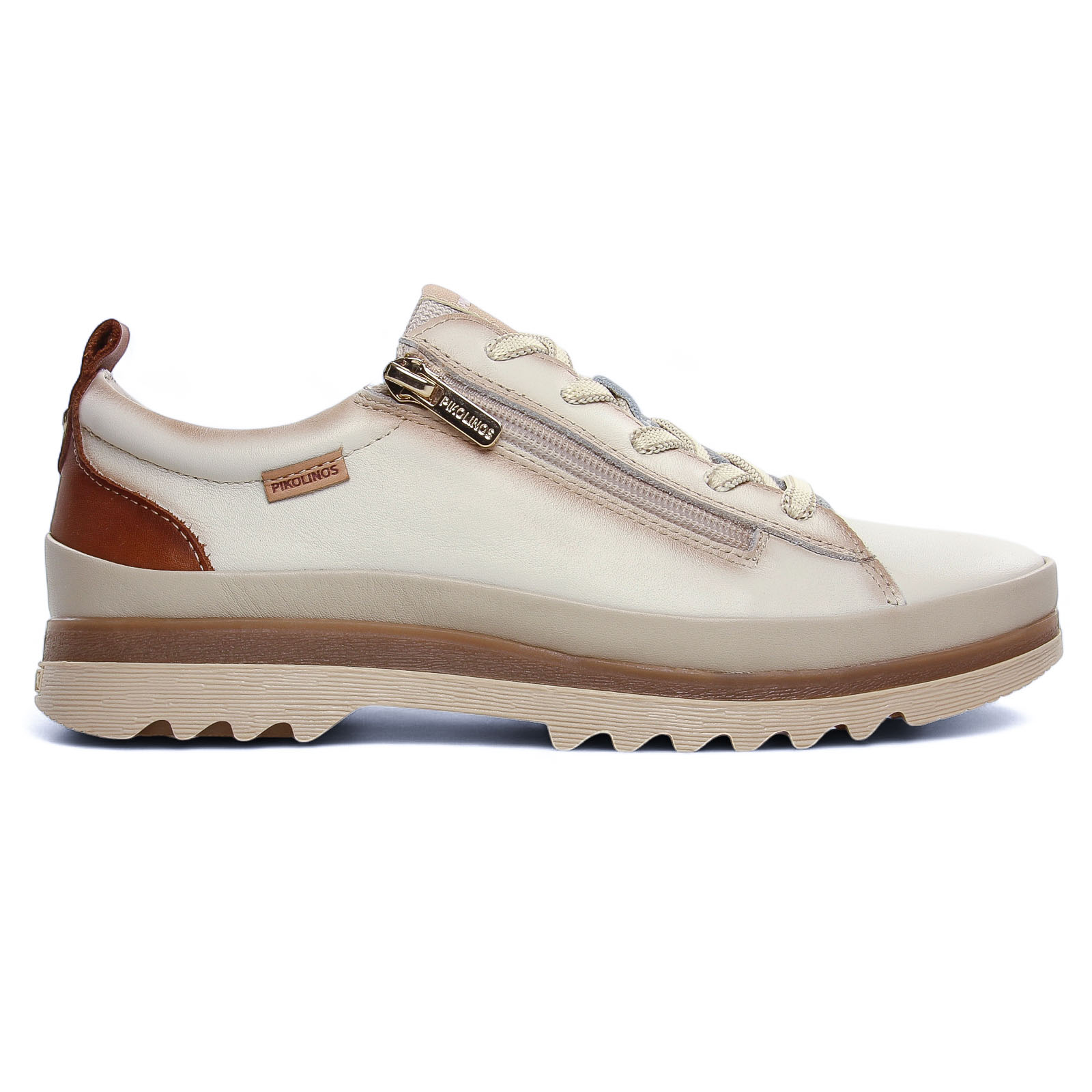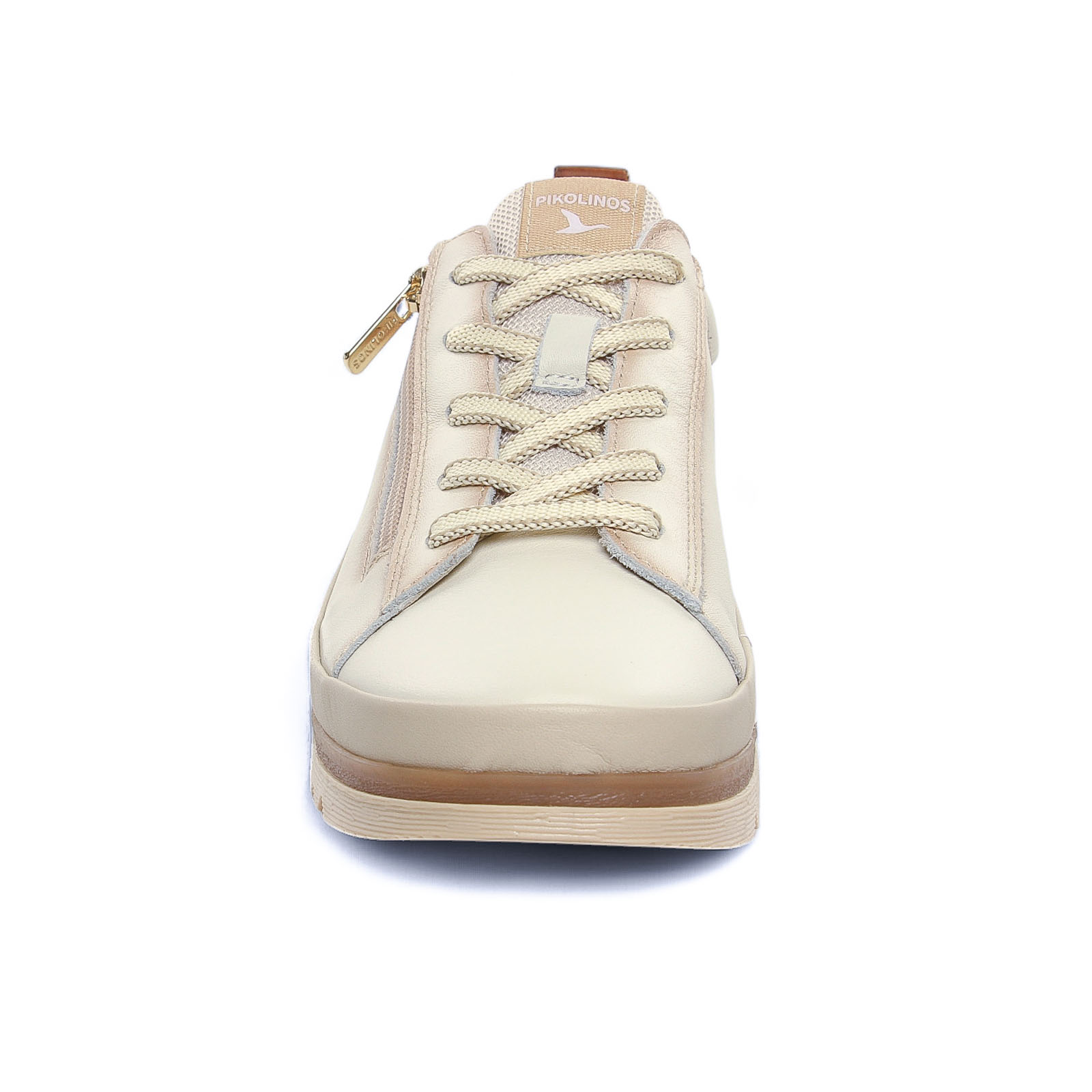 Baskets Fourrées de la marque Pikolinos de couleur blanc crème. Tennis en cuir avec lacets et fermeture éclair pour les chausser facilement, une première de propreté en cuir à mémoire de forme très confortable et amovible si besoin, une semelle gomme souple, une doublure textile, chaussures basses à lacets nommées Vigo disponibles en crème ou en cognac.