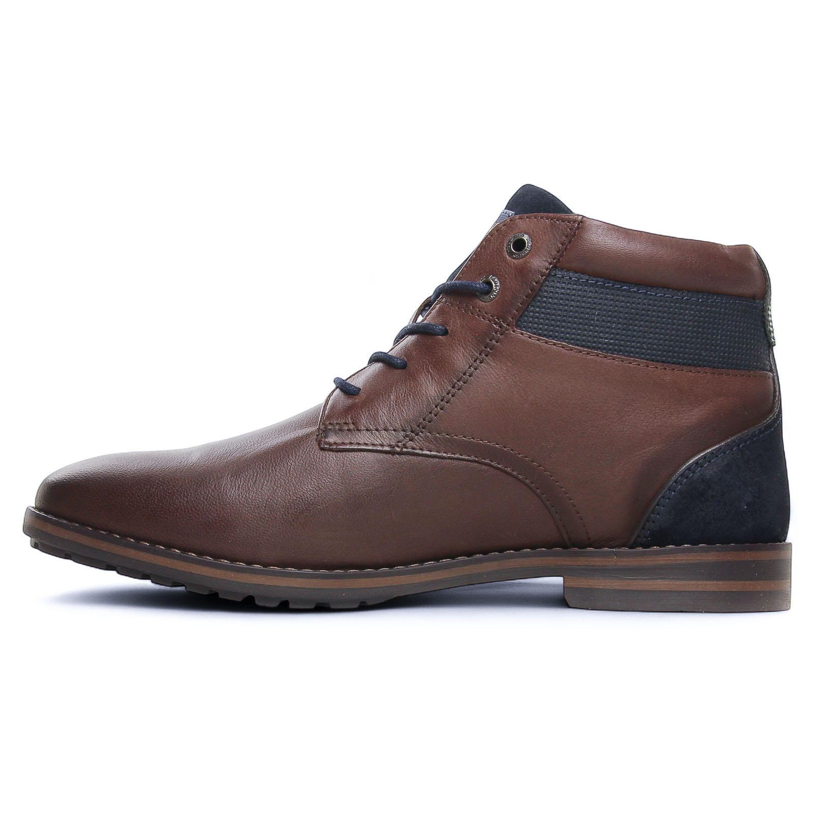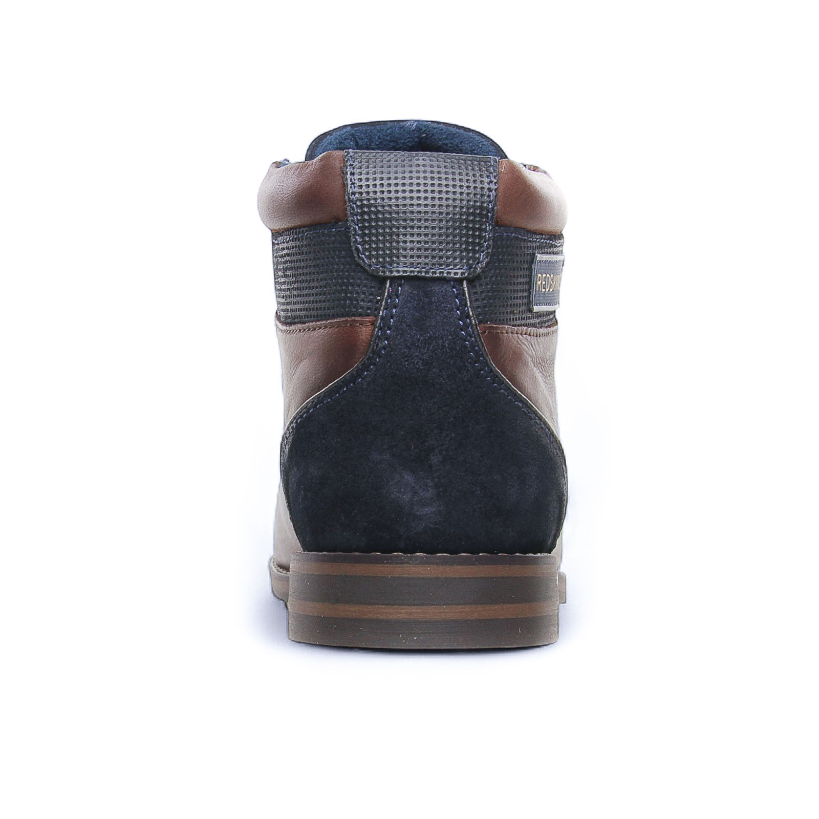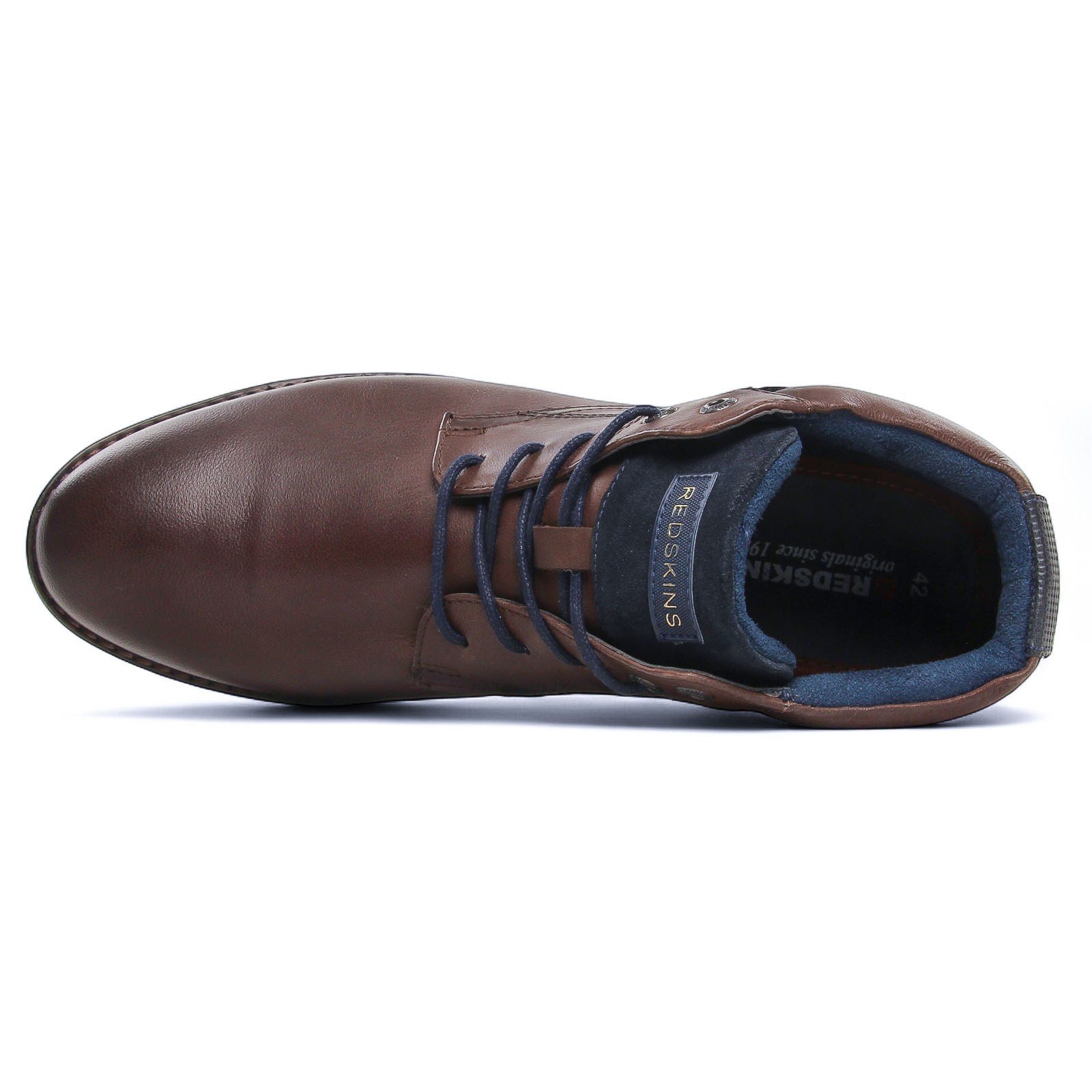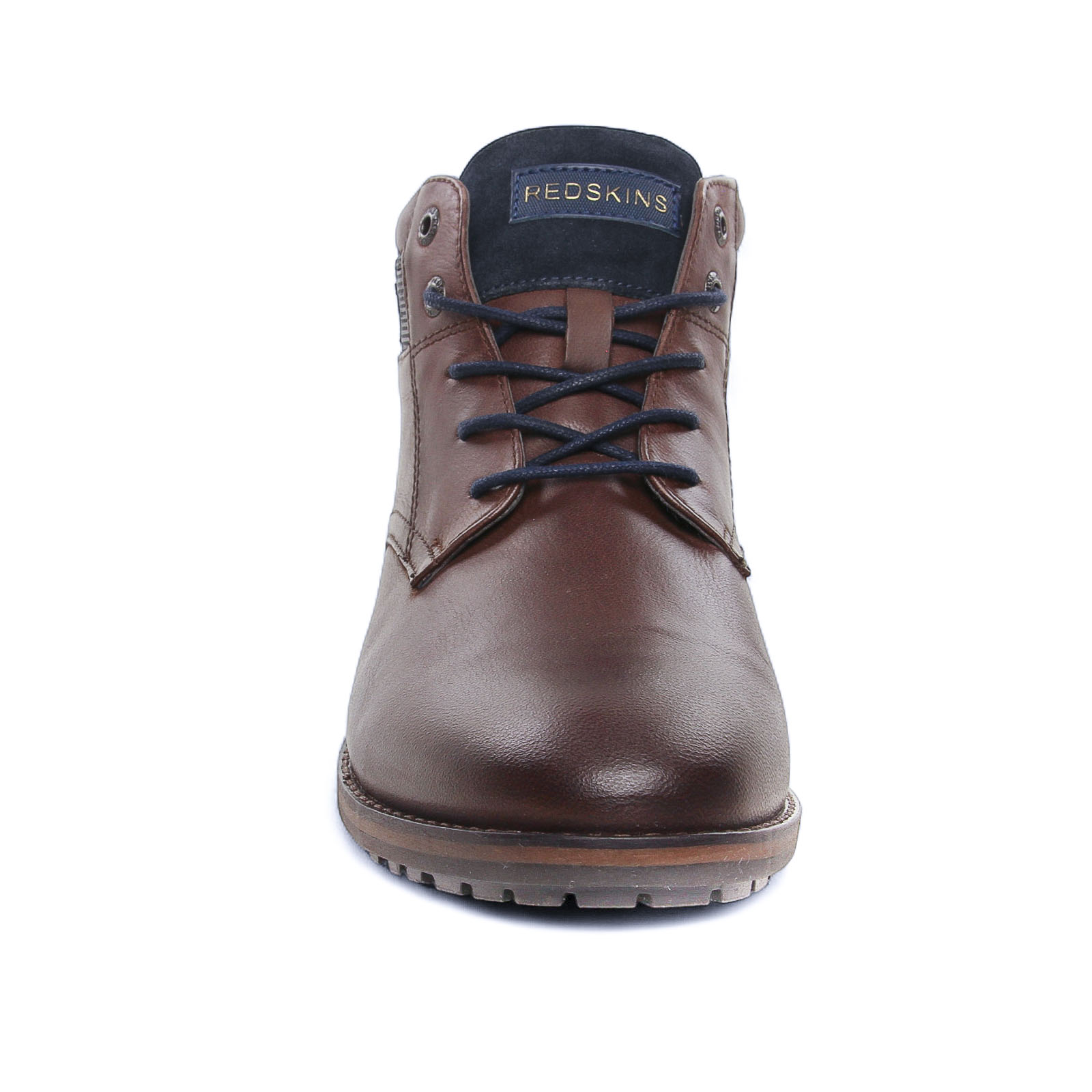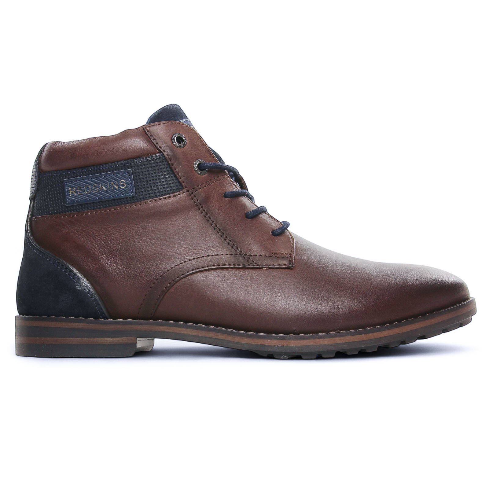 Chaussures Montantes de la marque Redskins de couleur marron marine. Chaussures montantes en cuir marron brun, une doublure textile et une première de propreté en cuir, une semelle souple en gomme élastomère confortable à la marche, le modèle Elec revient pour la nouvelle collection Redskins automne hiver.