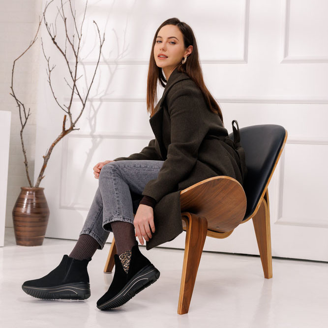 Boots Élastiquées de la marque Remonte de couleur noir leopard. Mix entre une baskets et une Chelsea, une construction moderne et originale par Remonte, une tige nubuck noir avec sa ganse élastiquée sur le coté aux motifs léopard, bottines zippées, doublure chaude et une première amovible Memosoft confortable, une semelle compensée d'une hauteur de 4,5cm au talon.