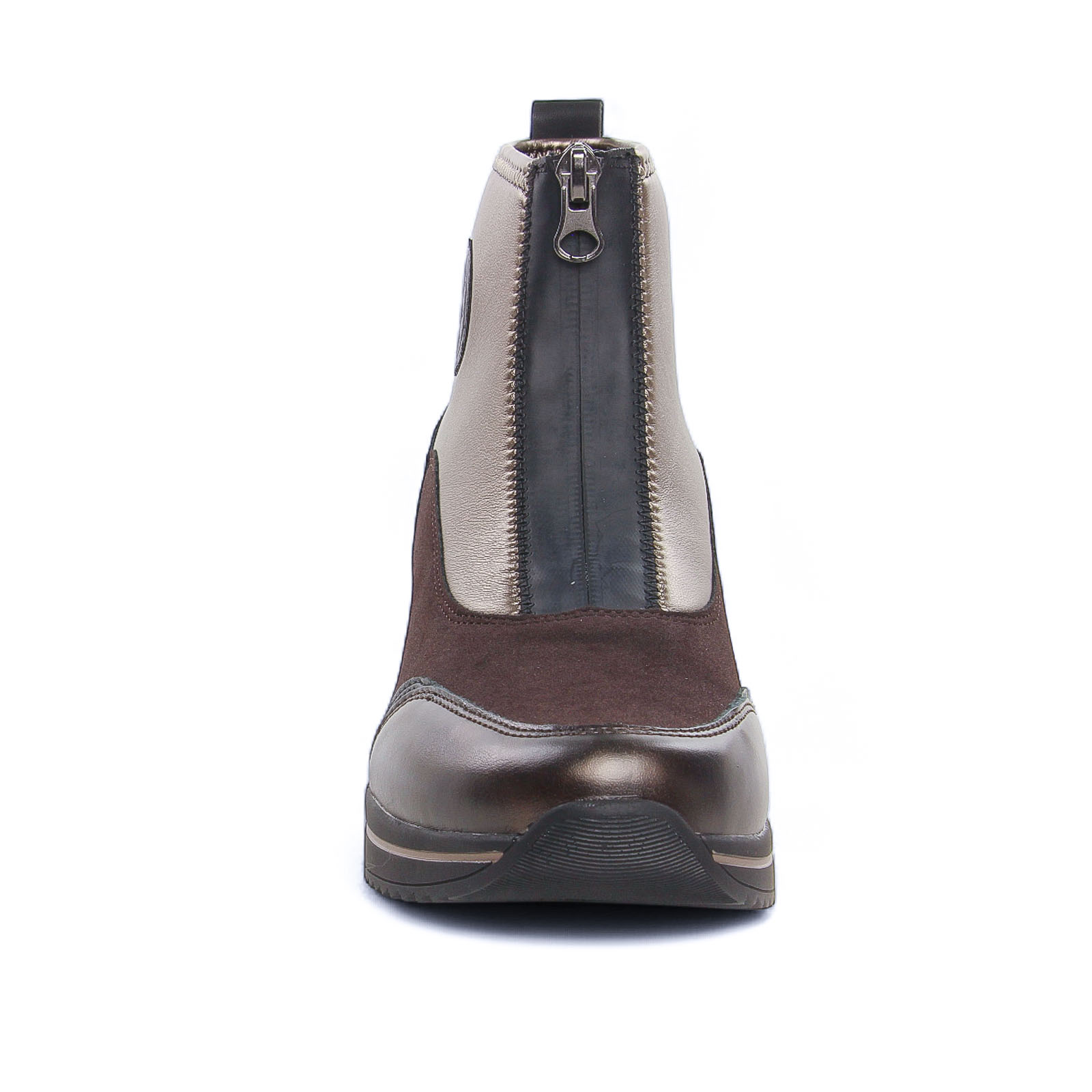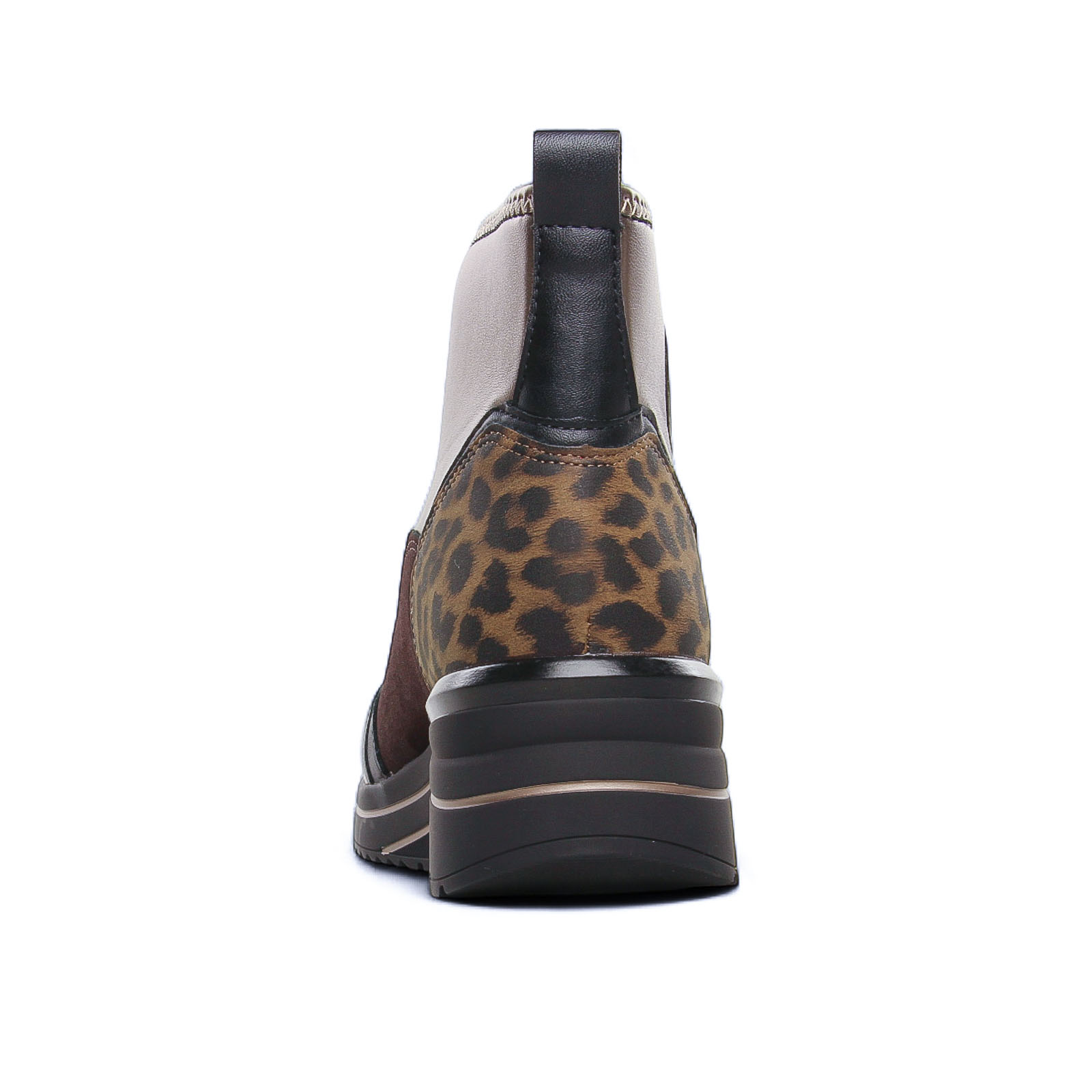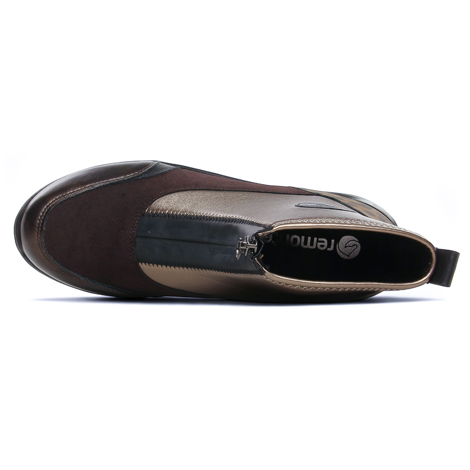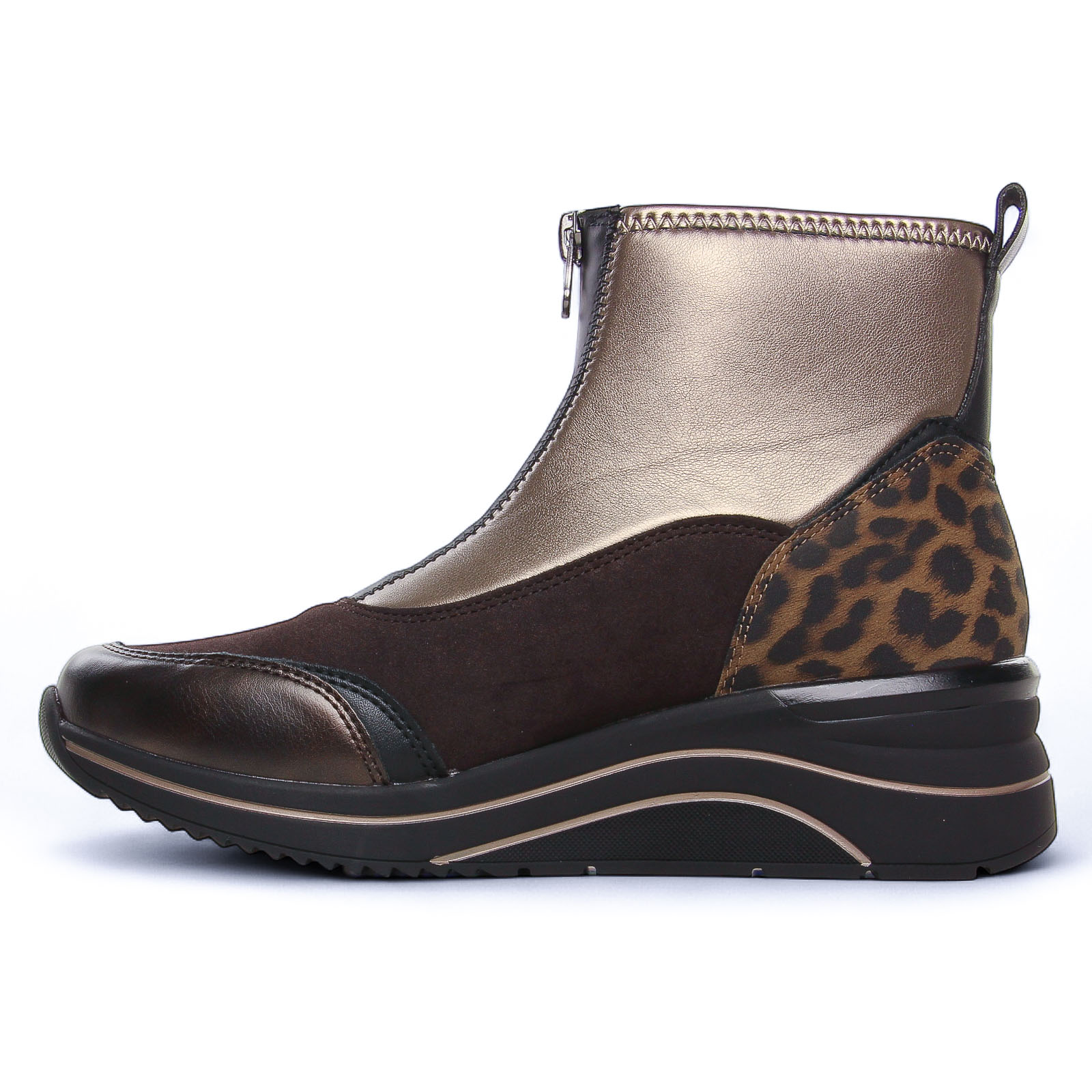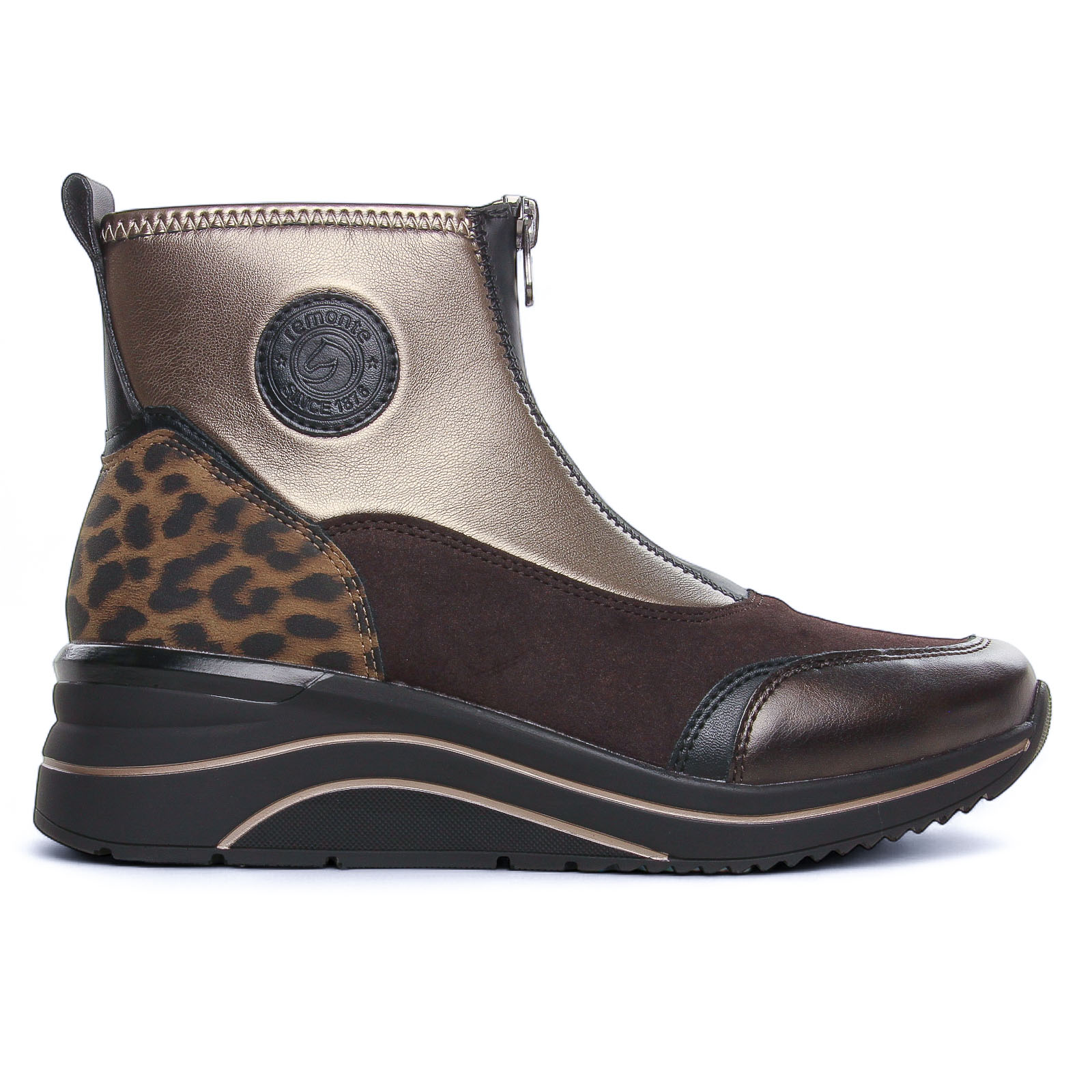 Baskets Compensees de la marque Remonte de couleur marron bronze. Baskets modernes et originales sans lacets, une tige en stretch, chaussures véganes, des teintes marron et bronze metalique et imprimés léopard, le zip sur le coup de pied, une première confort Memosoft et amovible si besoin, un talon compensé haut de 5 cm.