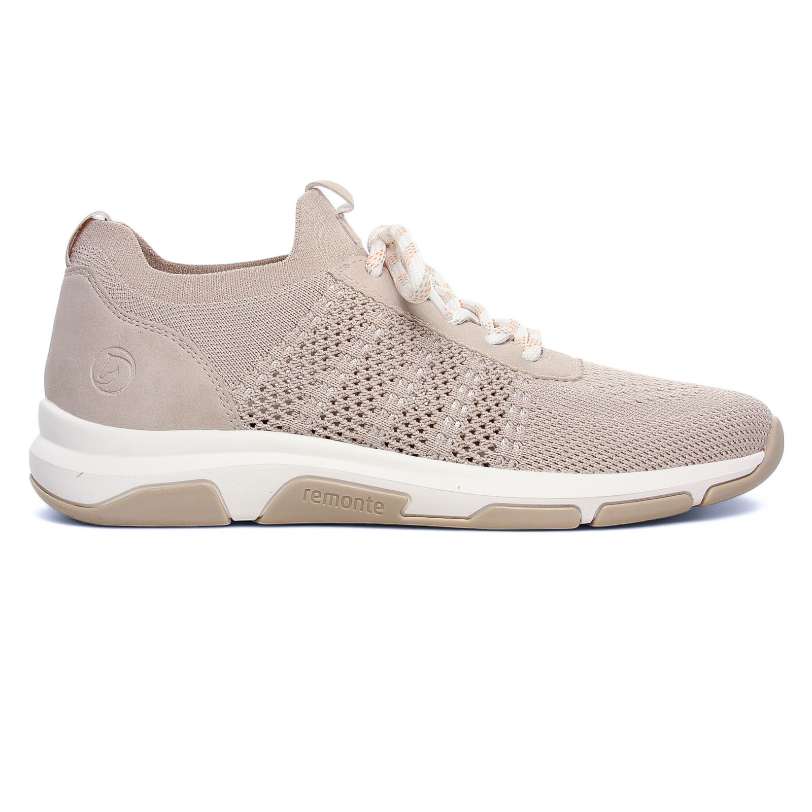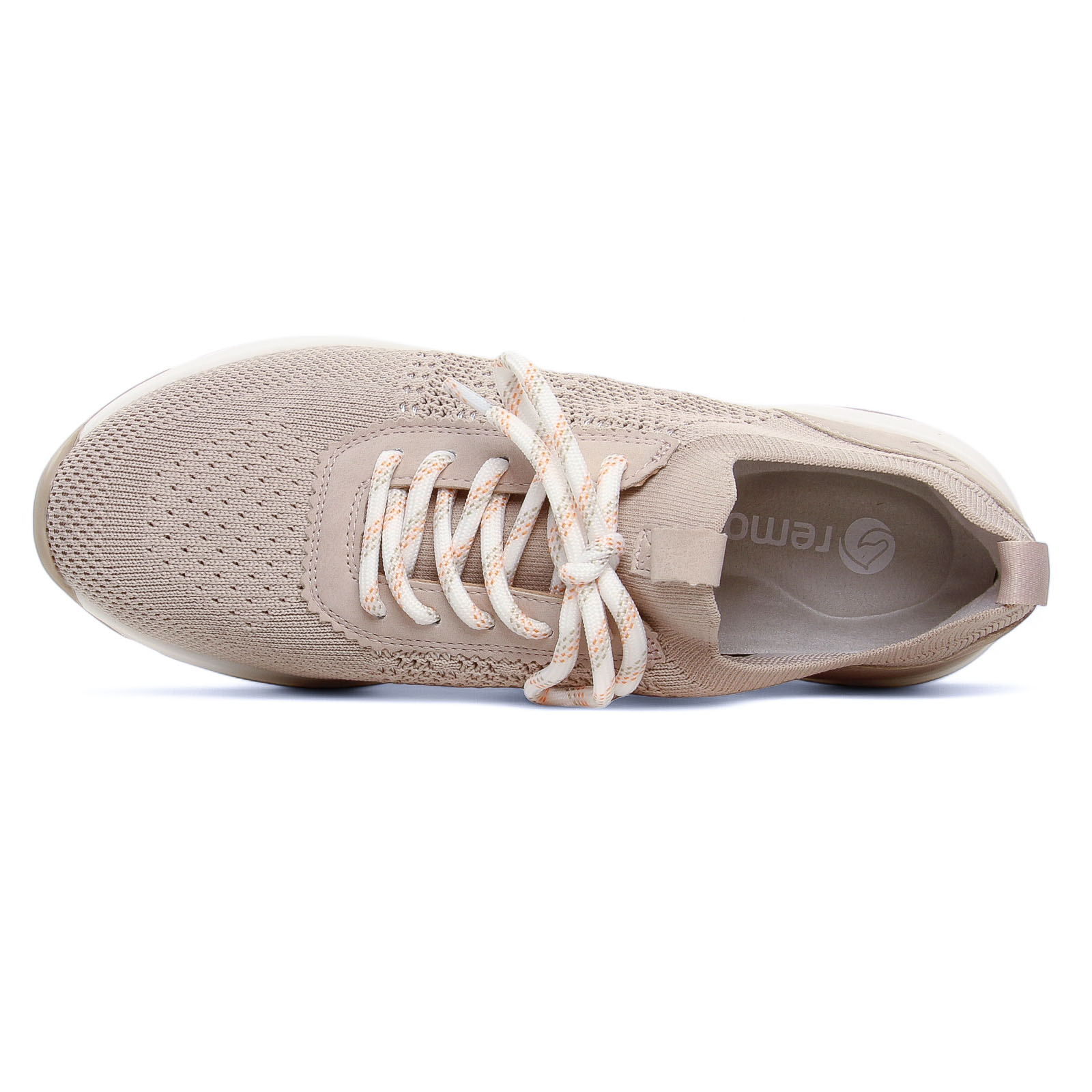 Baskets Mode de la marque Remonte de couleur gris rose. Sneakers en textile stretch disponibles en vert ou en light rose, tige aérée à lacets, un coussinet au talon, un enfilage facilité, une première amovible Soft à mémoire de forme avec la voute plantaire marquée, une première amovible si besoin.