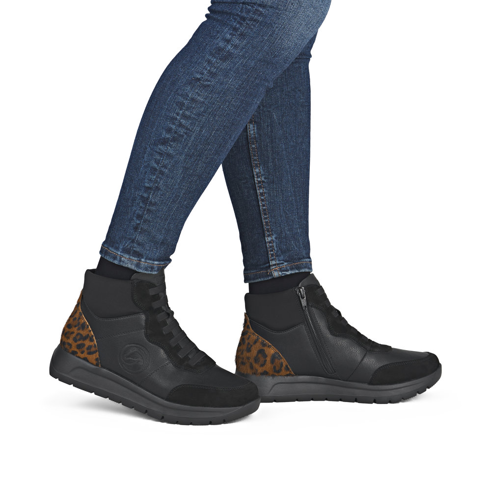 Baskets Fourrées de la marque Remonte de couleur noir leopard. Tennis montante avec une tige cuir couleur noir et un contrefort impression léopard, un elastique sur le coup de pied et un zip sur le coté pour les chausser rapidement, une première confortable Memosoft et amovible si besoin, l’intérieur doublé chaud, une semelle plateau de 3 cm de couleur noir.