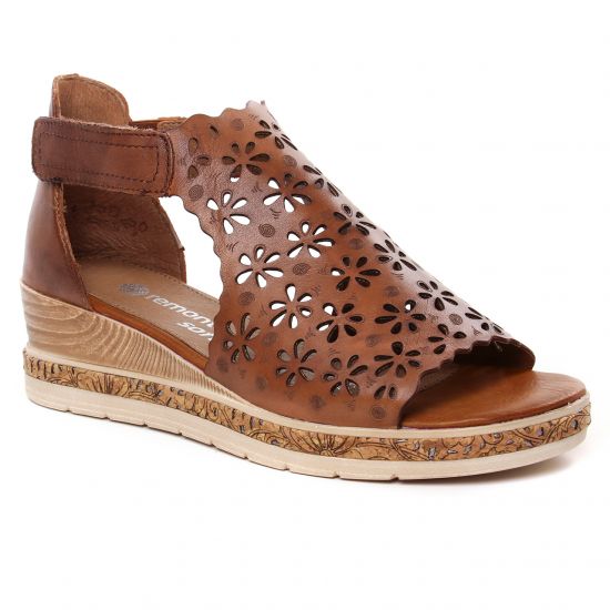 Nu-Pieds Compensés de la marque Remonte de couleur marron. Sandales cuir bohème chic, élégantes, une première cuir estampillée Soft synonyme de confort, une semelle compensée légère haute de 5 cm au talon, bride à scartch, tige ajourée par des motifs géométriques, nouvelle collection Remonte été 2022.