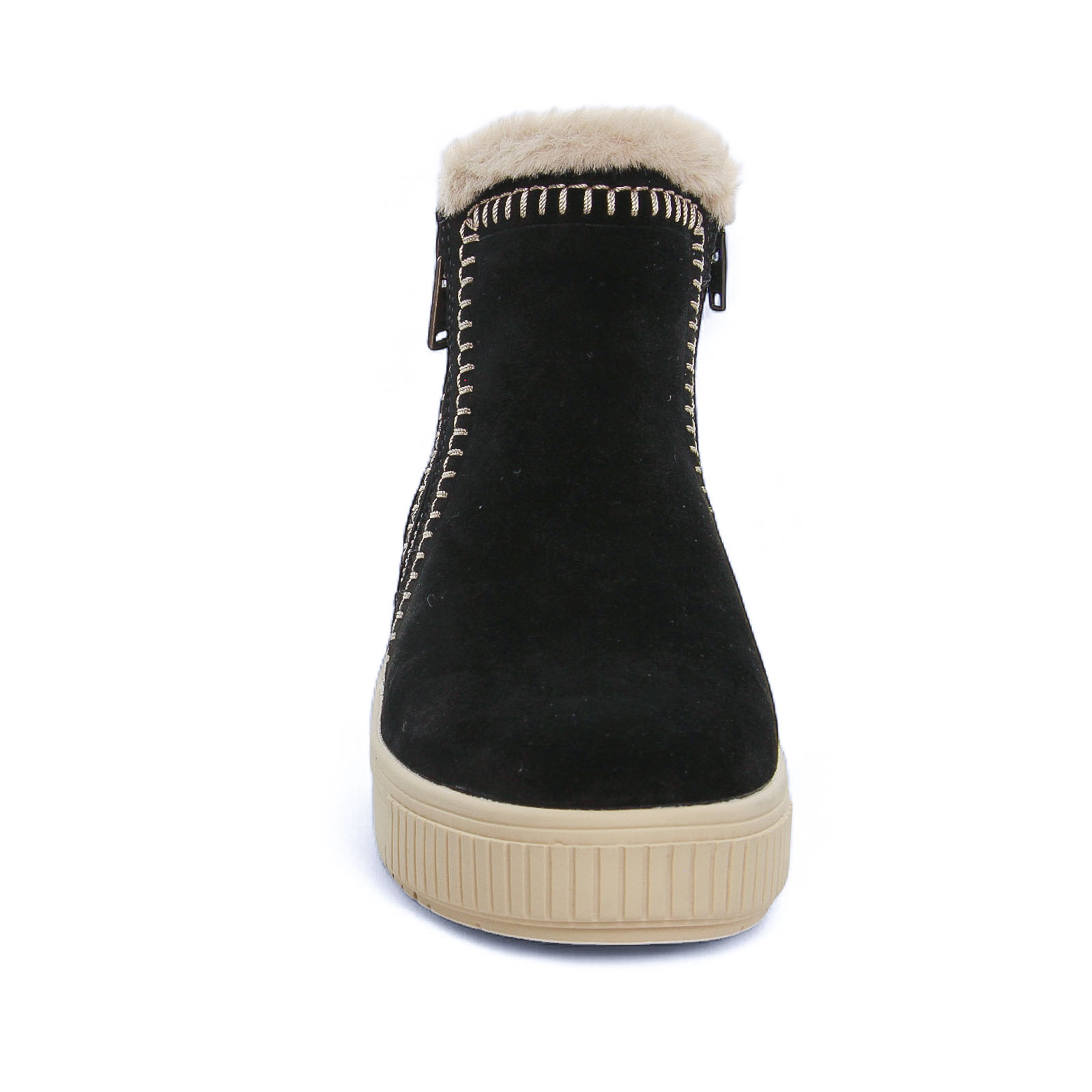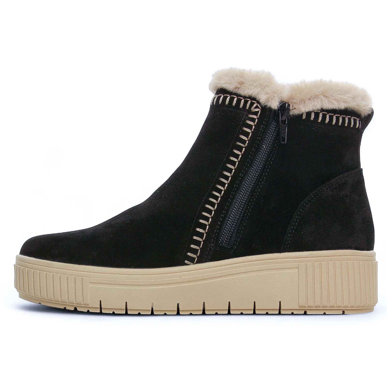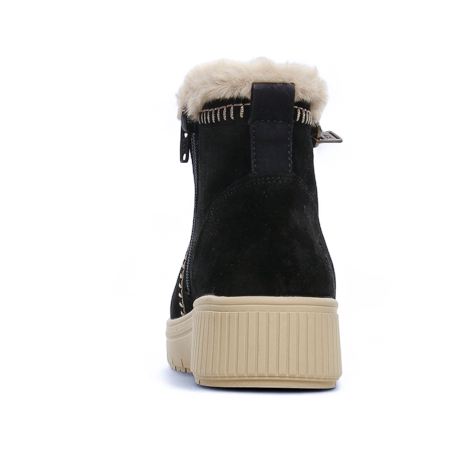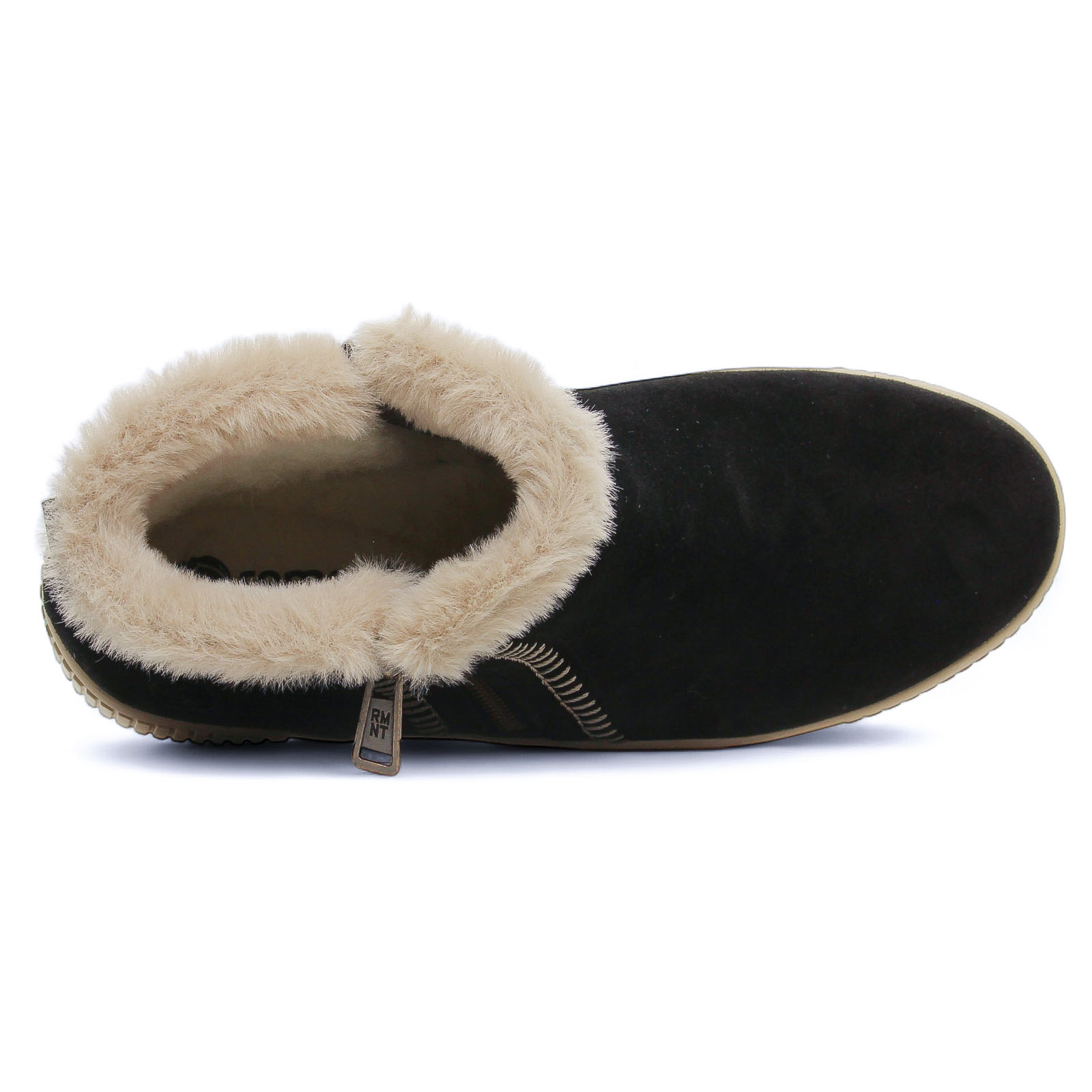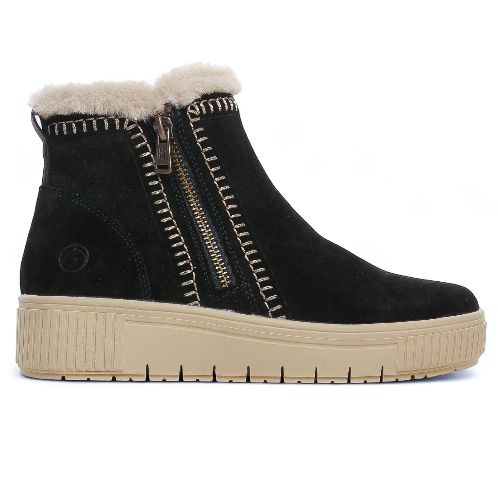 Bottines Cuir de la marque Remonte de couleur noir. Boots sportswear avec une tige en cuir nubuck noir avec une double fermeture éclair, des coutures en originales en zigzag sur le coté, une doublure intérieure en laine vierge beige, fourrure apparente en haut de la tige, une première et une doublure fourrées chaudes, une semelle compensée haute de 4 cm et un plateau 3 cm, une première amovible si besoin.