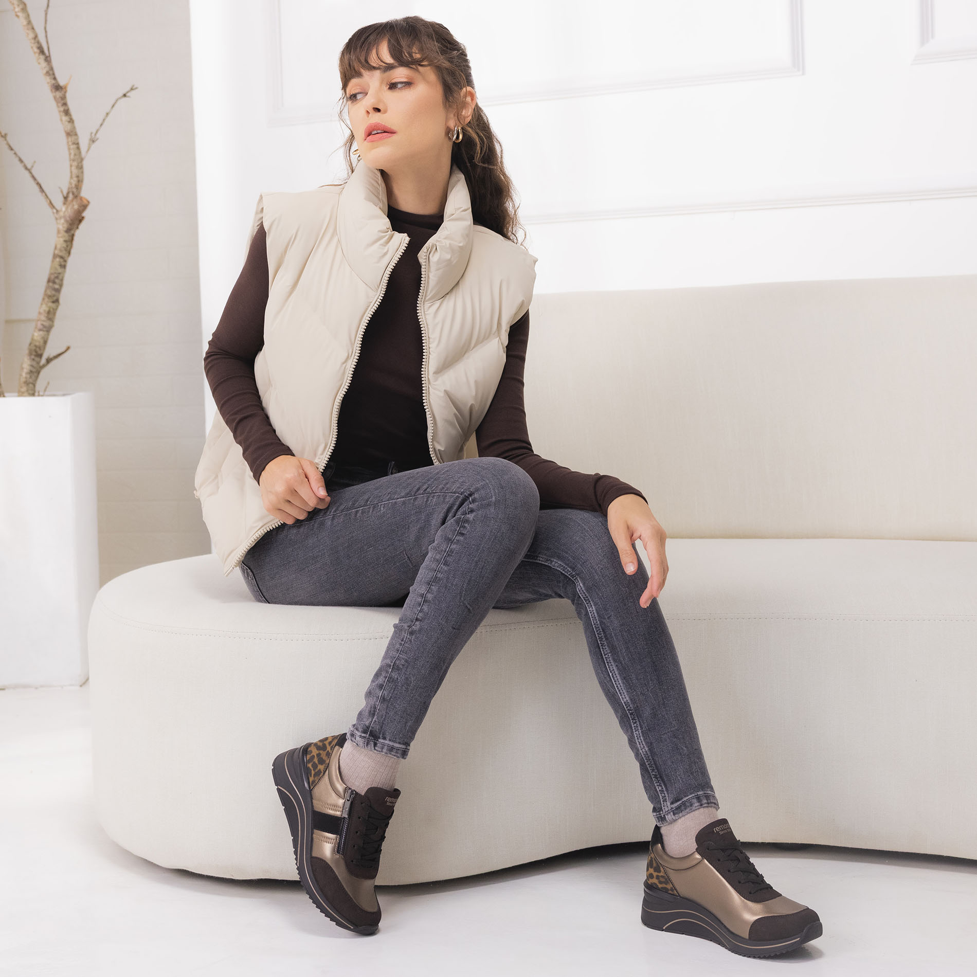 Baskets Compensees de la marque Remonte de couleur marron bronze. Sneakers très légères vernis noir et stretch, faciles à chausser grace à sa fermeture éclair, une première de prompreté amovible matelassée, une touche de glamour avec son insert léopard et ses textures métal !