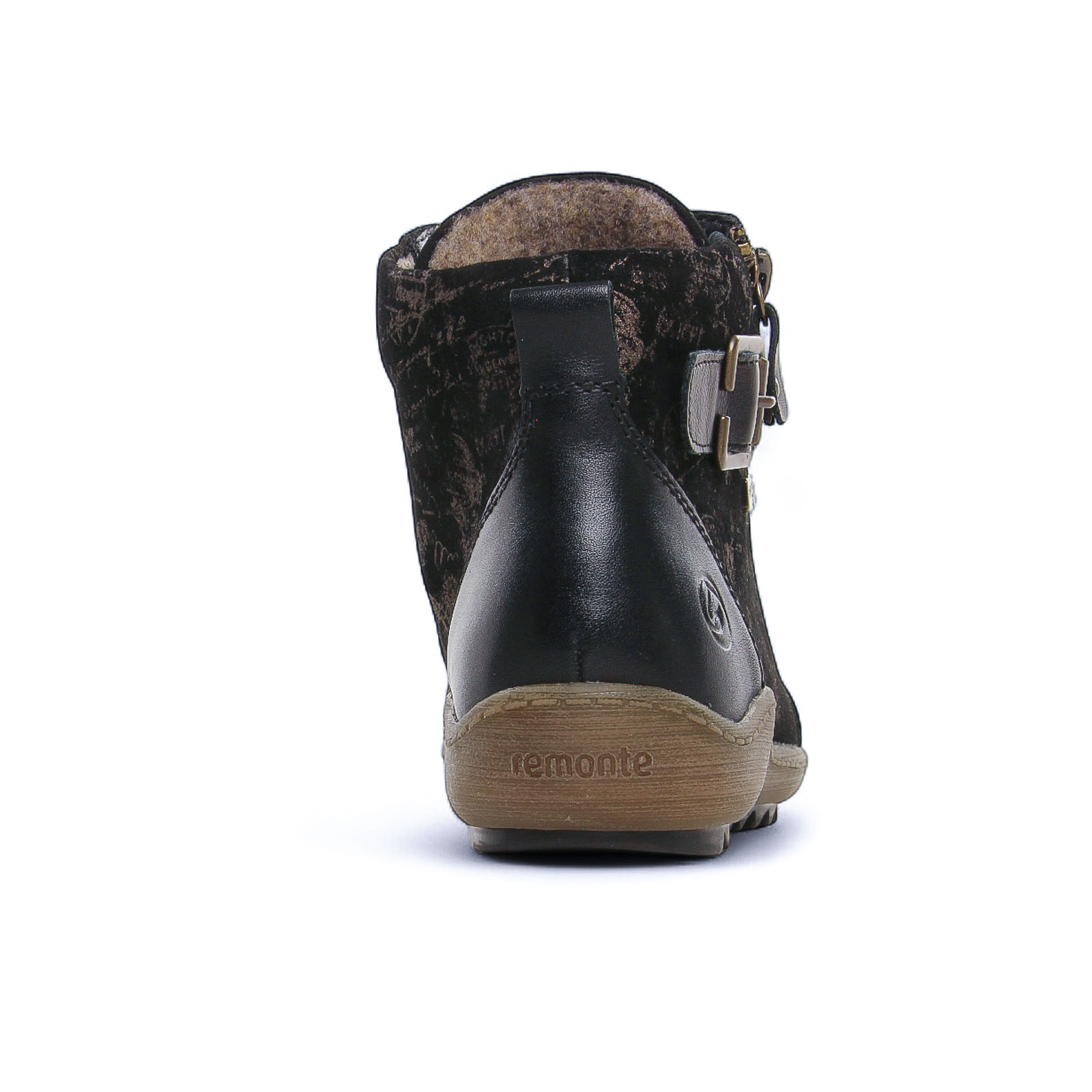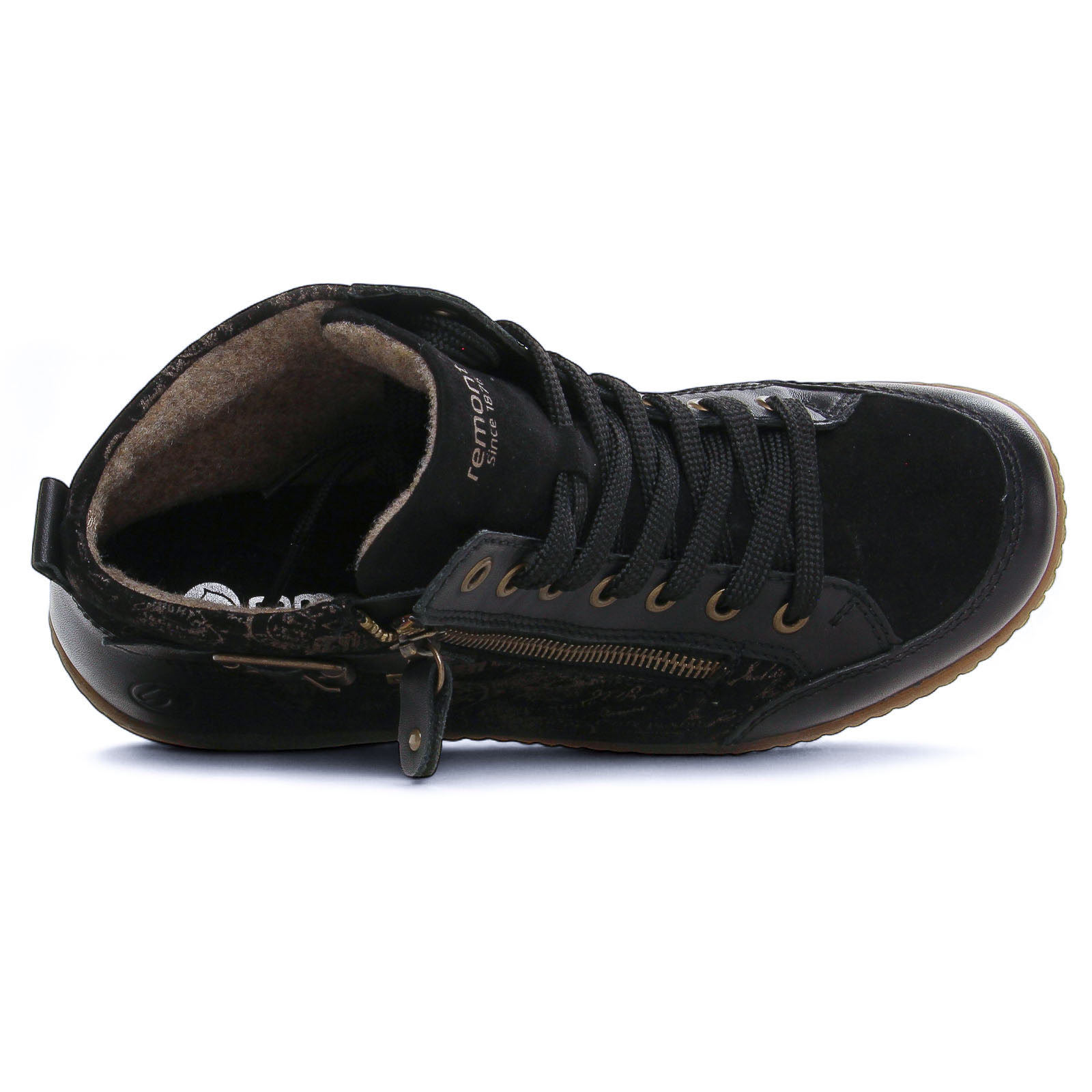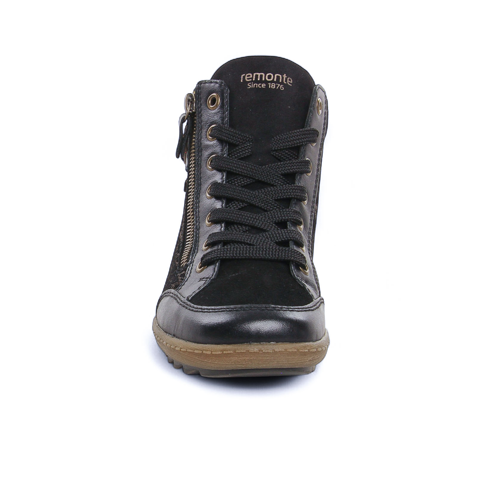 Baskets Cuir de la marque Remonte de couleur noir bronze. Chaussures montantes avec une tige courte, une tige en cuir couleur noir et motifs bronze, un zip large et doré glam sur le coté extérieur, une première à mémoire de forme Memosoft amovible, doublure chaude, chaussures chics et confortables signées Remonte.