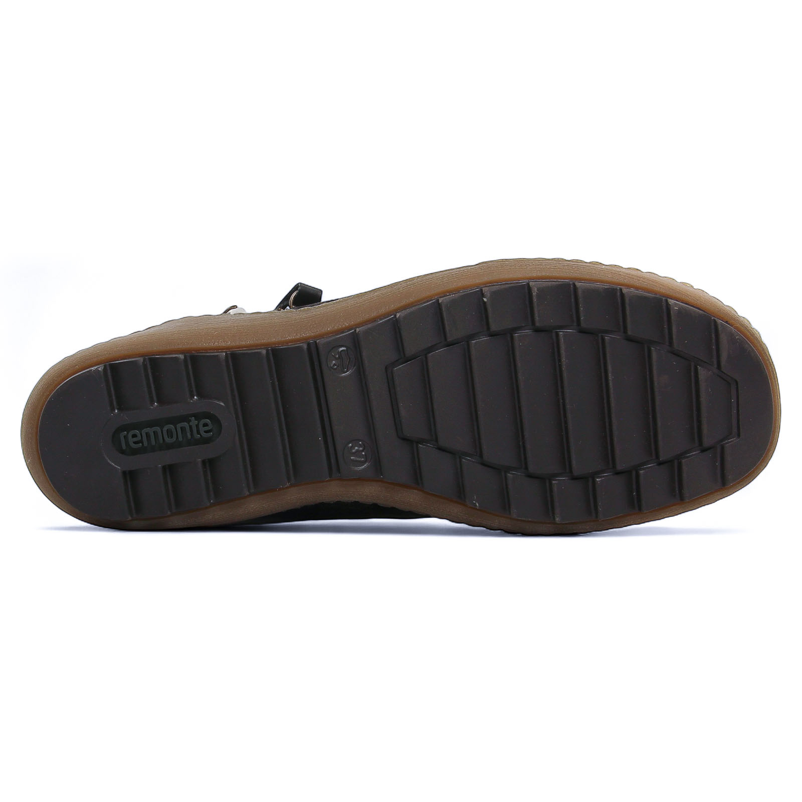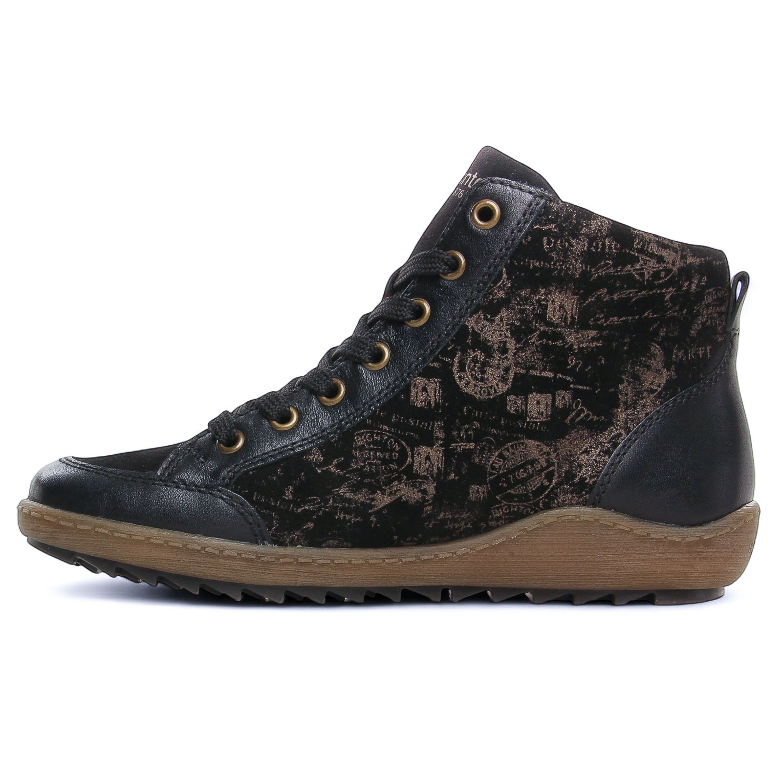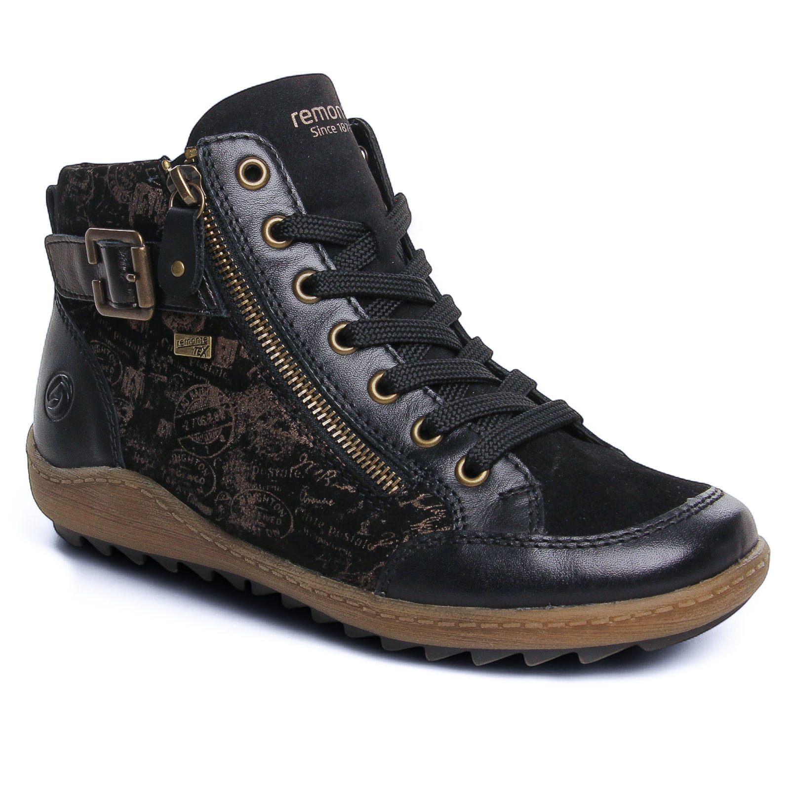 Baskets Cuir de la marque Remonte de couleur noir bronze. Chaussures montantes avec une tige courte, une tige en cuir couleur noir et motifs bronze, un zip large et doré glam sur le coté extérieur, une première à mémoire de forme Memosoft amovible, doublure chaude, chaussures chics et confortables signées Remonte.