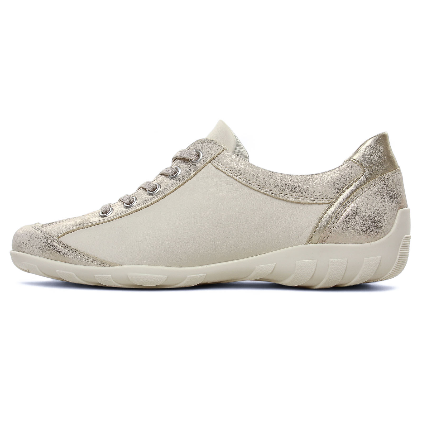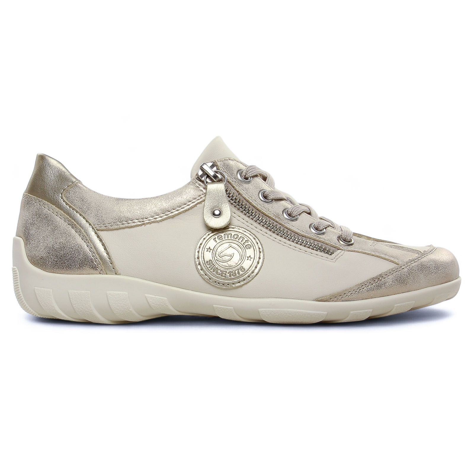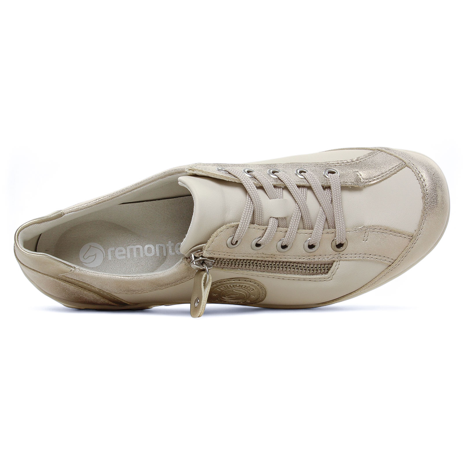 Tennis de la marque Remonte de couleur beige or. Tennis avec un dessus similicuir, baskets légère beige dorées, tige avec lacets et zip pour une chausse aisée, semelle souple débordante à l'arrière et anti-dérapante, première Memosoft hyper confortable !