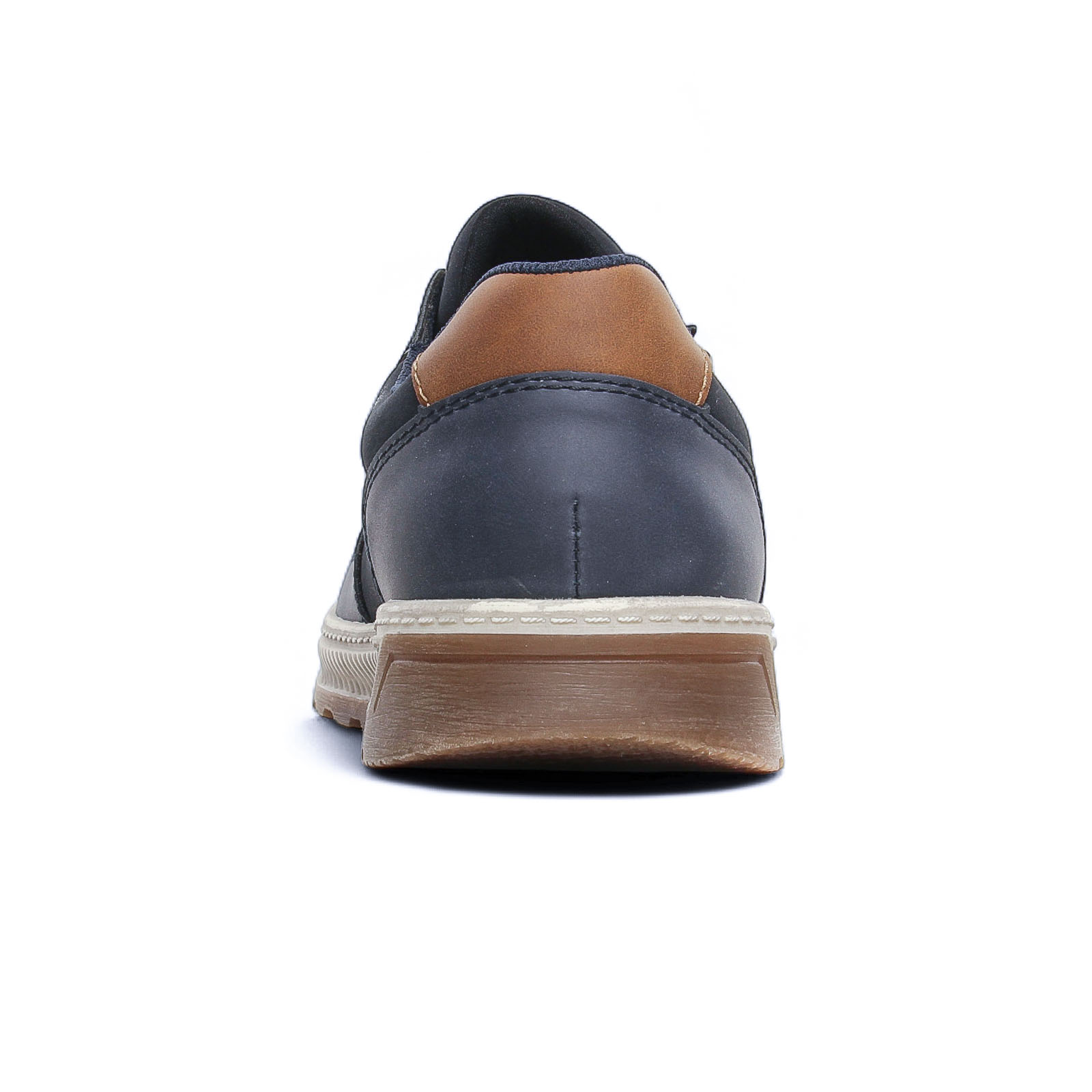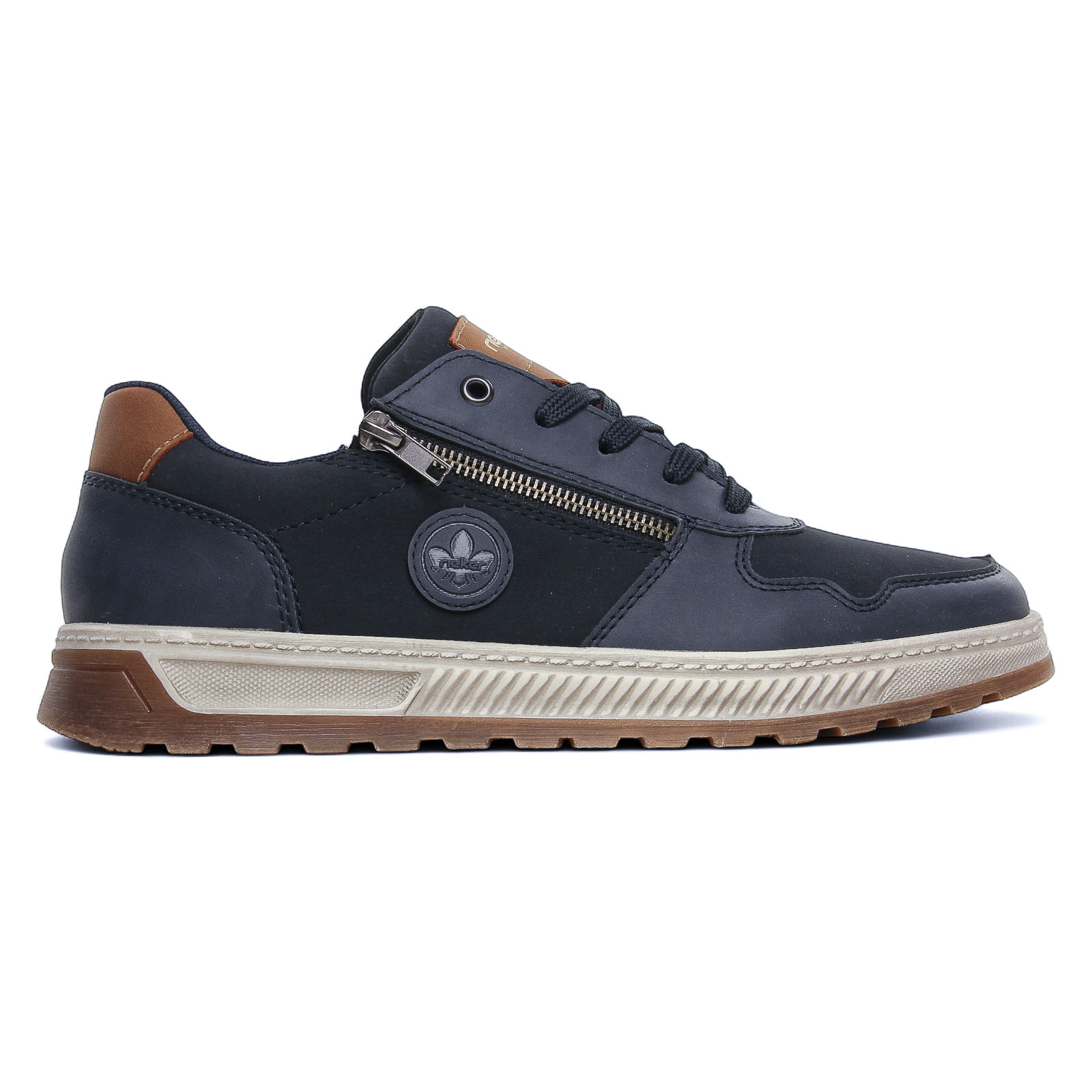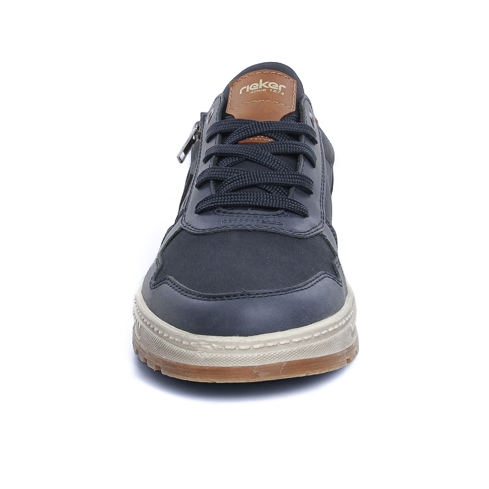 Tennis de la marque Rieker de couleur bleu marine. Chaussures confortable, parfaites pour un style décontracté avec du style, tennis en cuir et simili avec un zip pour les chausser facilement, une première confort, une semelle souple et résistante, existe en bleu marine ou en marron cognac.