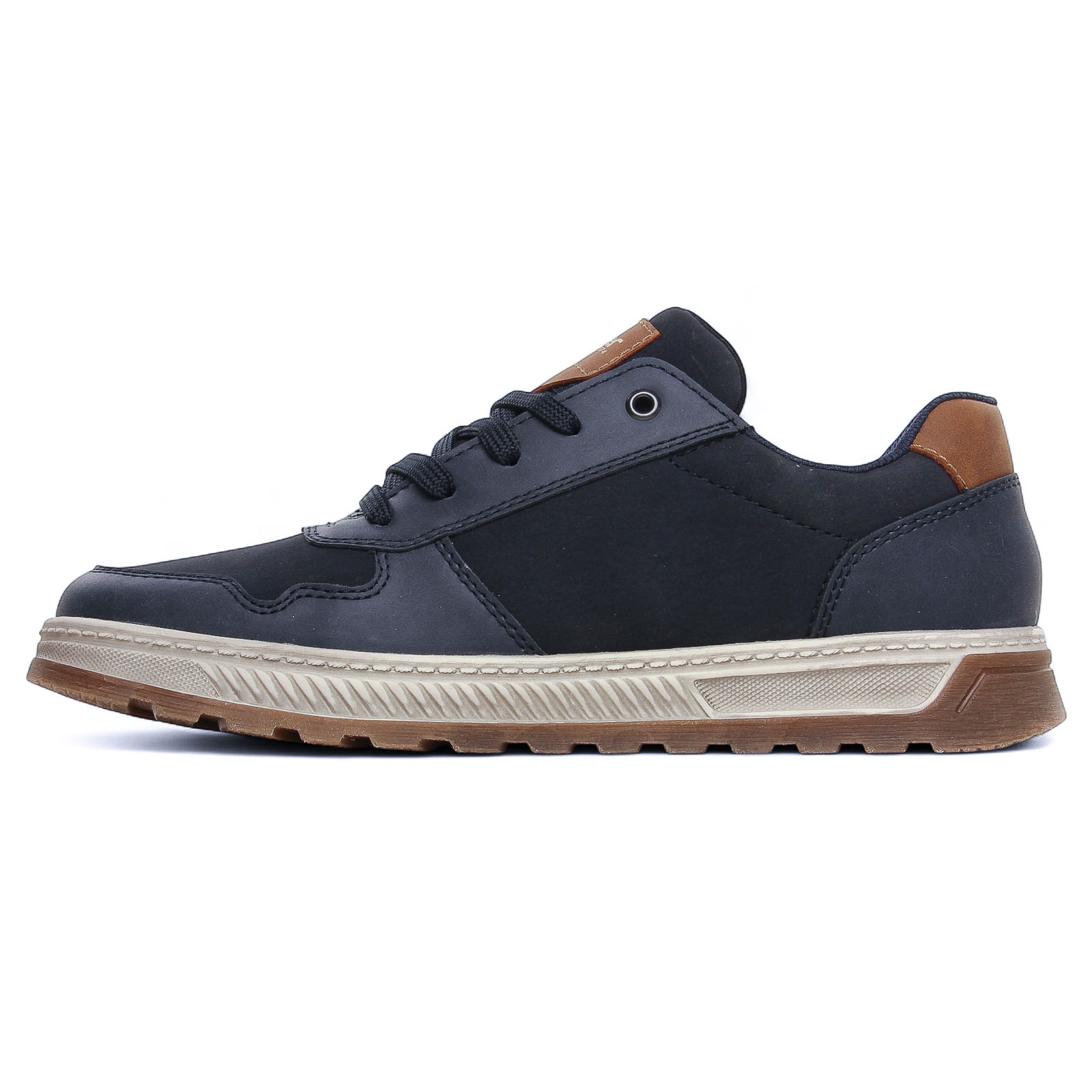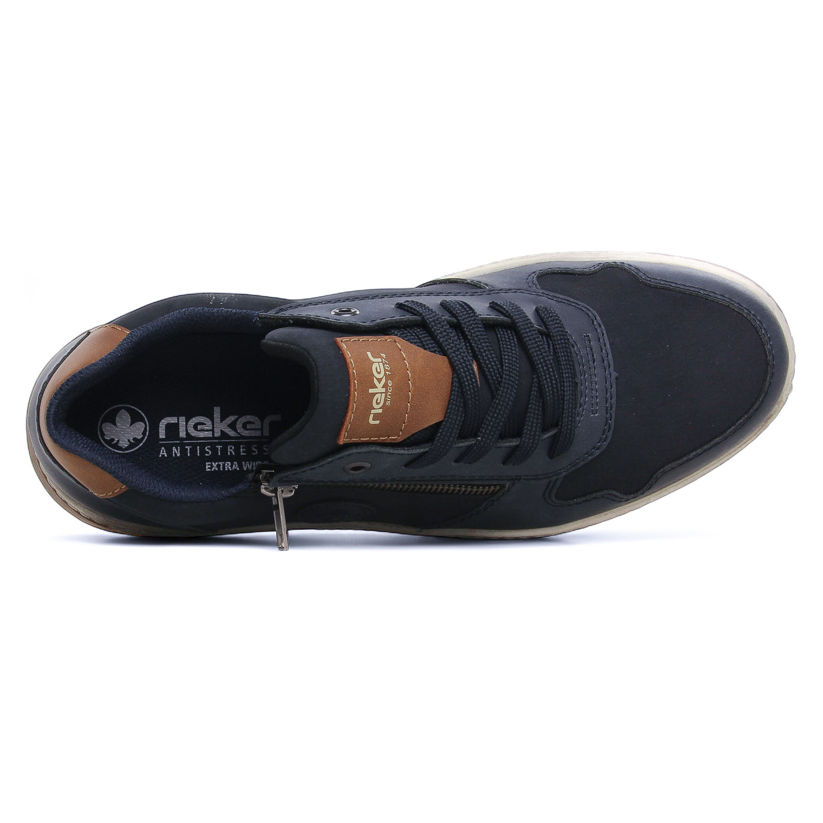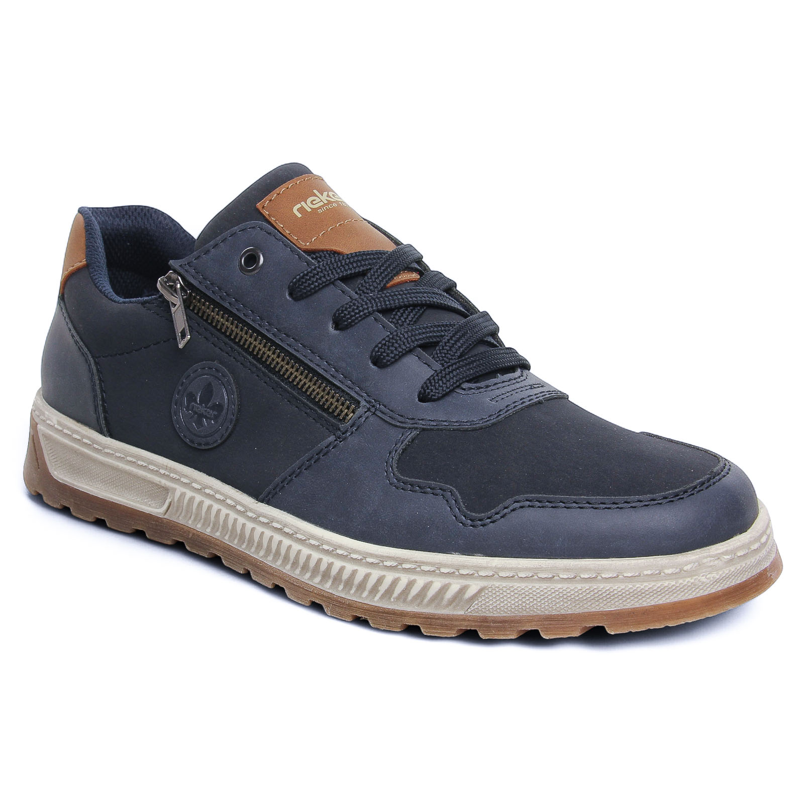 Tennis de la marque Rieker de couleur bleu marine. Chaussures confortable, parfaites pour un style décontracté avec du style, tennis en cuir et simili avec un zip pour les chausser facilement, une première confort, une semelle souple et résistante, existe en bleu marine ou en marron cognac.