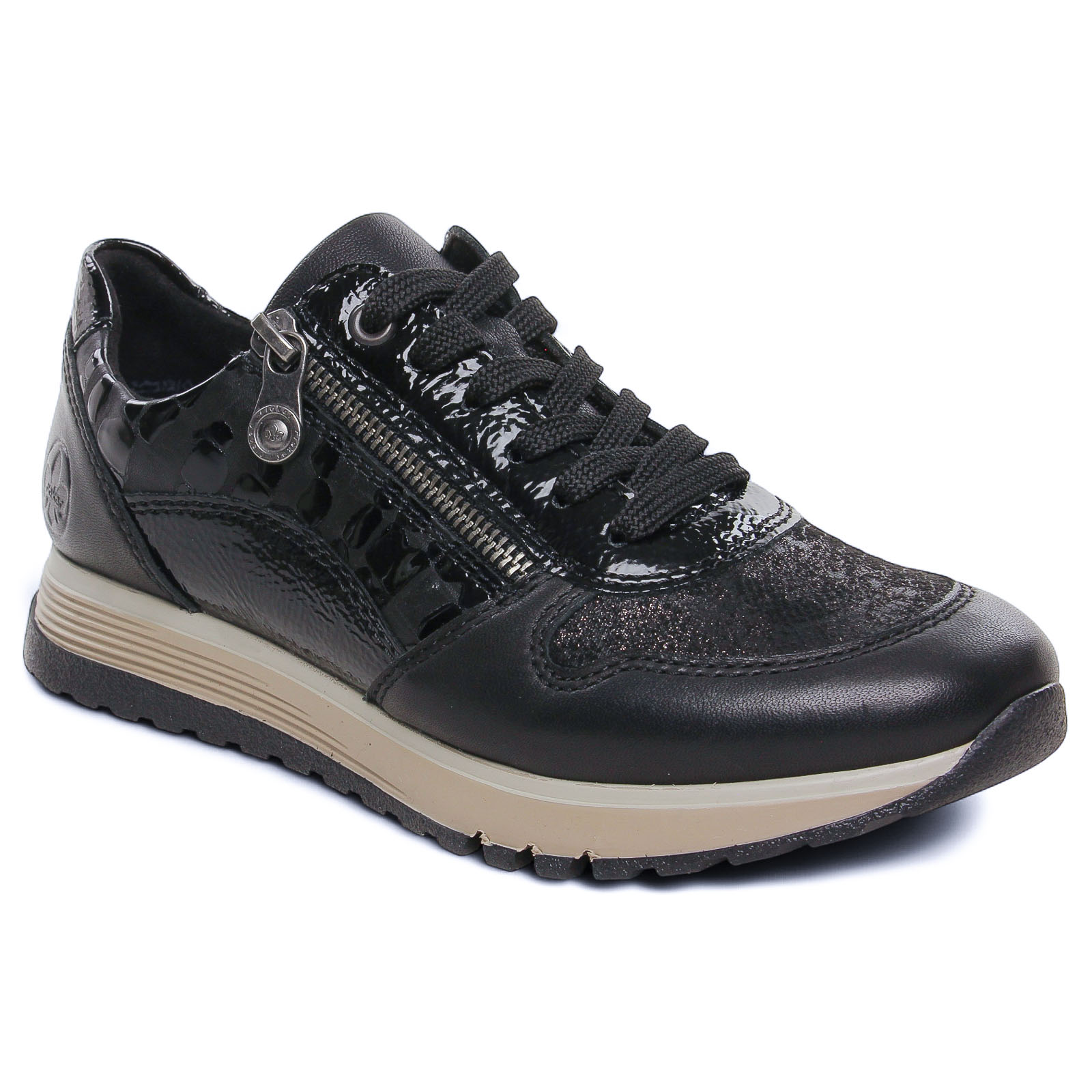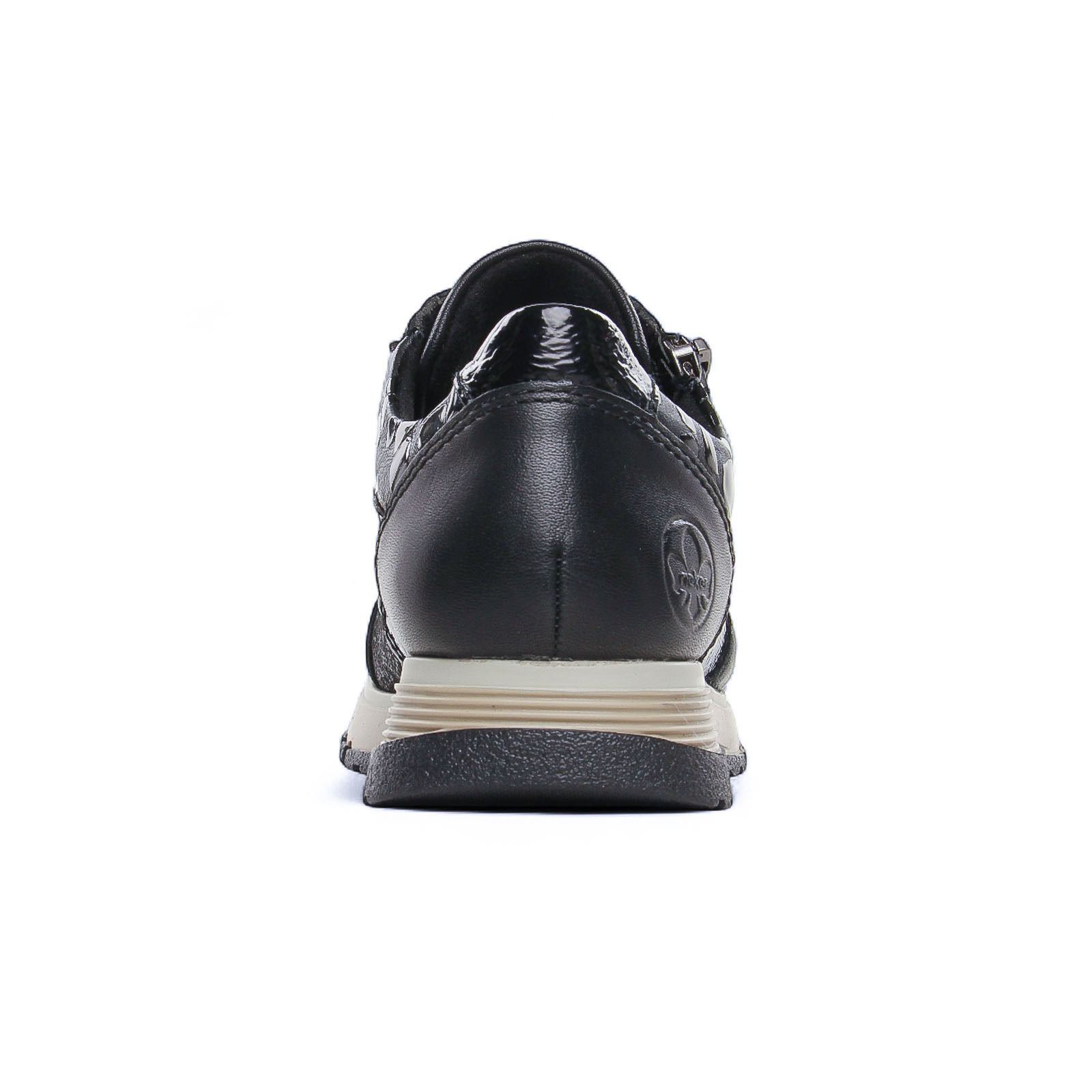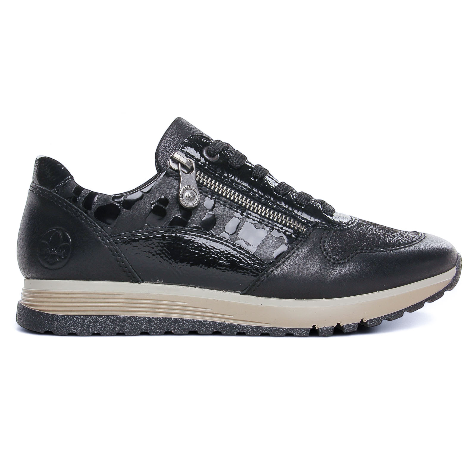 Baskets Plates de la marque Rieker de couleur noir. Un concentré de confort de de style distillé par Rieker, baskets tendances mélangeant les textures de cuir, de simili et d'empiècement vernis, un zip sur le coté du coup de pied pour les enfiler rapidement, une première de propreté amovible, baskets nouvelle collection automne nouvelle collection Rieker.