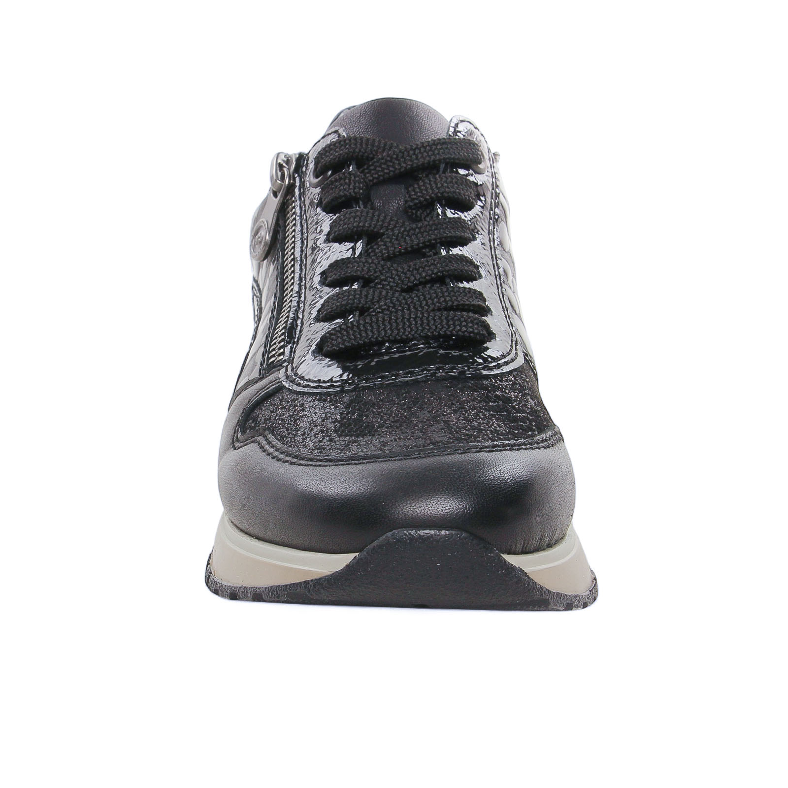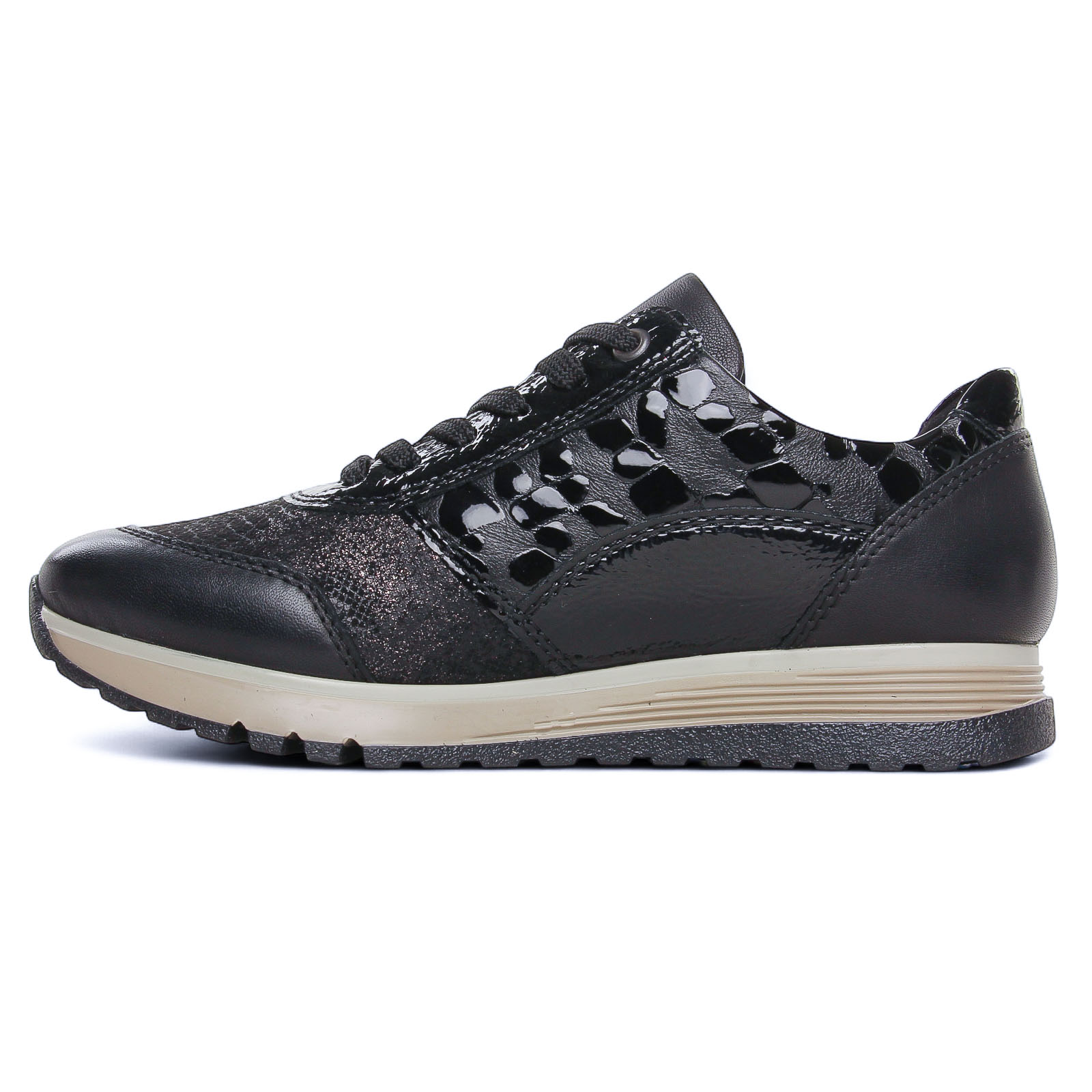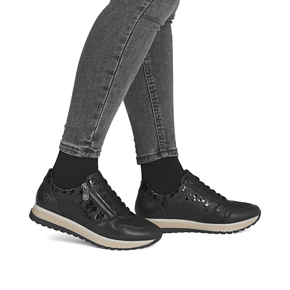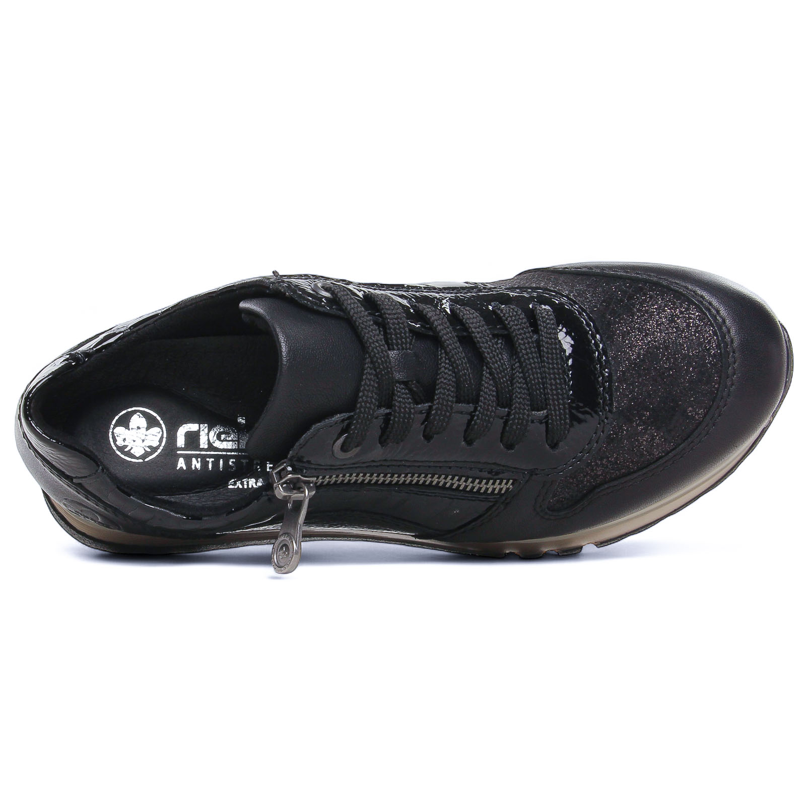 Baskets Plates de la marque Rieker de couleur noir. Un concentré de confort de de style distillé par Rieker, baskets tendances mélangeant les textures de cuir, de simili et d'empiècement vernis, un zip sur le coté du coup de pied pour les enfiler rapidement, une première de propreté amovible, baskets nouvelle collection automne nouvelle collection Rieker.