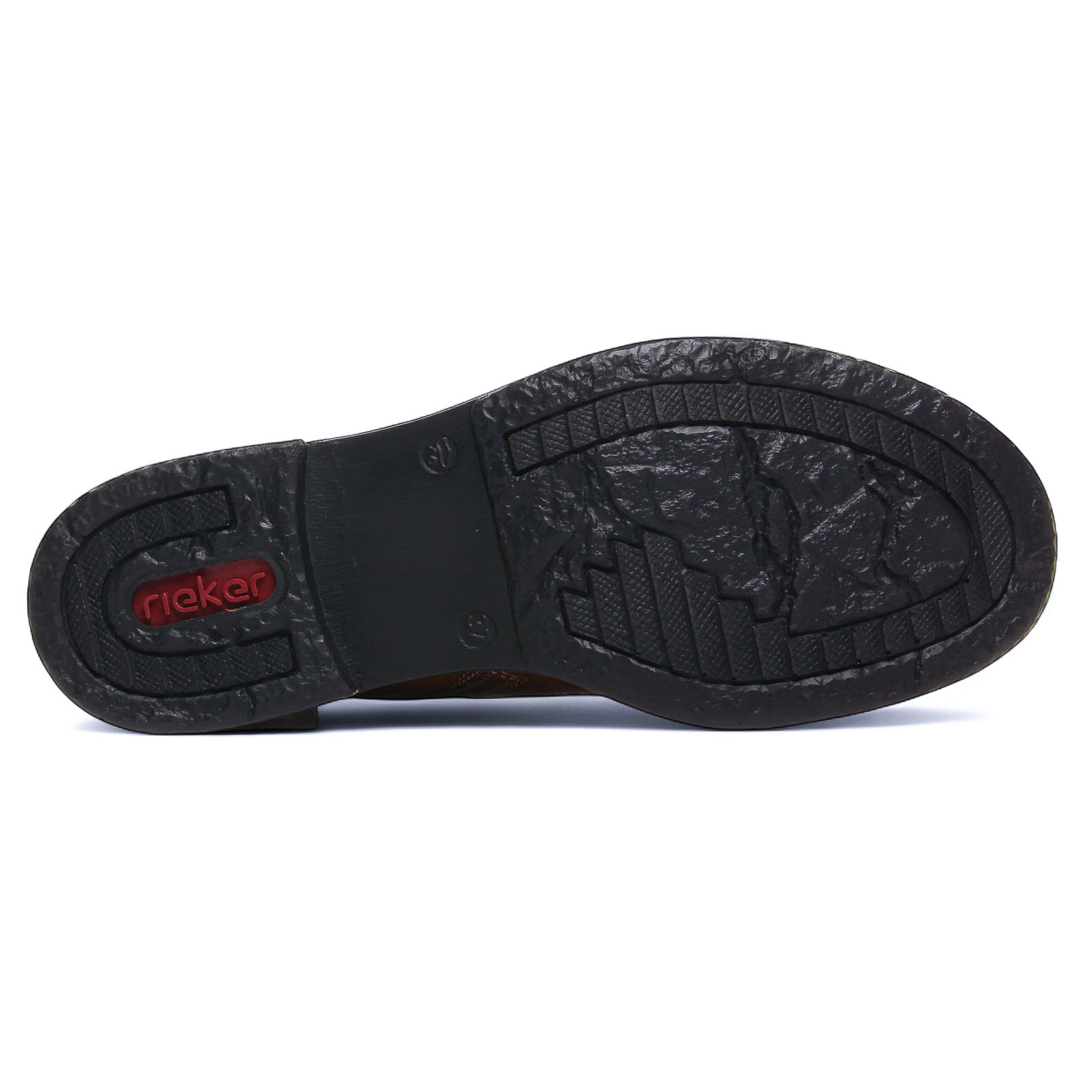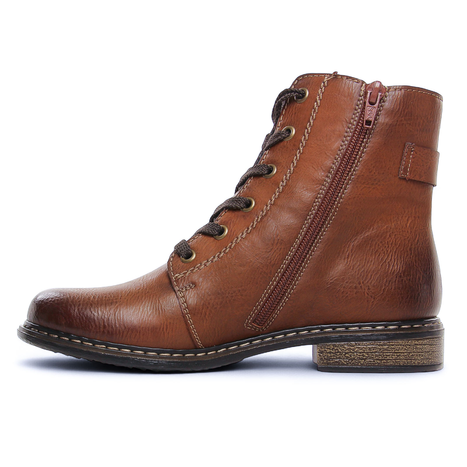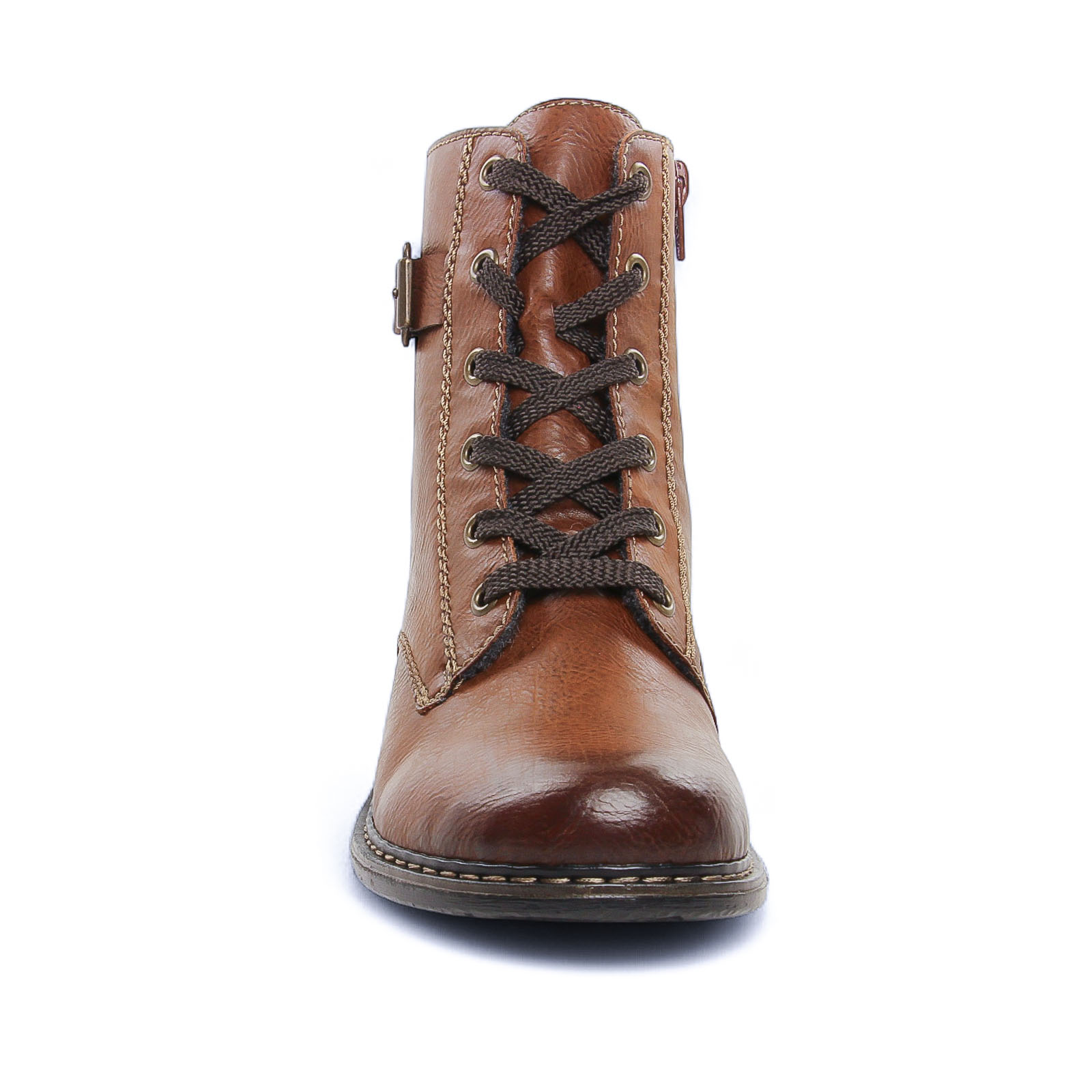 Bottines À Lacets de la marque Rieker de couleur marron. Une tige en simili cuir marron cognac, une doublure textile chaude parfaite pour cet hiver, bottines à lacets fourrées pourvues d'une glissière pour les enfiler facilement, semelle en gomme élastomère souple et confortables à la marche.