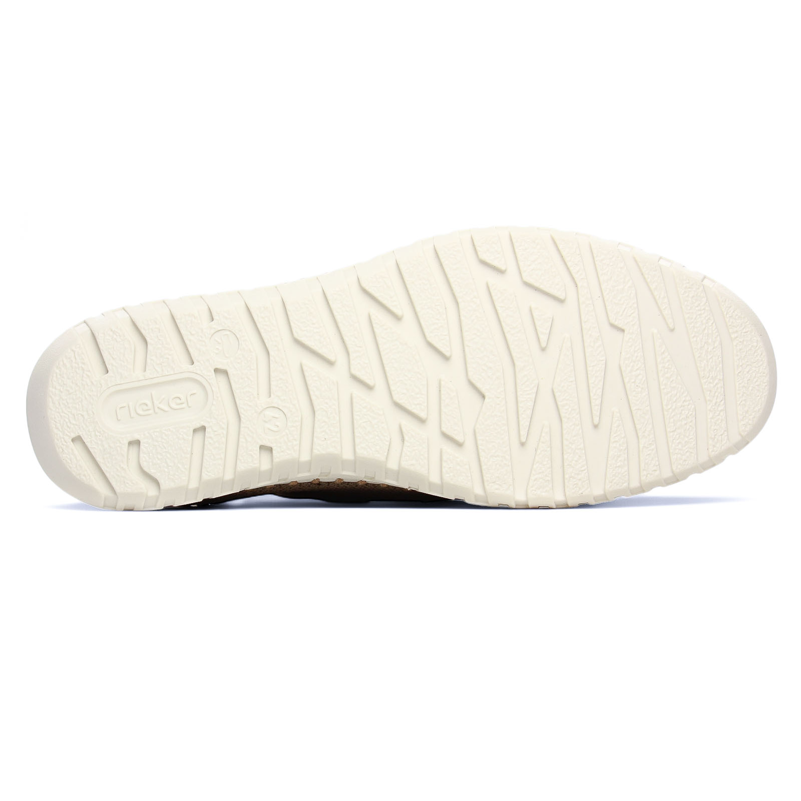 Derbies de la marque Rieker de couleur beige taupe. Derby d'été avec une tige en simili cuir perforé, une première cuir avec une semelle sportswear blanche très souple, chaussures très légères et très confortables signés Rieker homme.