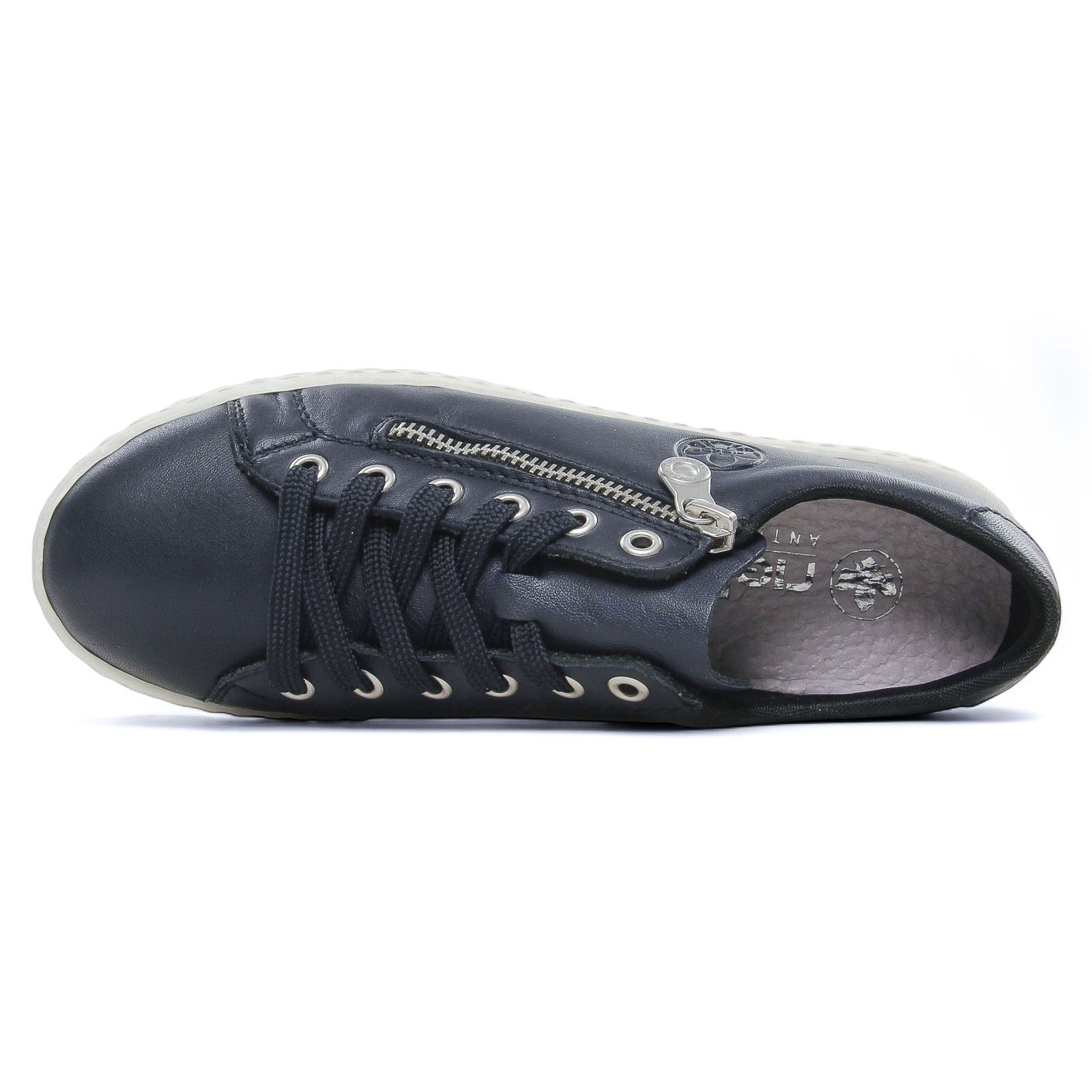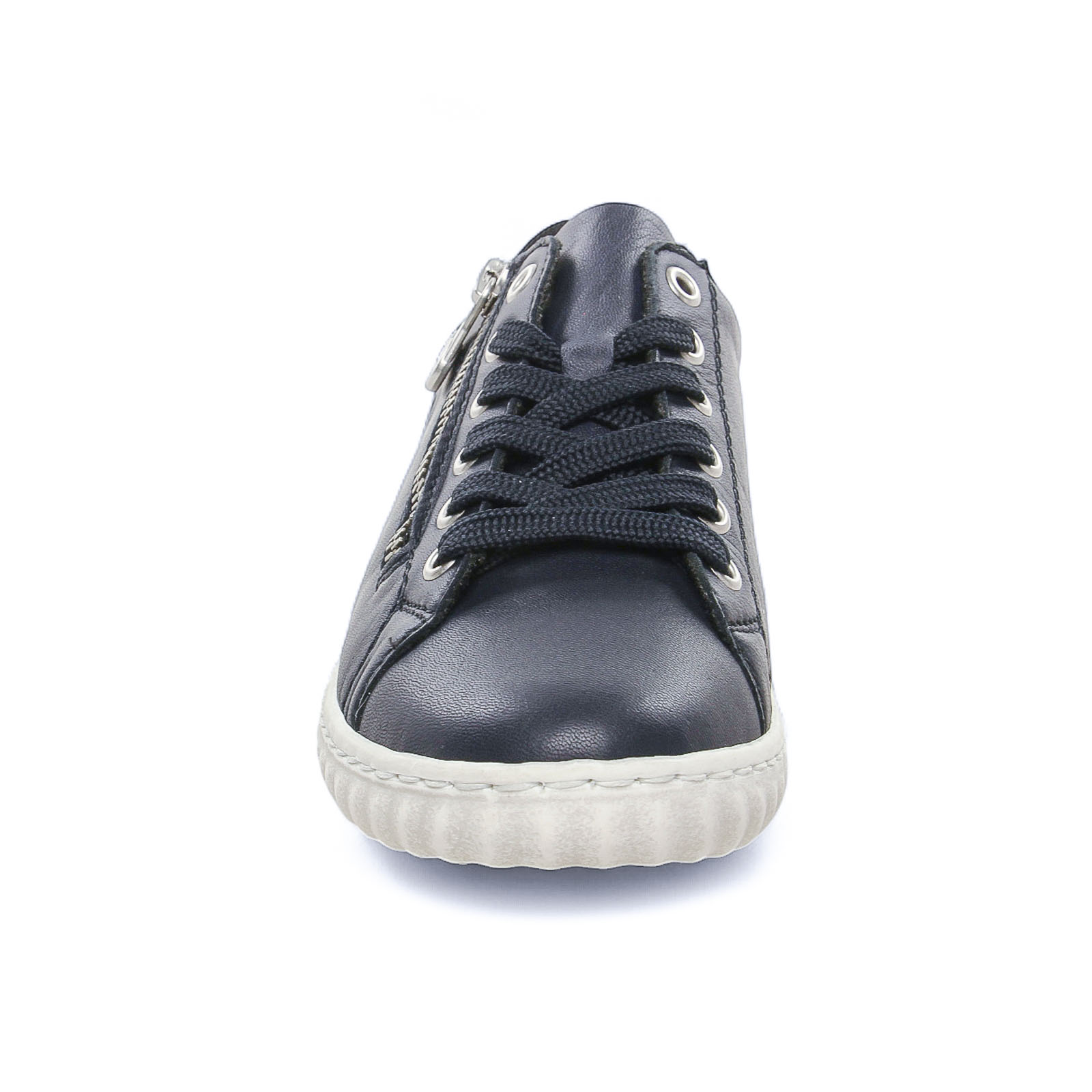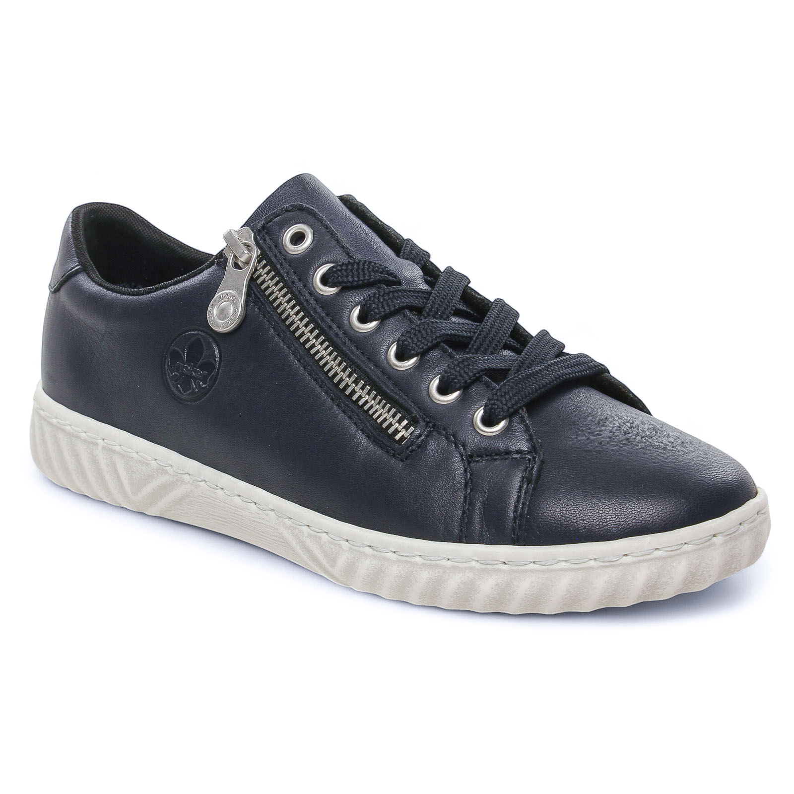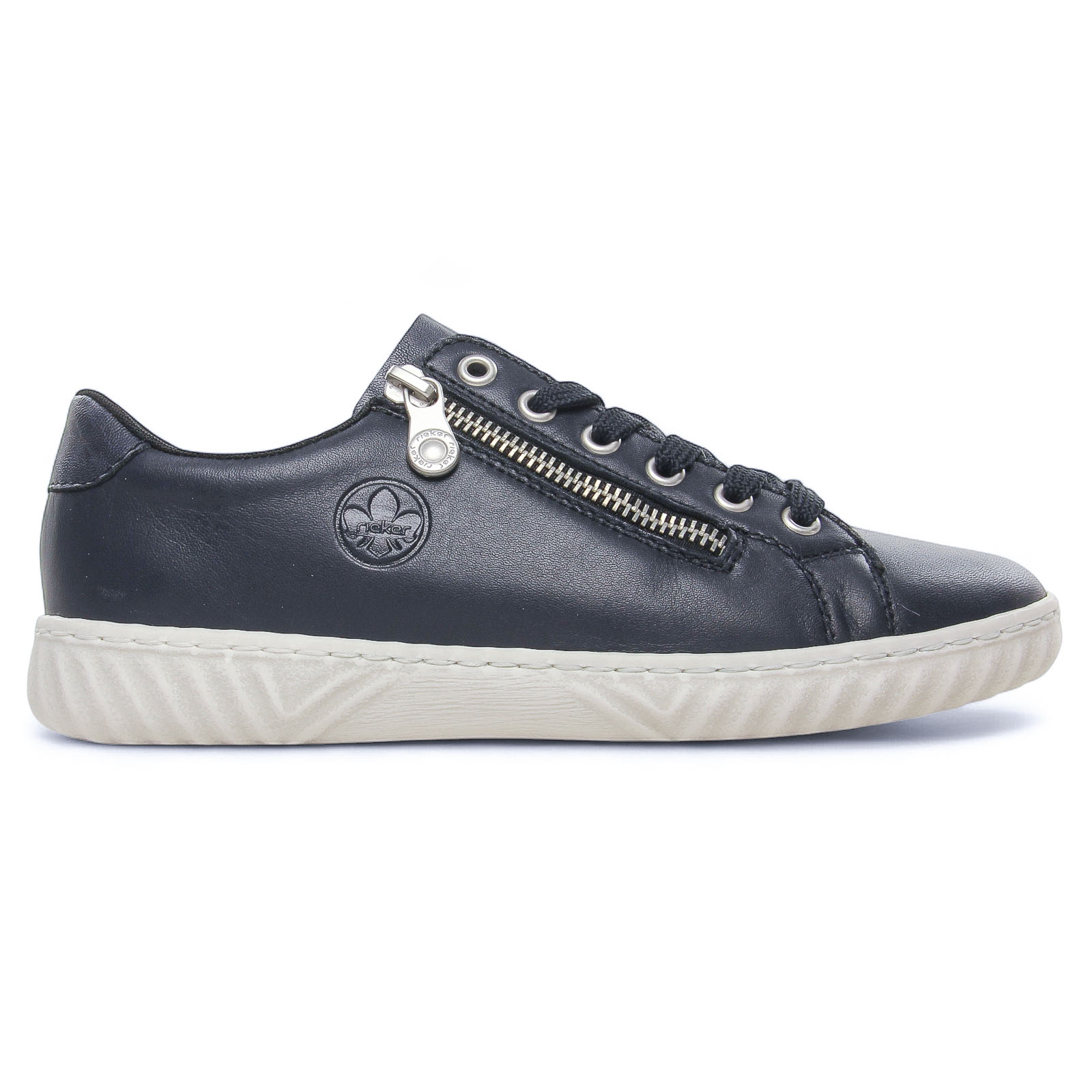 Tennis de la marque Rieker de couleur bleu marine. Jolies tennis féminines et confortables de la marque suisse allemande Rieker, chaussant, une fermeture éclair pour les chausser facilement, une semelle souple texturée, deux versions disponibles pour cette nouvelle collection printemps été 2026.