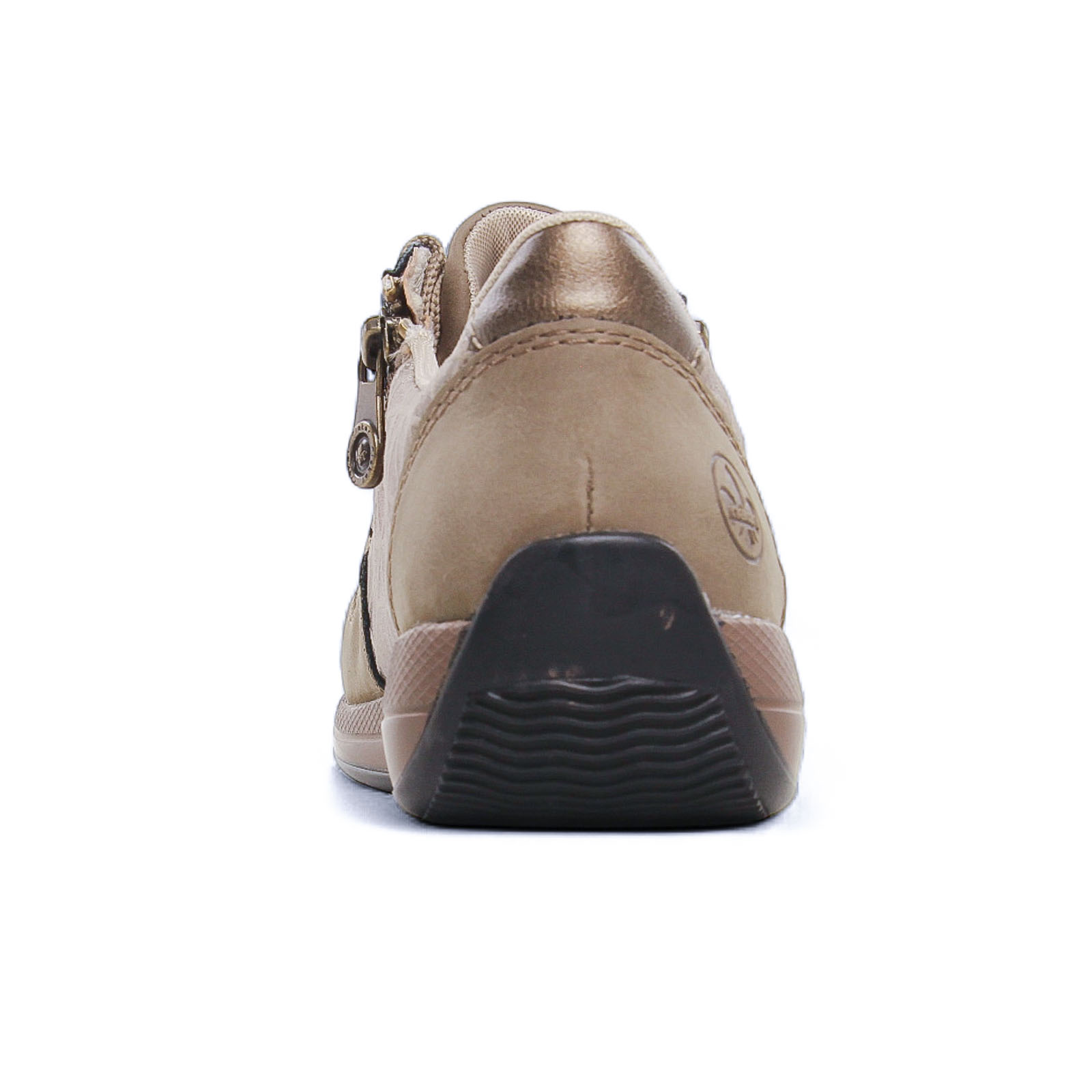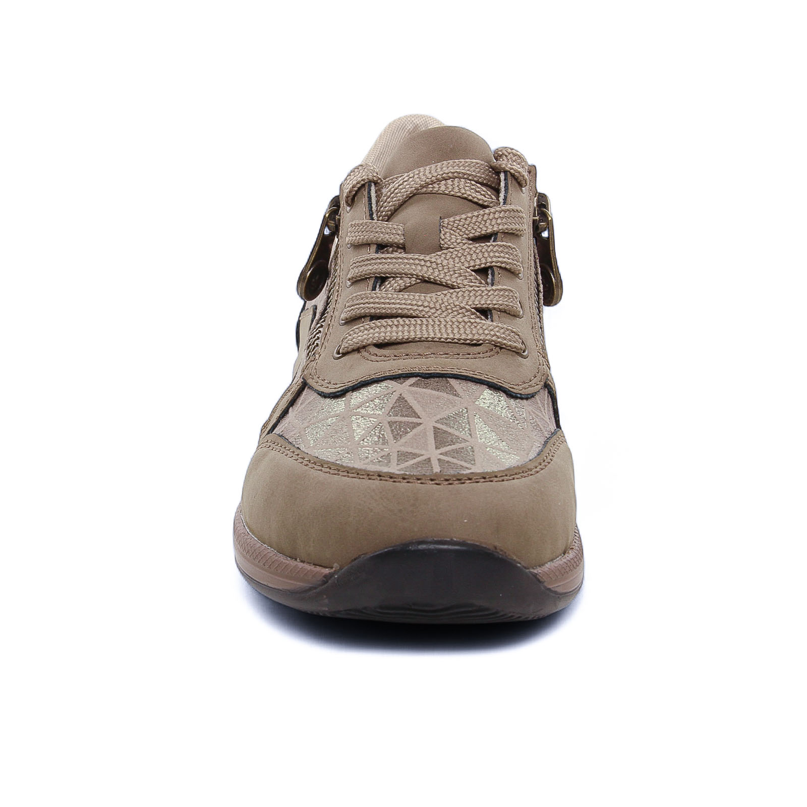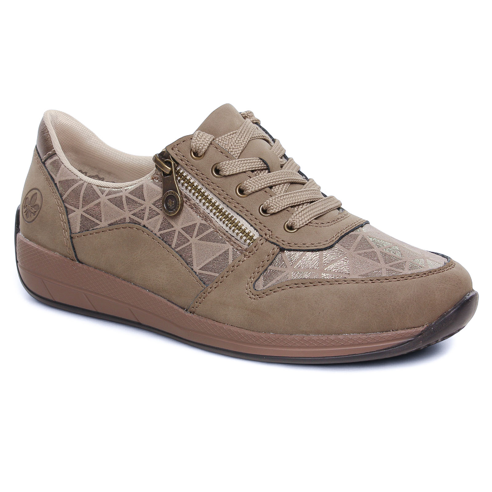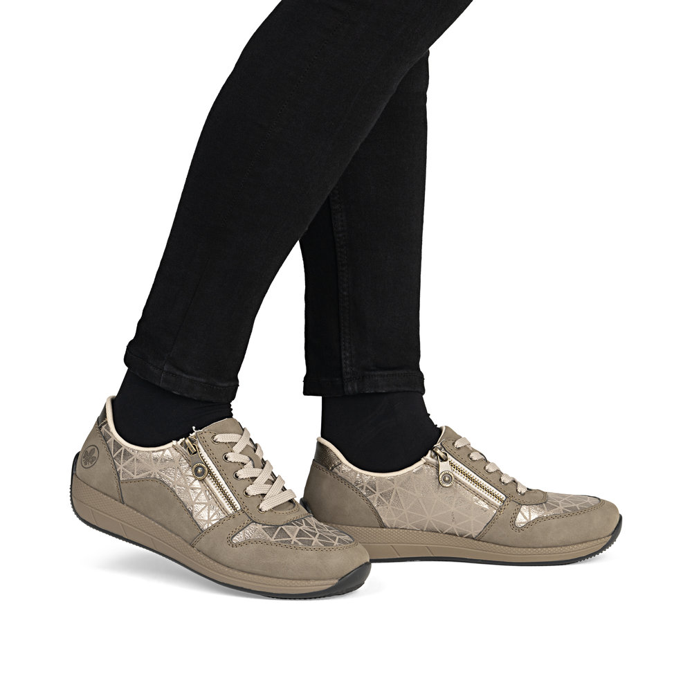 Tennis de la marque Rieker de couleur taupe. Jolies baskets basses beige alliant élégance et confort avec un design raffiné. Une première de propreté hyper confortable, 2 zips et des lacets en coton agrémentés de filaments dorés offrent un ajustement pratique. La semelle extérieure en gomme est très souple avec une bonne adhérence.