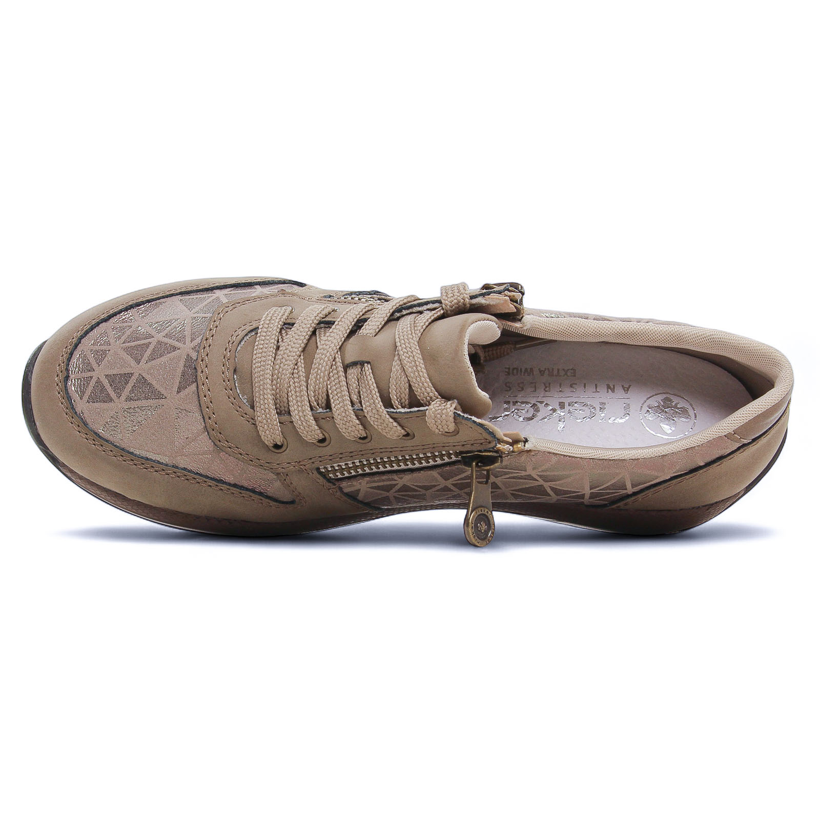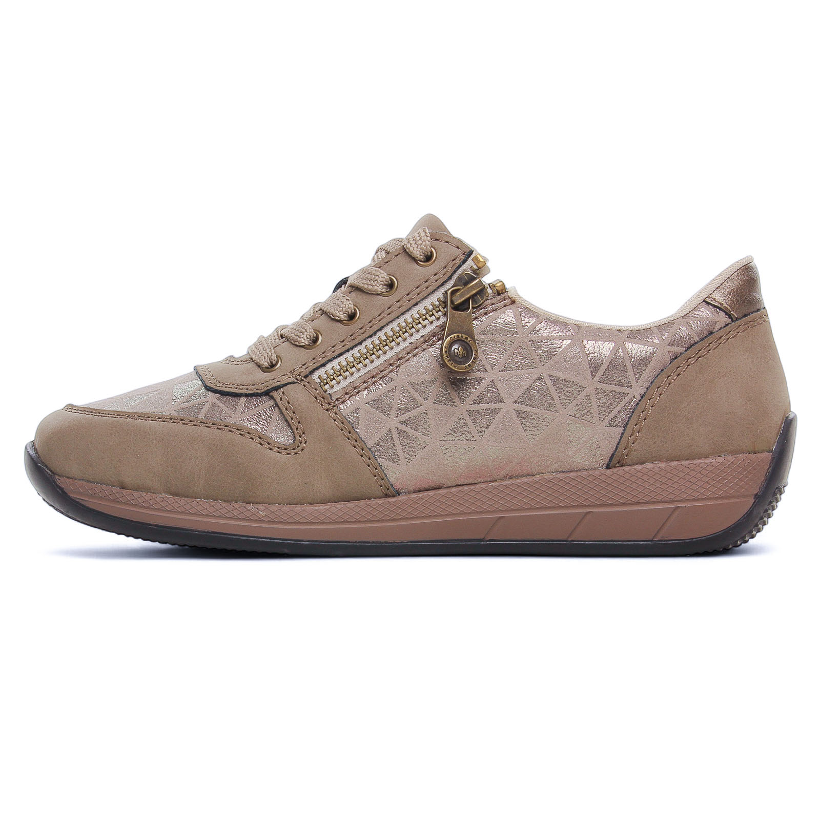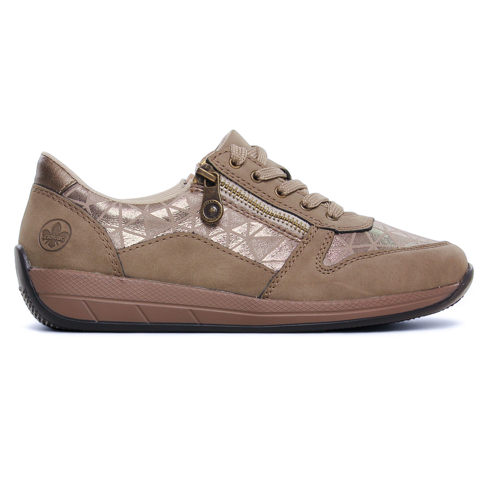 Tennis de la marque Rieker de couleur taupe. Jolies baskets basses beige alliant élégance et confort avec un design raffiné. Une première de propreté hyper confortable, 2 zips et des lacets en coton agrémentés de filaments dorés offrent un ajustement pratique. La semelle extérieure en gomme est très souple avec une bonne adhérence.