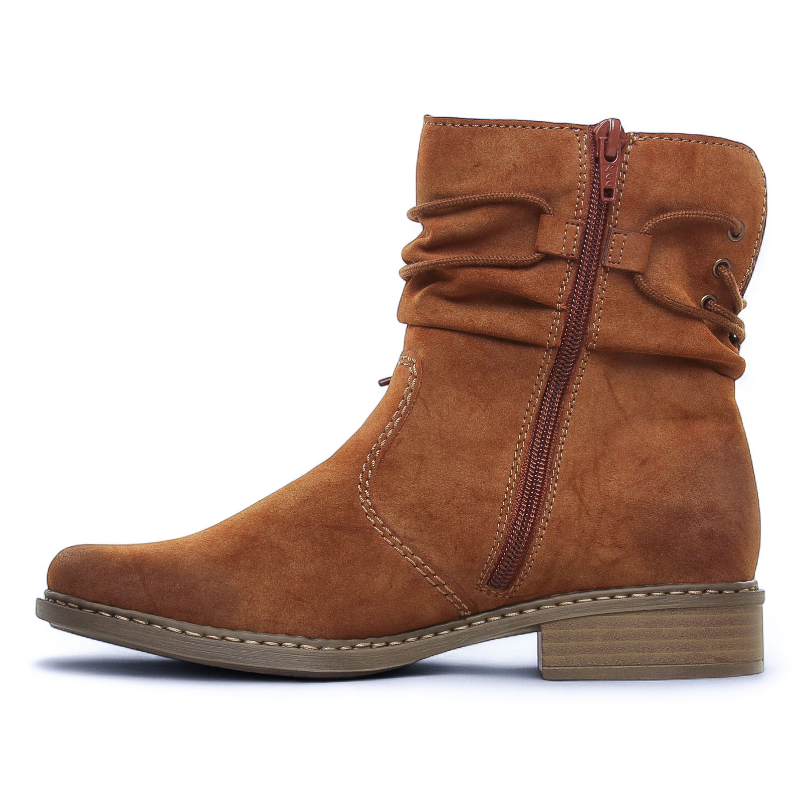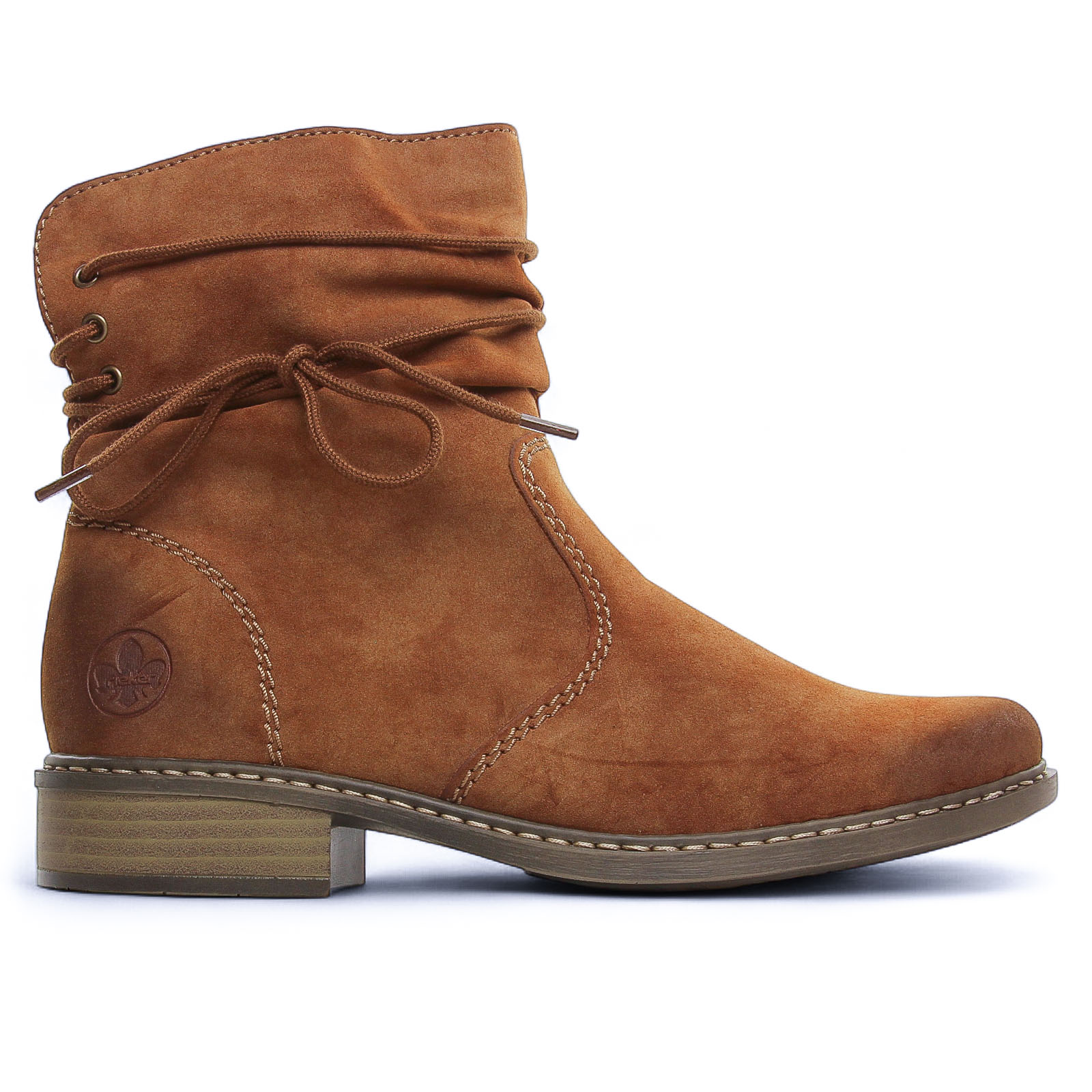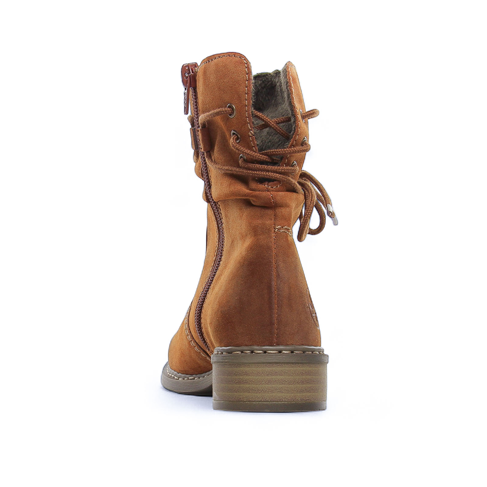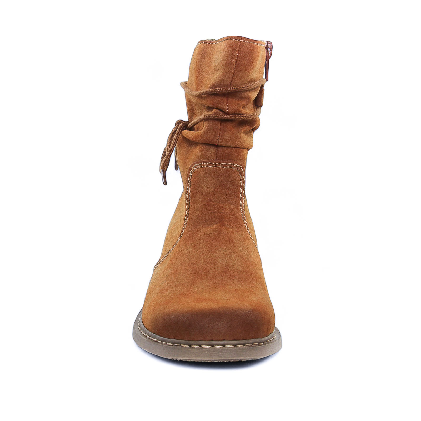 Boots Confort de la marque Rieker de couleur marron. Pour une touche bohème chic à votre look, optez pour ces boots montantes inspiration western, doublure textile chaude fourrée, brides fines autour de la cheville, surpiqure beige, une semelle gomme souple et une tige en suédine avec un beau drapée !