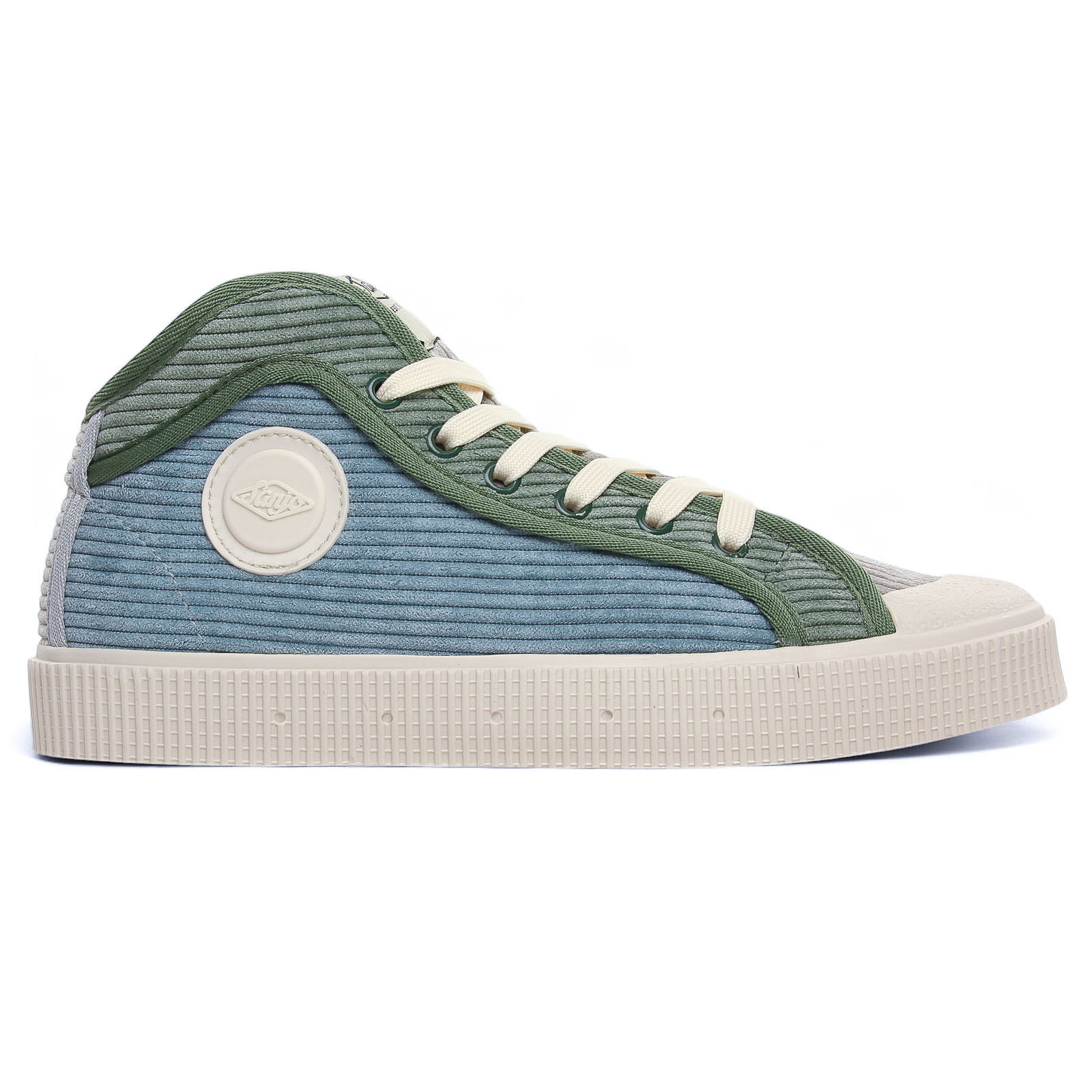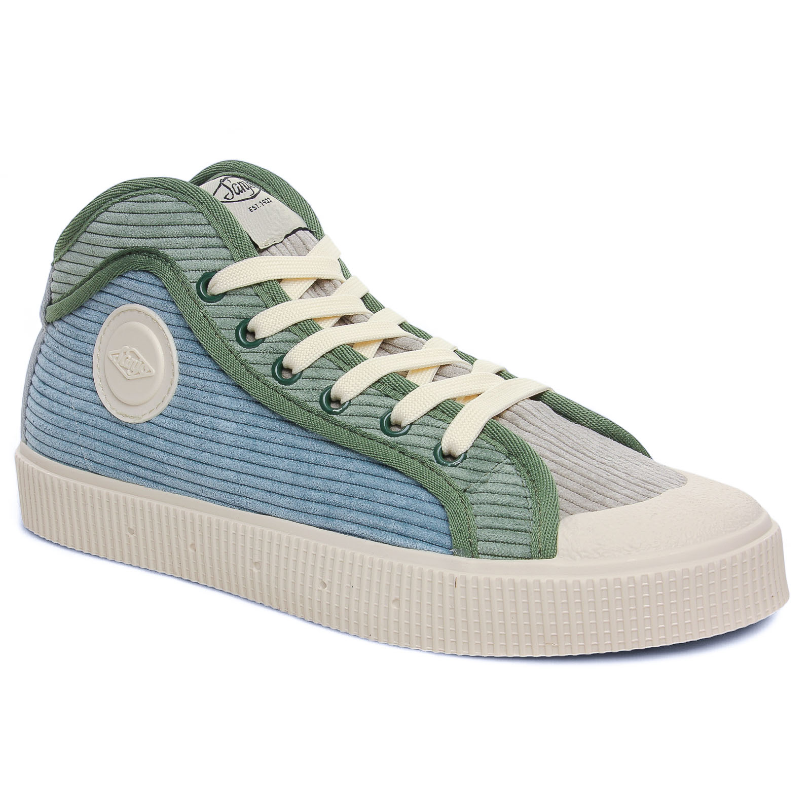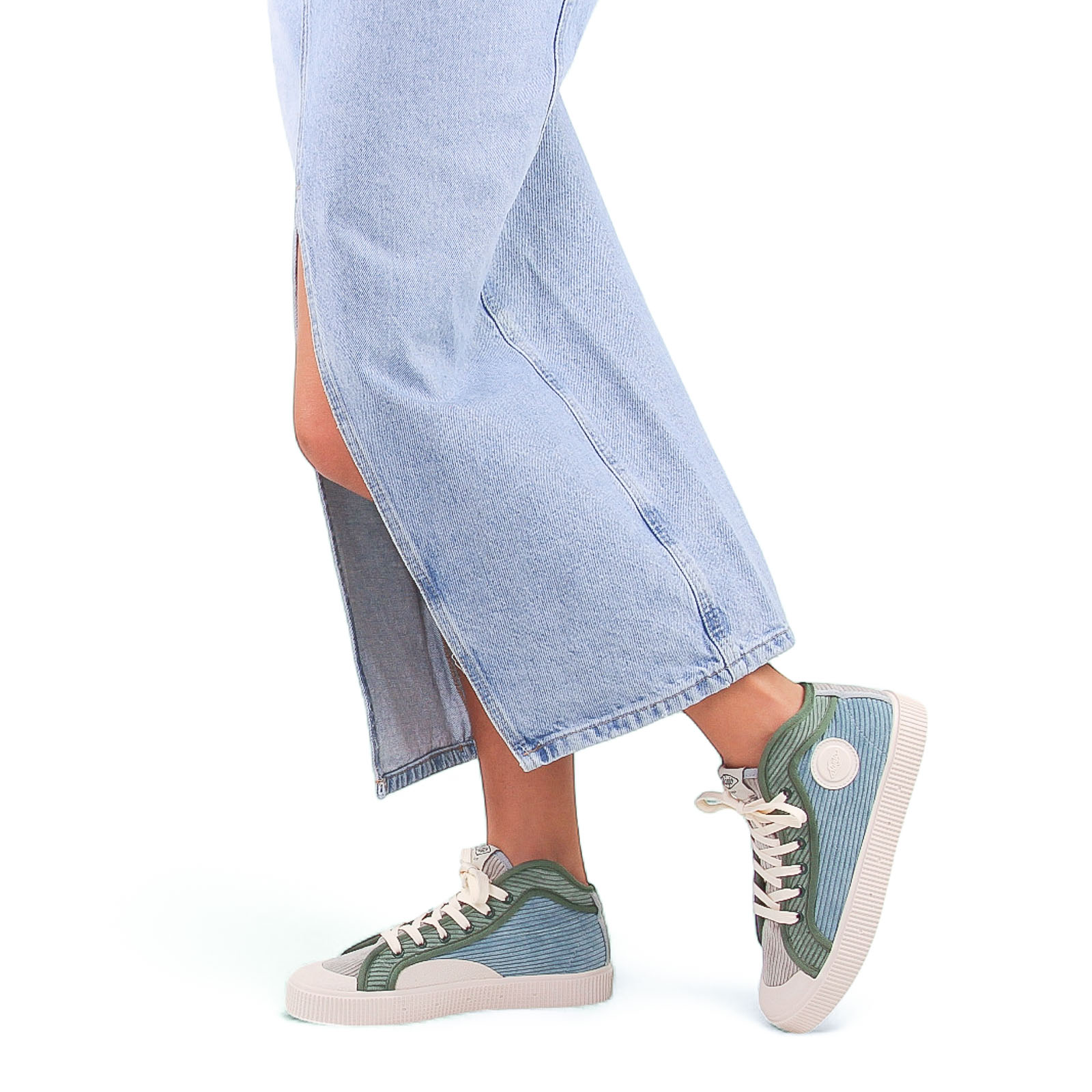 Baskets Mode de la marque Sanjo de couleur bleu vert. Superbes baskets originales signées SANJO, baskets mi montantes avec une tige textile velours côtelé ou effet lainage, doublées toile et première amortissante et amovible si besoin, des lacets blanc et sur le coté pastille logo type blanc, une semelle blanche crème : on adore !