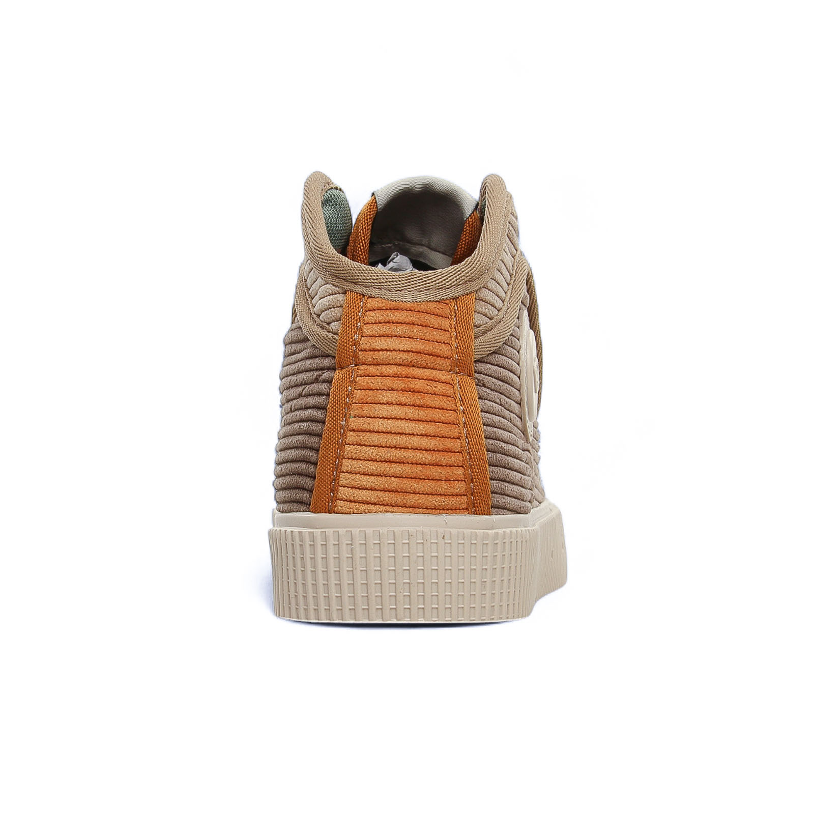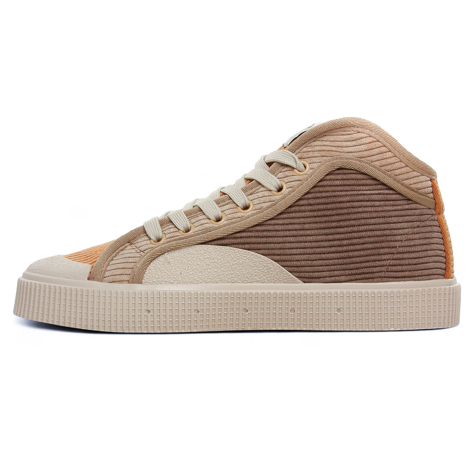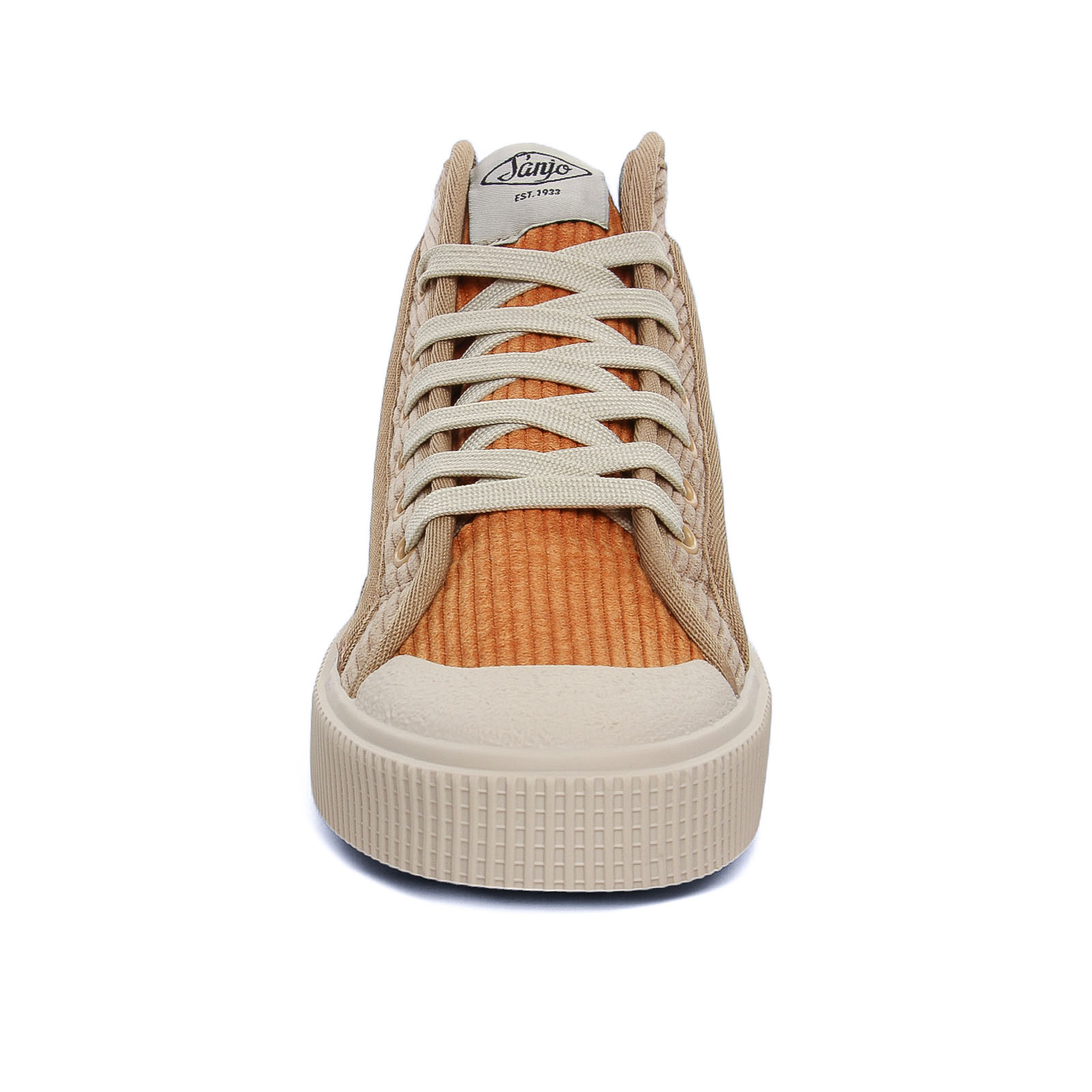 Baskets Mode de la marque Sanjo de couleur marron beige. Superbes baskets originales signées SANJO, baskets mi montantes avec une tige textile velours côtelé ou effet lainage, doublées toile et première amortissante et amovible si besoin, des lacets blanc et sur le coté pastille logo type blanc, une semelle blanche crème : on adore !