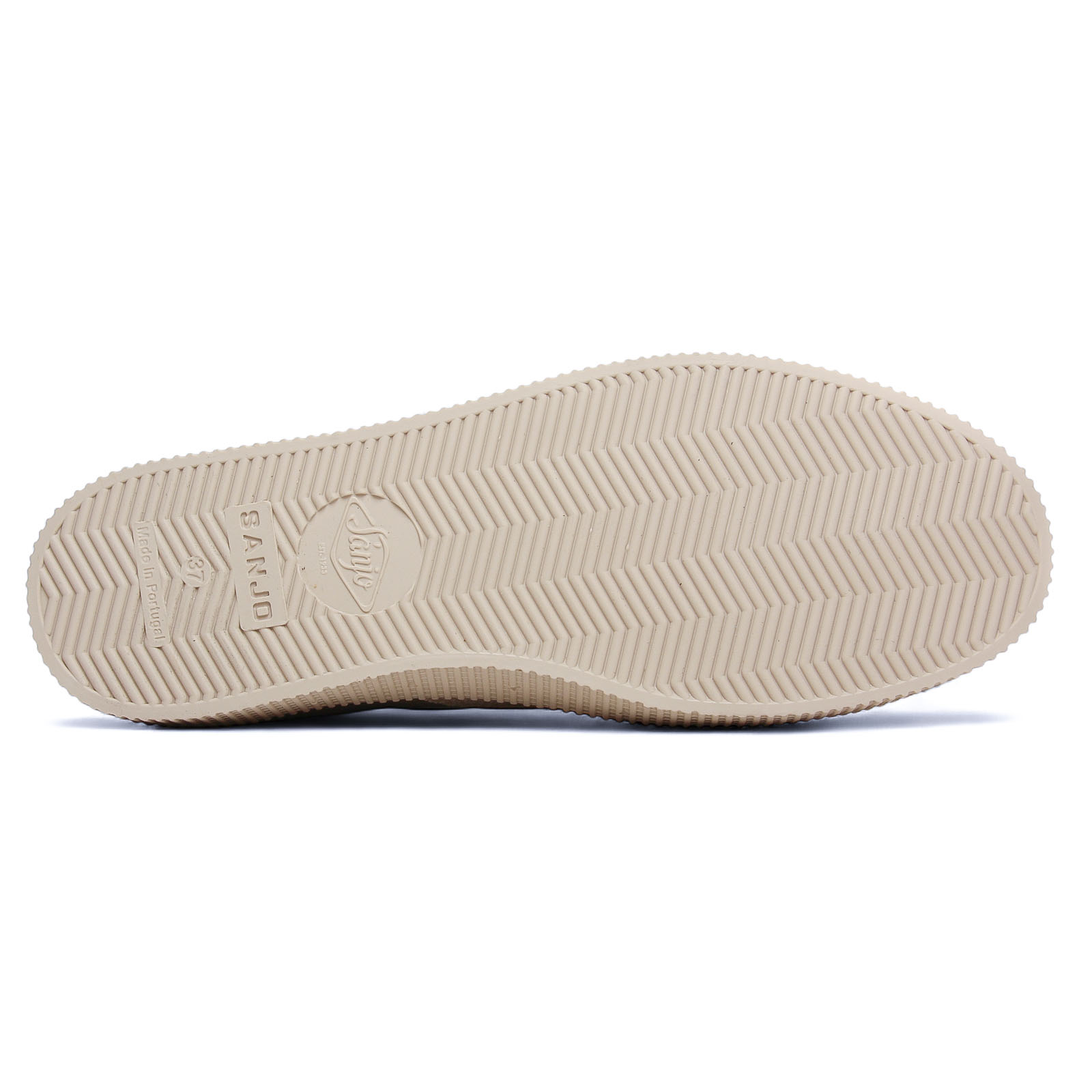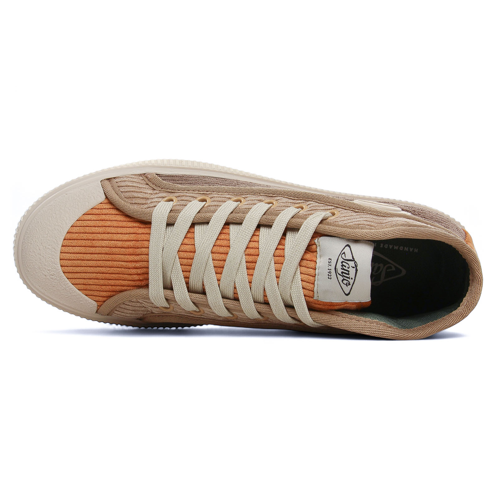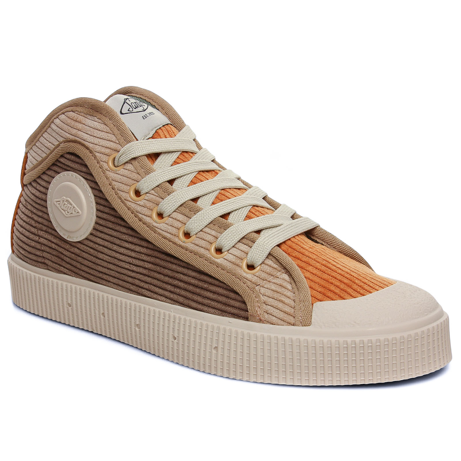 Baskets Mode de la marque Sanjo de couleur marron beige. Superbes baskets originales signées SANJO, baskets mi montantes avec une tige textile velours côtelé ou effet lainage, doublées toile et première amortissante et amovible si besoin, des lacets blanc et sur le coté pastille logo type blanc, une semelle blanche crème : on adore !