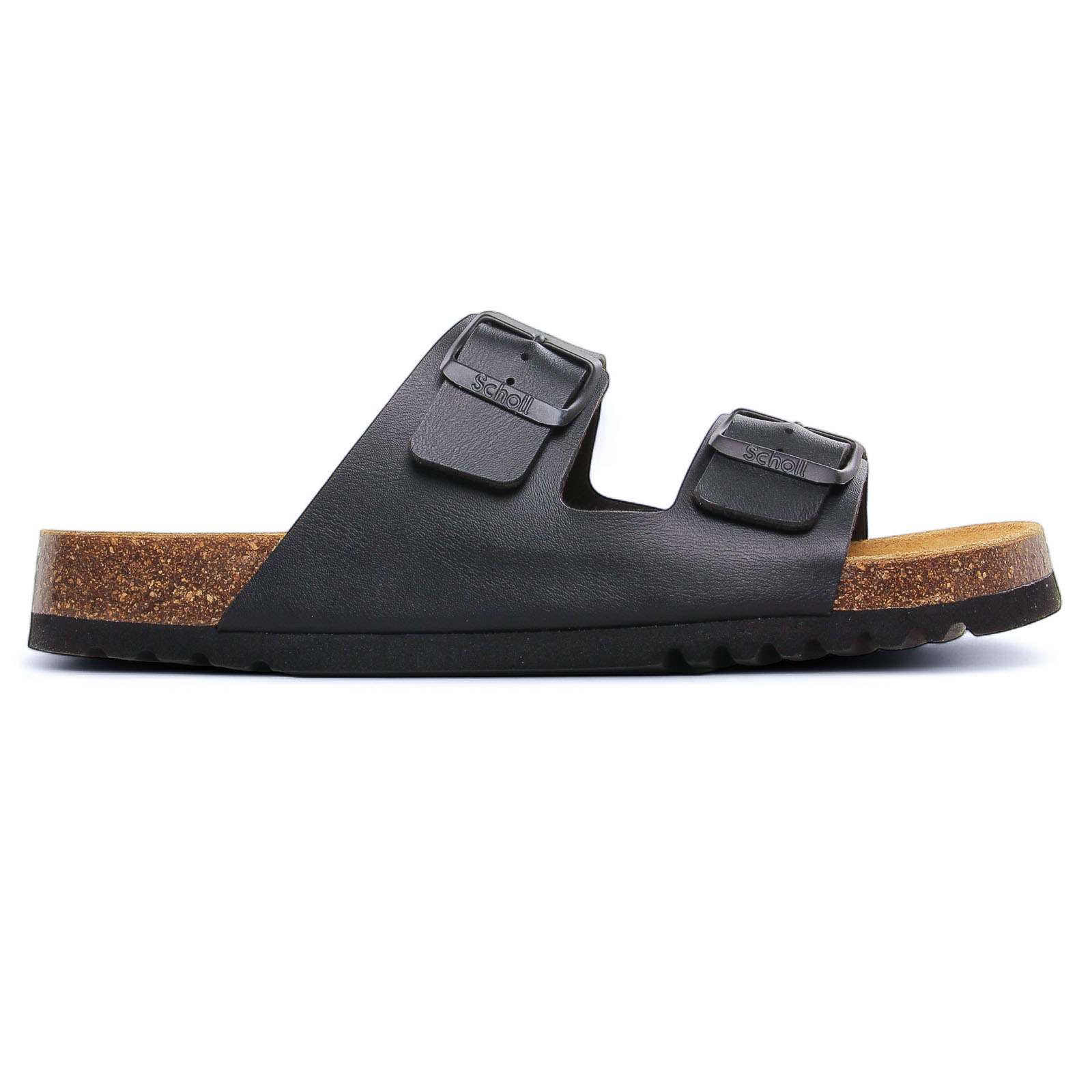 Sandales de la marque Scholl de couleur noir. Mules simili cuir très confortables sur une semelle noire souple et gomme élastomère, deux brides réglables sur le coup de pied, un must have dans sa garde robe estivale.
