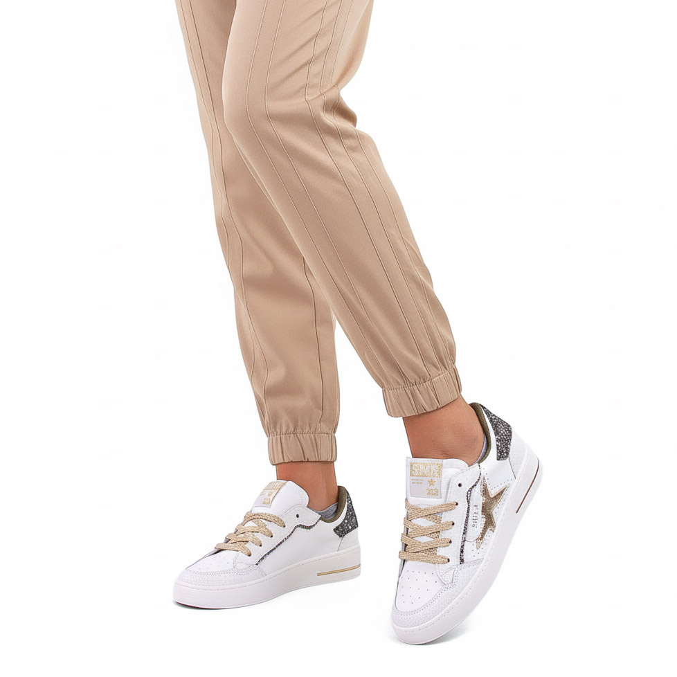 Baskets Mode de la marque Semerdjian Smr23 de couleur blanc or. Sneakers basses signées Semerdjian, de la fantaisie et du glamour, baskets tendances avec une tige en cuir blanche, insert du logo en doré sur le coté, des paillettes bordeaux au talon, des lacets en coton blanc crème et fils or, une première cuir amovible, soyez tendance et stylé avec ces sneakers SMR23 !