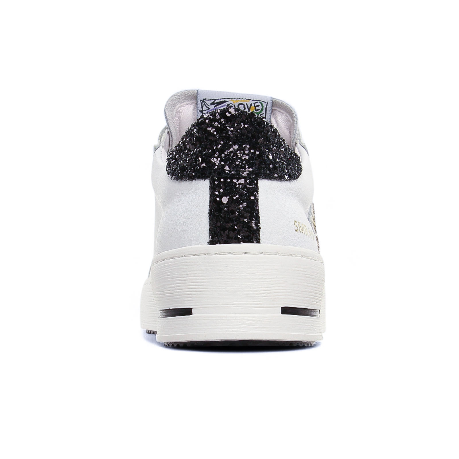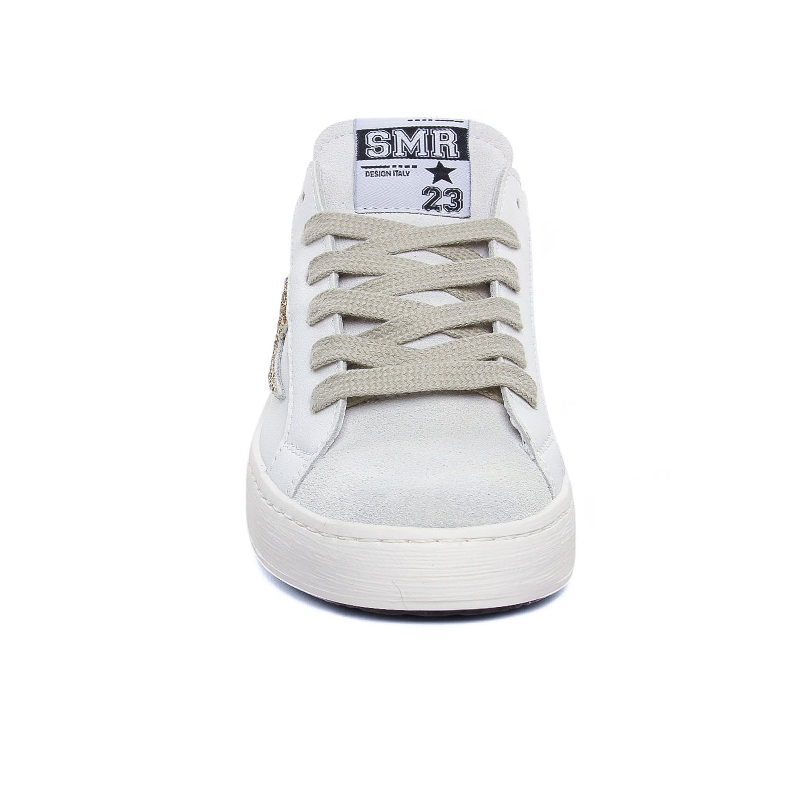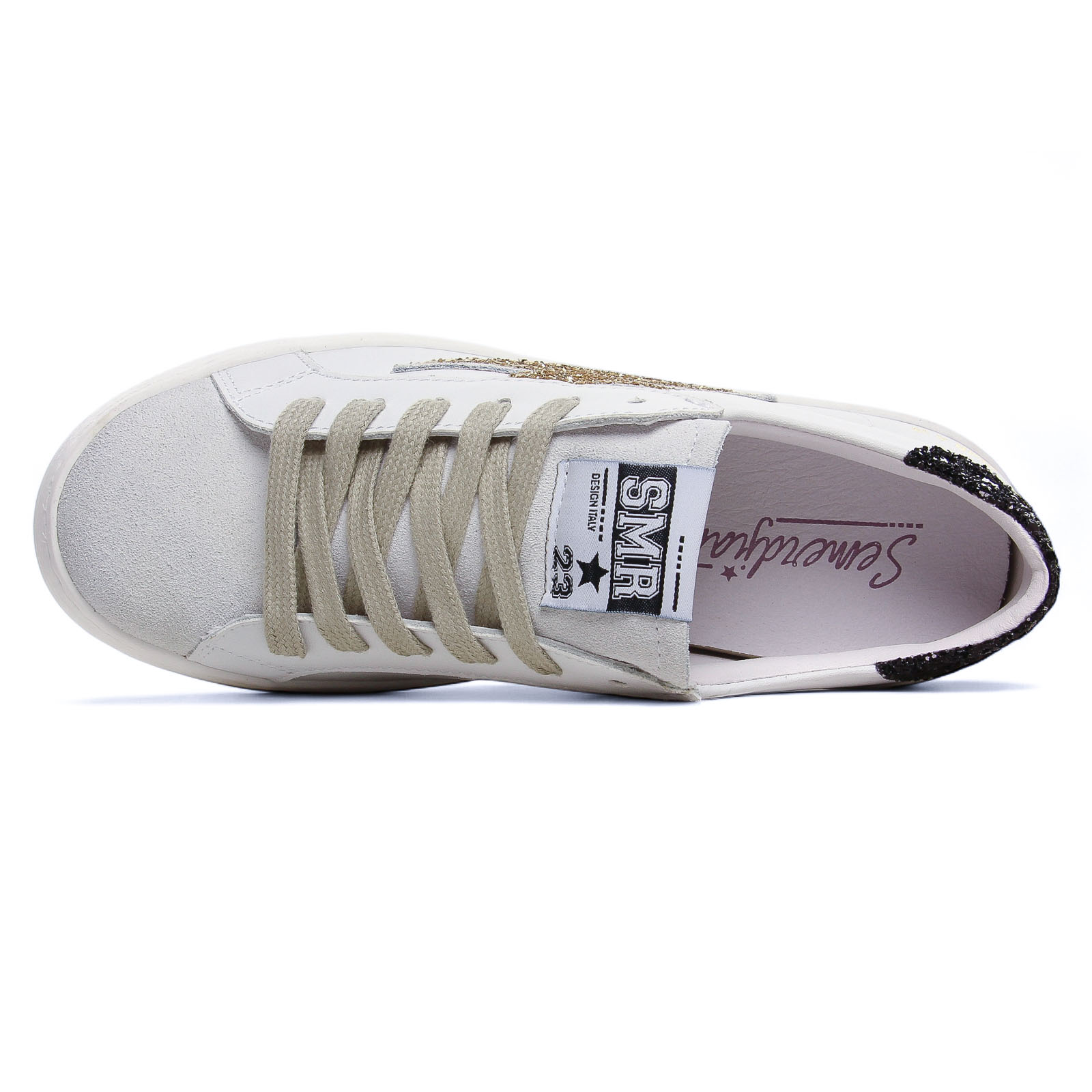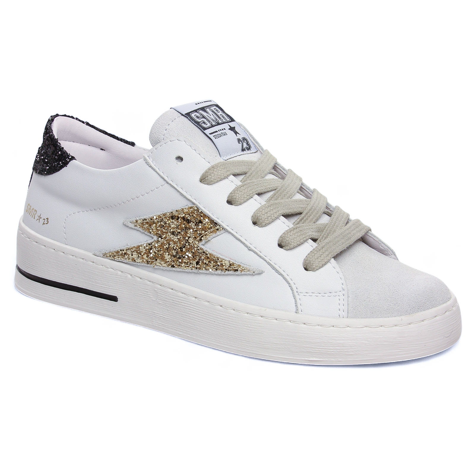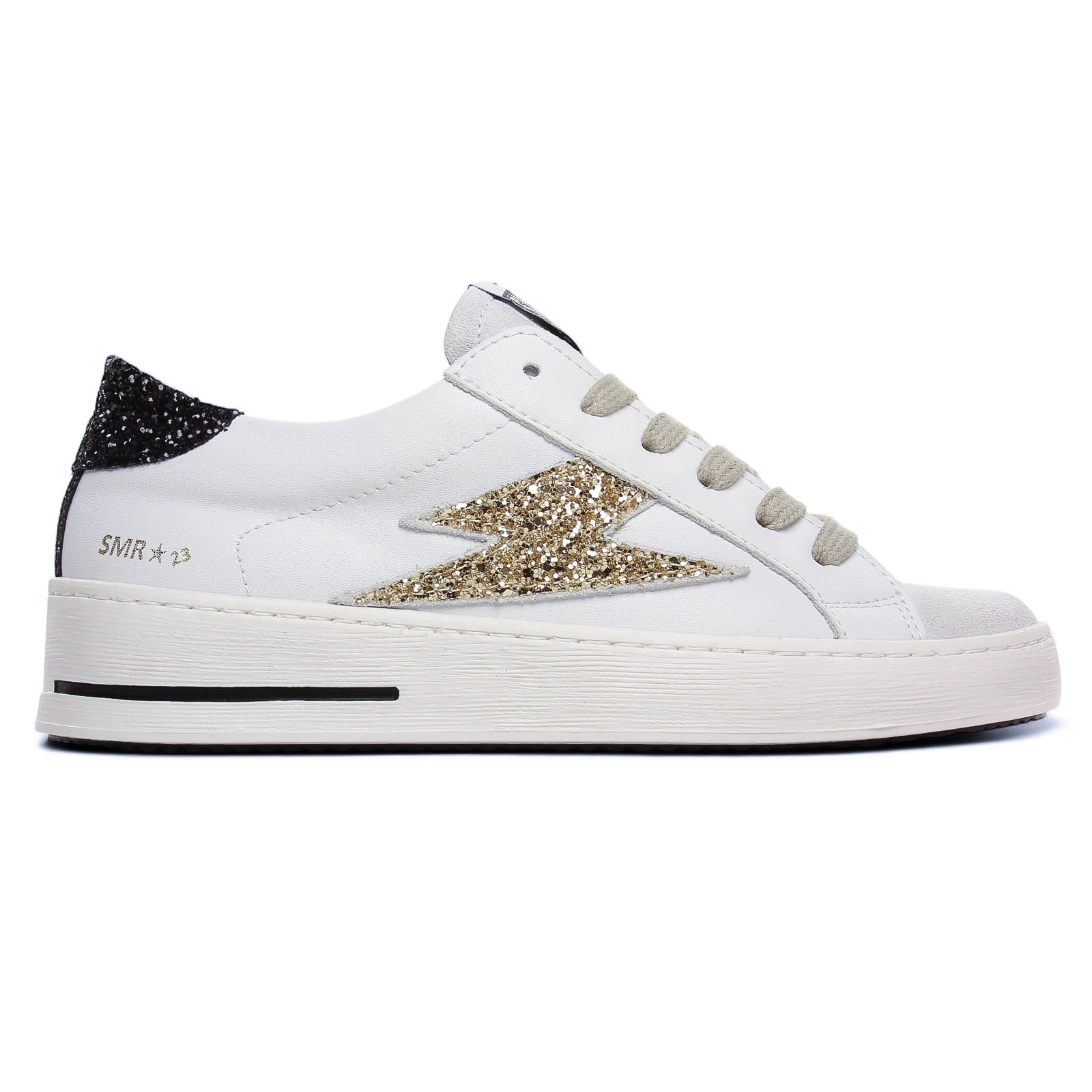 Baskets Mode de la marque Semerdjian Smr23 de couleur blanc or. Sneakers Maya de Semerdjian, baskets basses tendances, de la fantaisie et du glamour à votre style ! Une tige en cuir blanc et paillettes or sur le coté, insert noir au talon, des lacets coton couleur crème, une première en cuir et amovible, soyez tendance et stylé avec ces sneakers SMR23 !