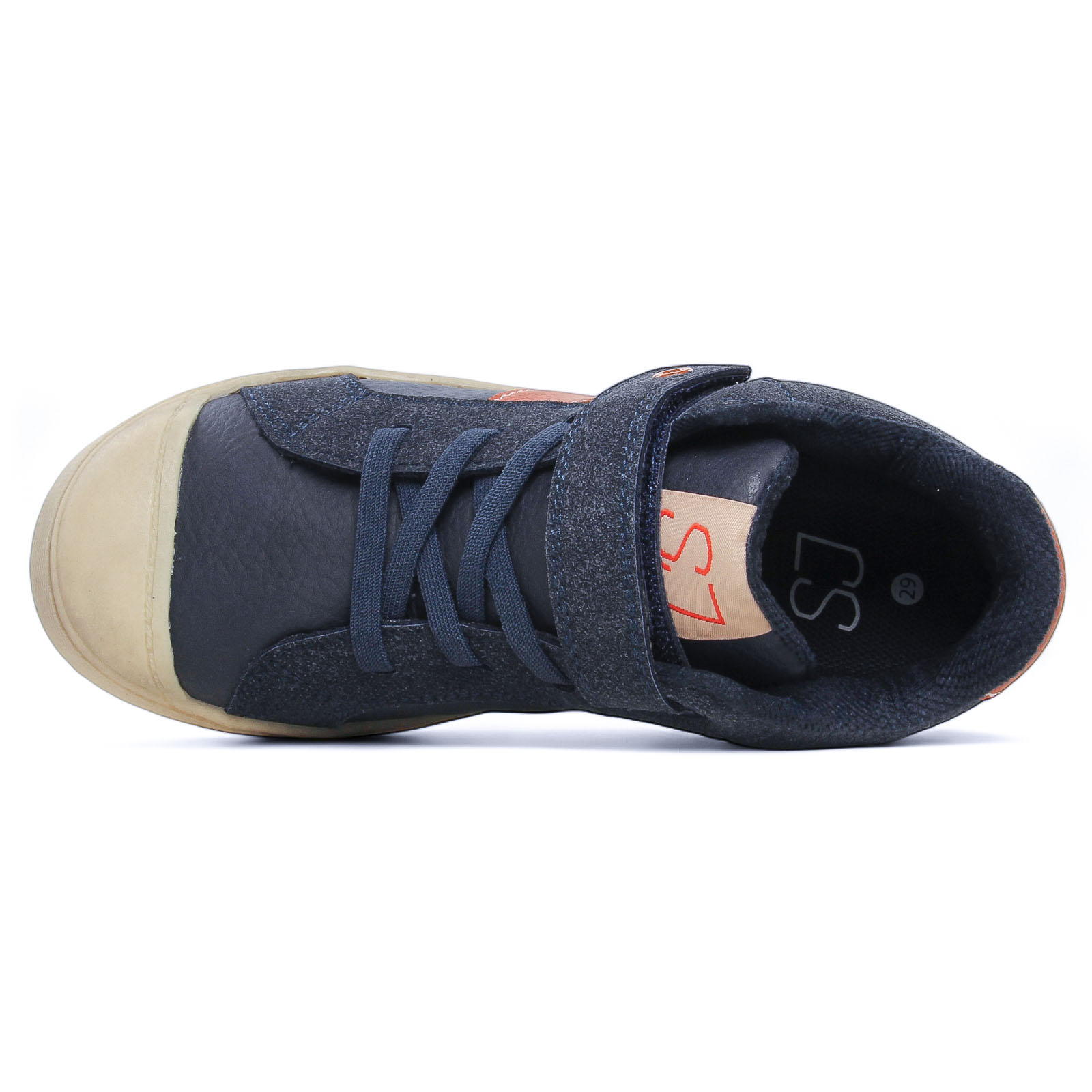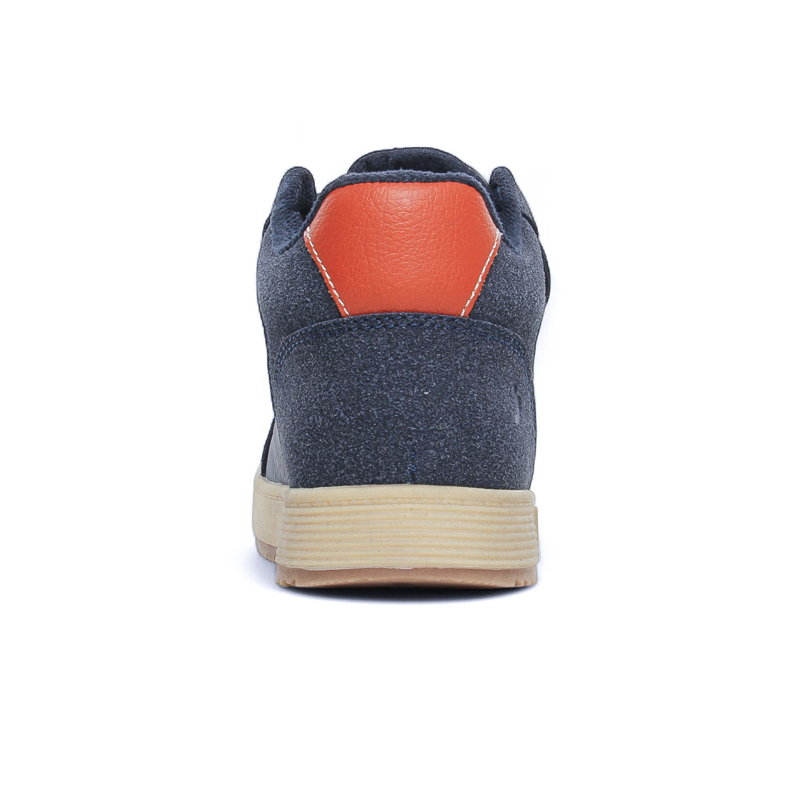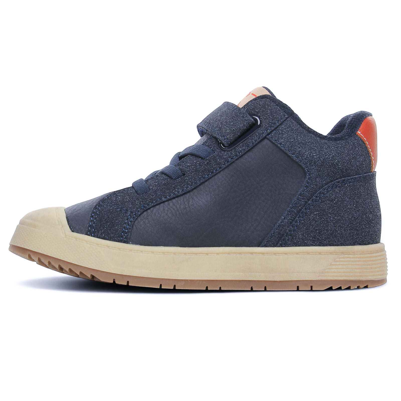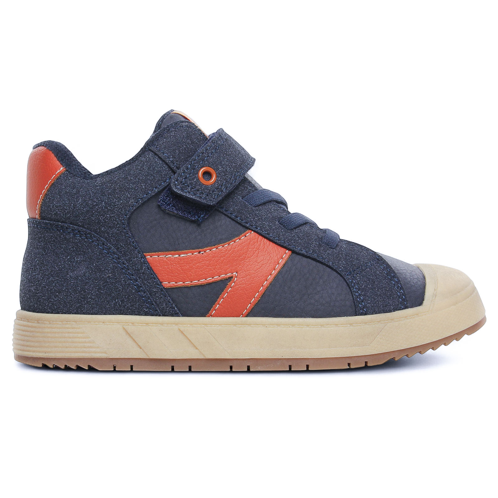 Baskets Enfants de la marque Sj de couleur bleu marine. Jolies baskets montantes avec une fermeture velcro et des lacets, une tige en simili cuir dans des teintes bleu marine et orange, une semelle souple, des chaussures confortables signées SJ Lifestyle avec un prix tout doux !