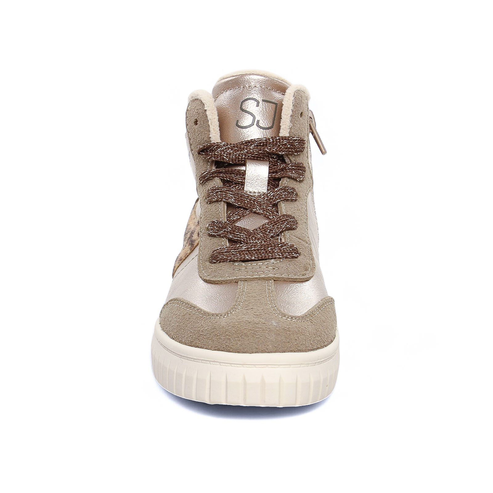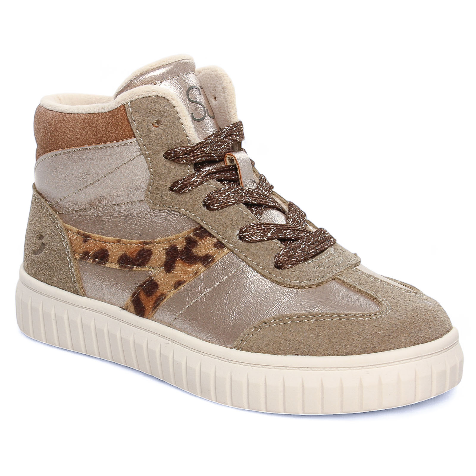 Chaussures Montantes de la marque Sj de couleur rose. Jolies chaussures montantes avec une tige en simili cuir avec des insert textile léopard et métalisé, chaussuresdans des teintes beige taupe et léopard, une semelle souple, des chaussures confortables signées SJ Lifestyle avec un prix tout doux !
