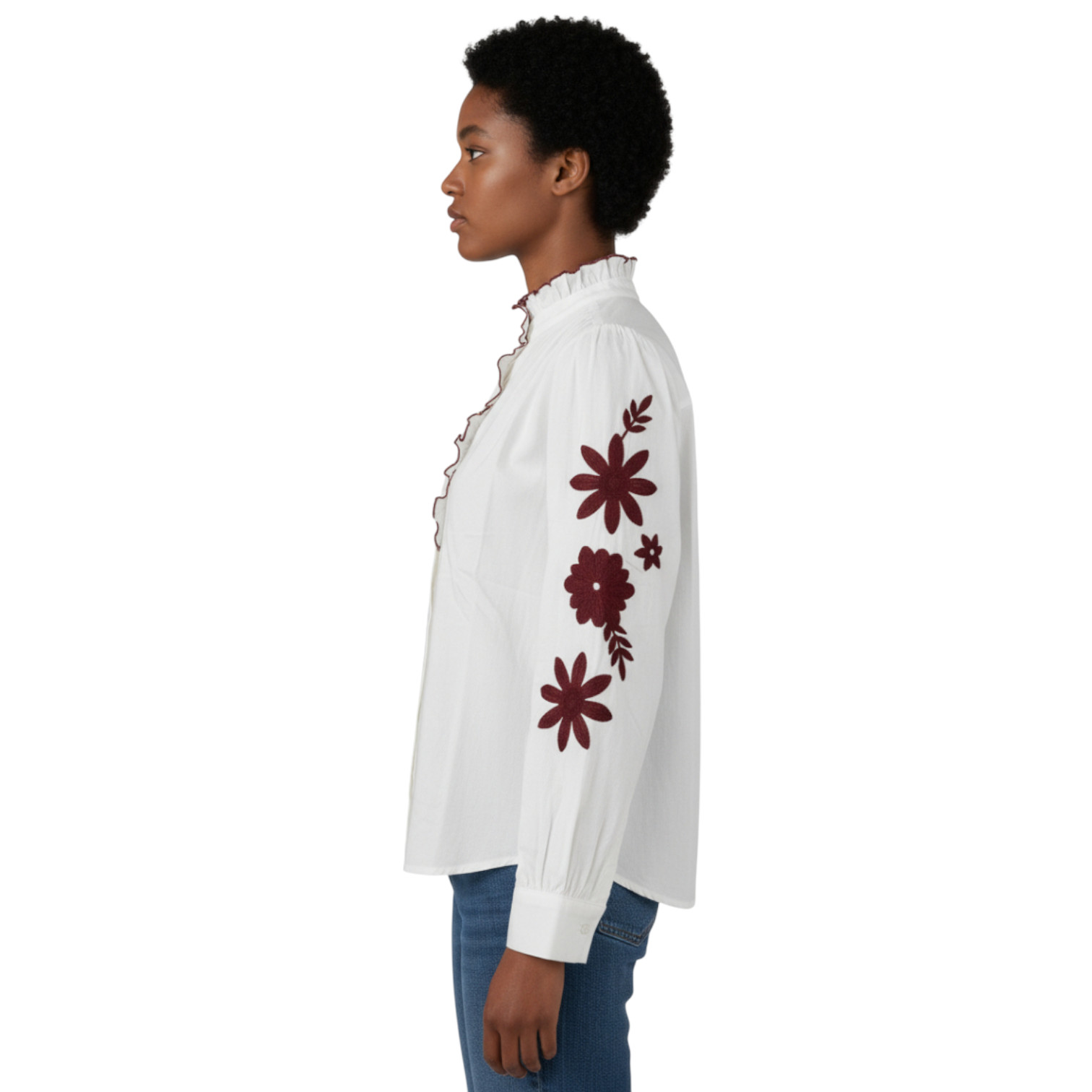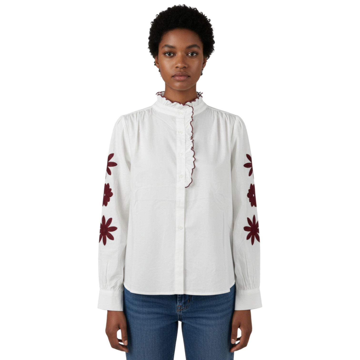 Chemisiers de la marque Suzzy et Milly de couleur blanc bordeaux. Adoptez un style romantique et moderne avec cette chemise blanche à manches longues, ornée de superbes broderies florales bordeaux sur les manches. Son col montant délicatement volanté et sa patte de boutonnage festonnée assortie lui confèrent un charme unique et raffiné. C'est une pièce distinctive qui s'associe parfaitement à un jean pour un look à la fois chic et décontracté.
