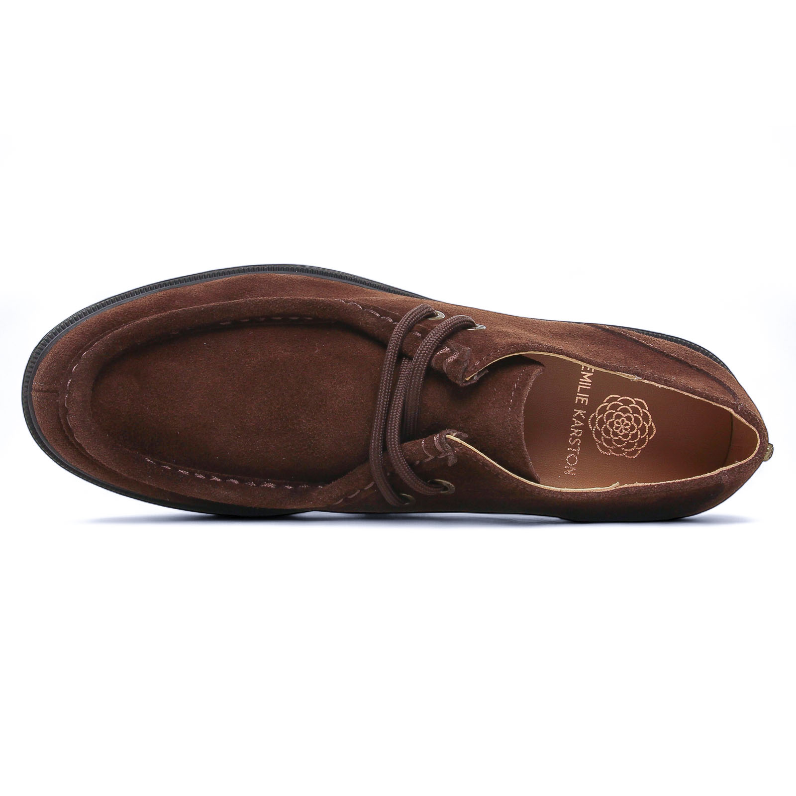 Derbies de la marque Émilie Karston de couleur marron. Superbes derbies en croute de cuir marron foncé avec des coutures apparentes sur coup de pied, un plateau de 2 cm, un talon crantée haut de 4 cm, doublure et première de propreté en cuir, chaussures basses à lacets femme signées Émilie Karston.
