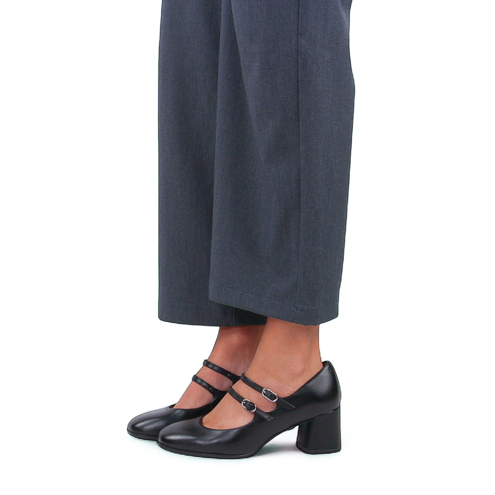 Escarpins Brides de la marque Tamaris de couleur noir. Escarpins en cuir noir agrémentés par deux brides réglables sur le coup de pieds et à fermoir couleur or, première en cuir légèrement amortie et talon bloc de 6 cm pour une allure féminine et distinguée !