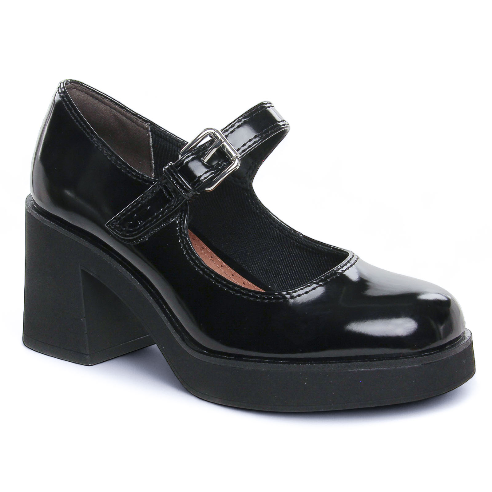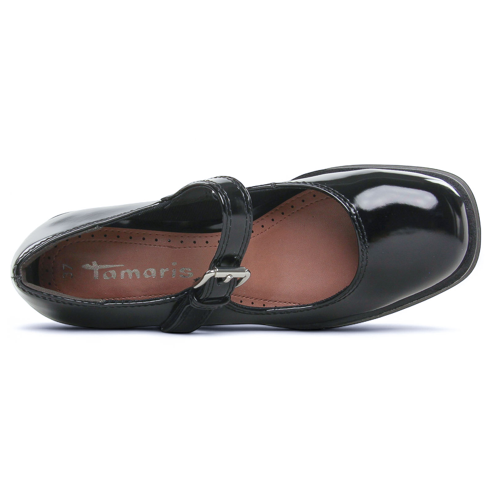 Babies Talon de la marque Tamaris de couleur noir. Un classique revisité avec modernité : une babie avec un talon massif ! Une fermeture par scratch pratique avec sa bride sur le coup de pied ornée d'une boucle déco, un patin anti glissement, une semelle ultra légère style mousse expansée, chaussures à talon haut glamours à souhait avec une tige vernis et un talon de 8 cm de hauteur pour prendre de la hauteur avec élégance !