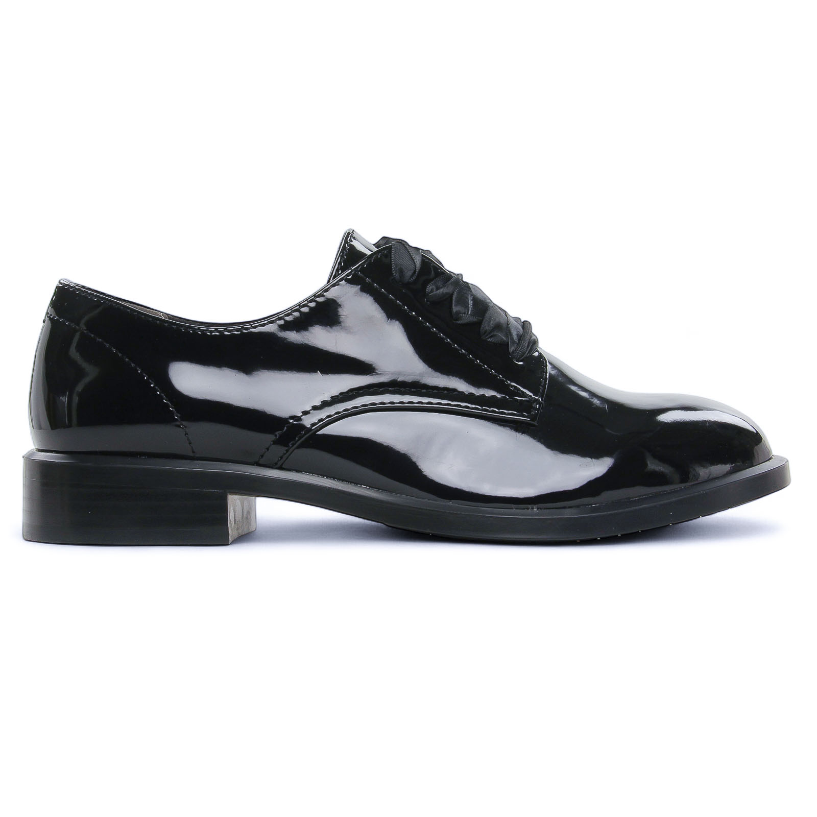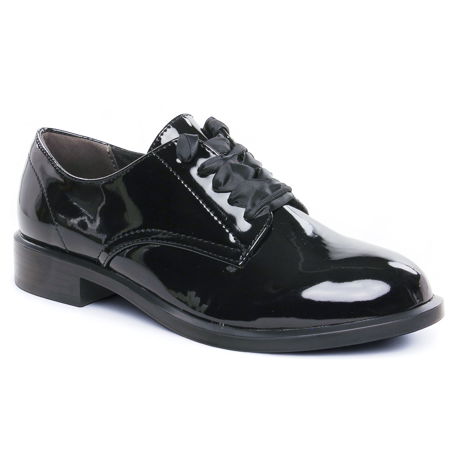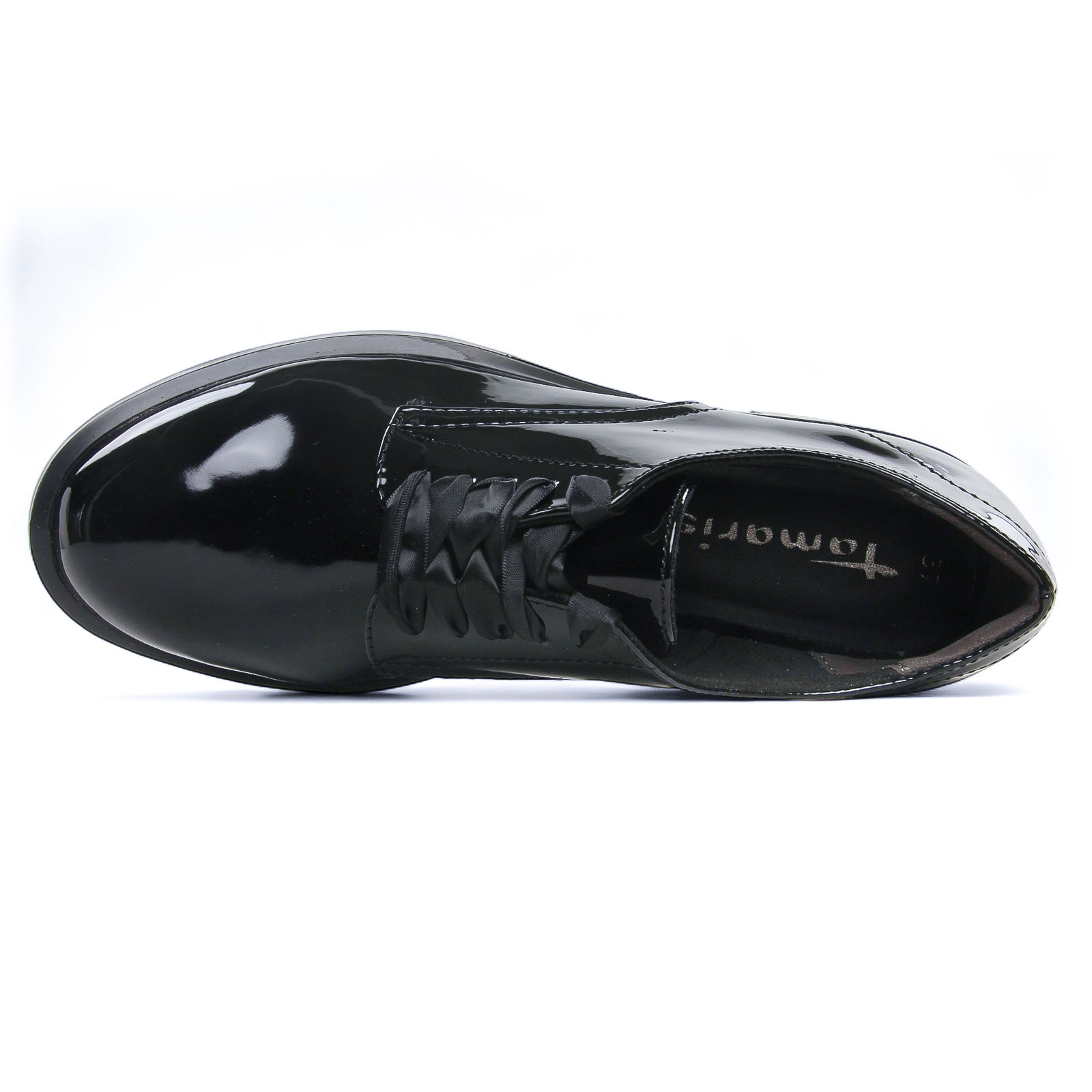 Derbies de la marque Tamaris de couleur noir. Élégantes derbies avec une tige vernis noir, des lacets ruban noir ou classique fins en coton, une première de propreté confortable nommée Touch it, talon rembourré pour plus de confort, semelle antiglisse et talon haut de 3 cm.