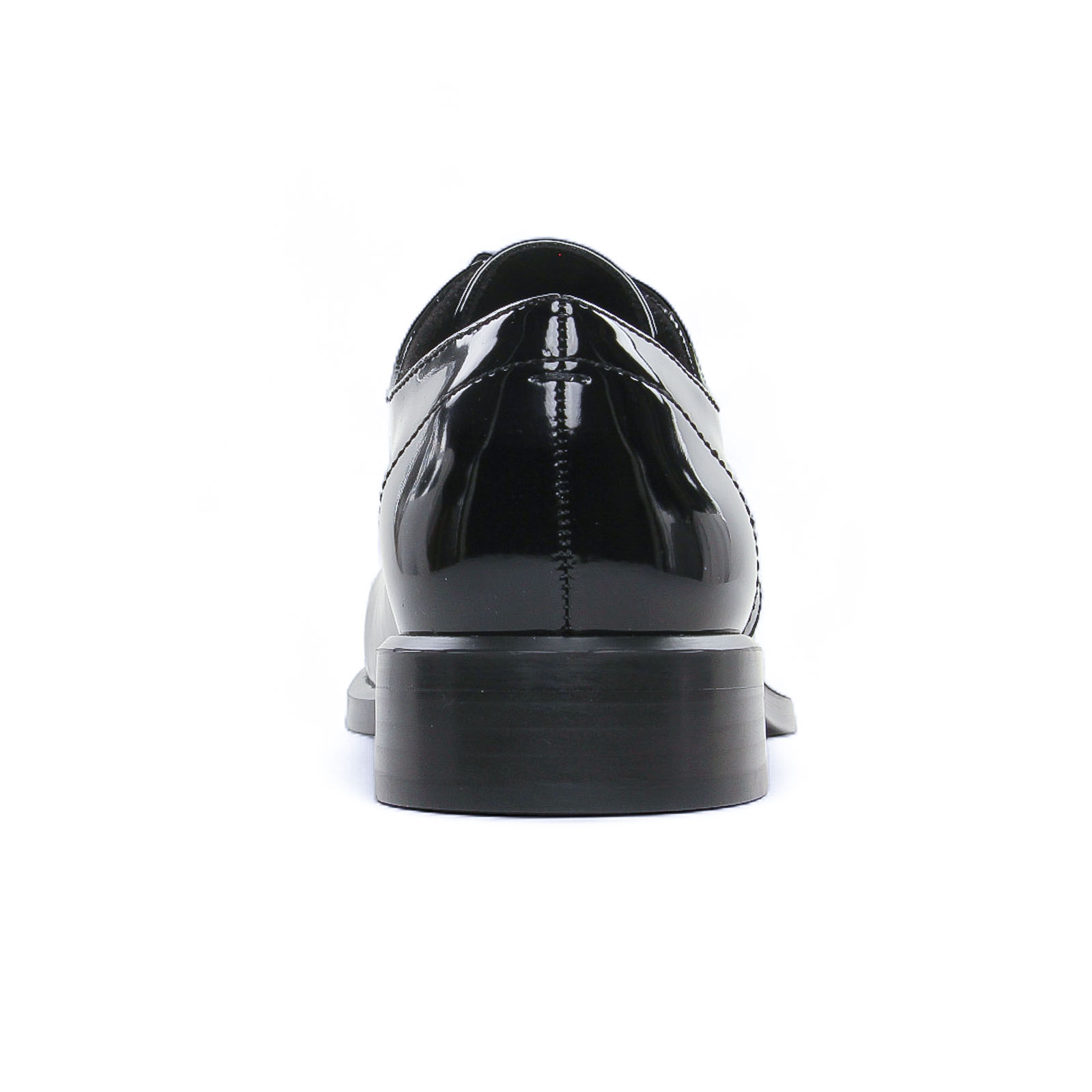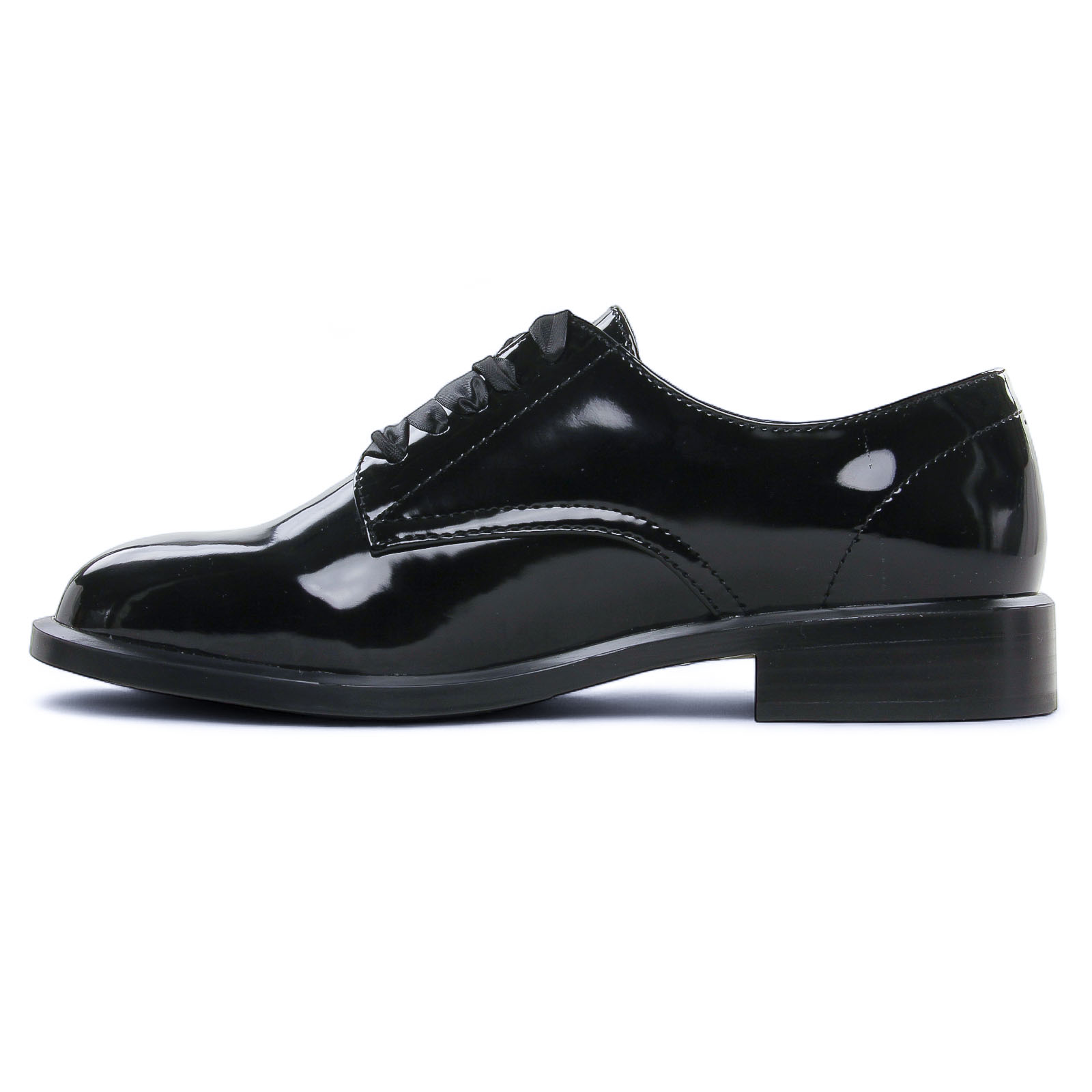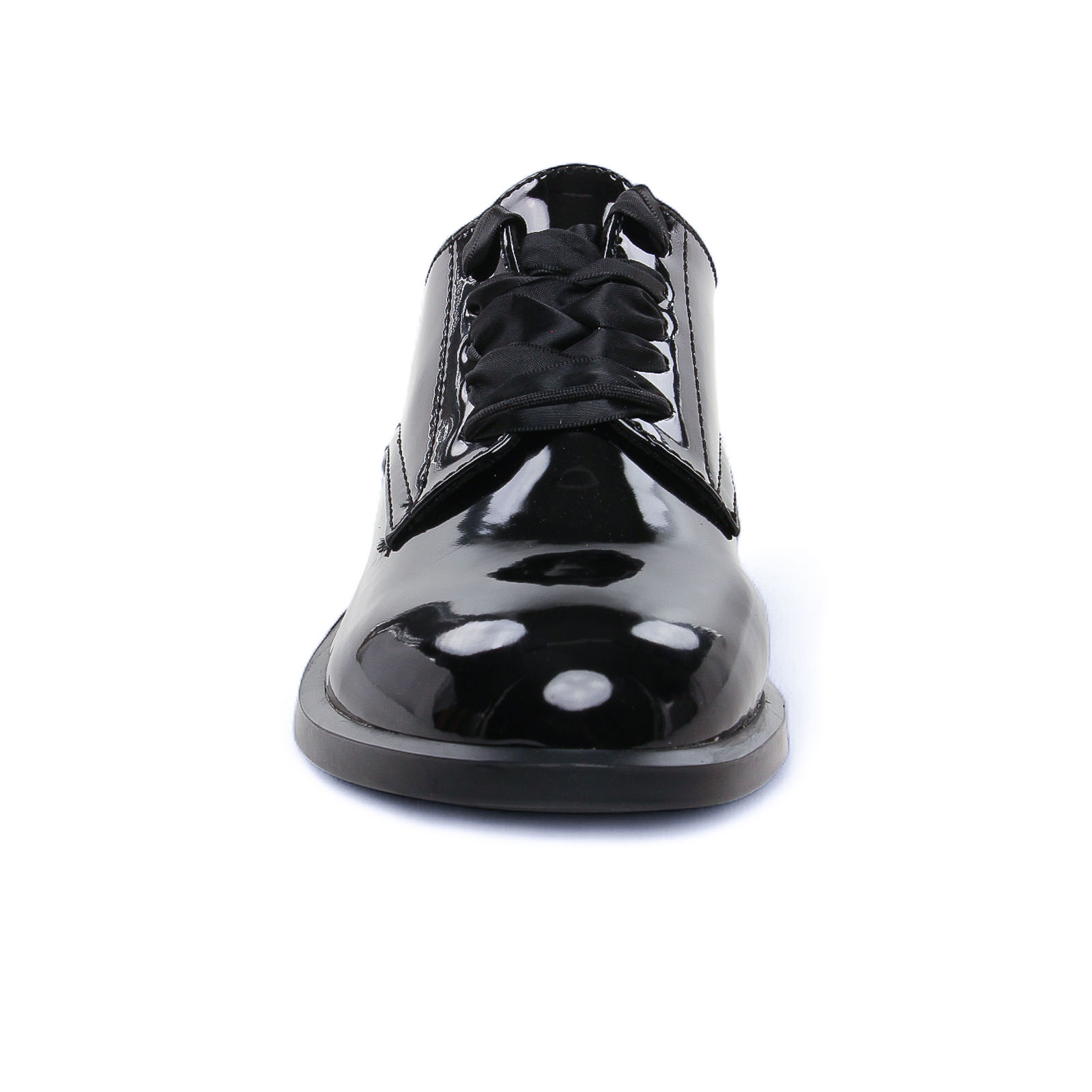 Derbies de la marque Tamaris de couleur noir. Élégantes derbies avec une tige vernis noir, des lacets ruban noir ou classique fins en coton, une première de propreté confortable nommée Touch it, talon rembourré pour plus de confort, semelle antiglisse et talon haut de 3 cm.