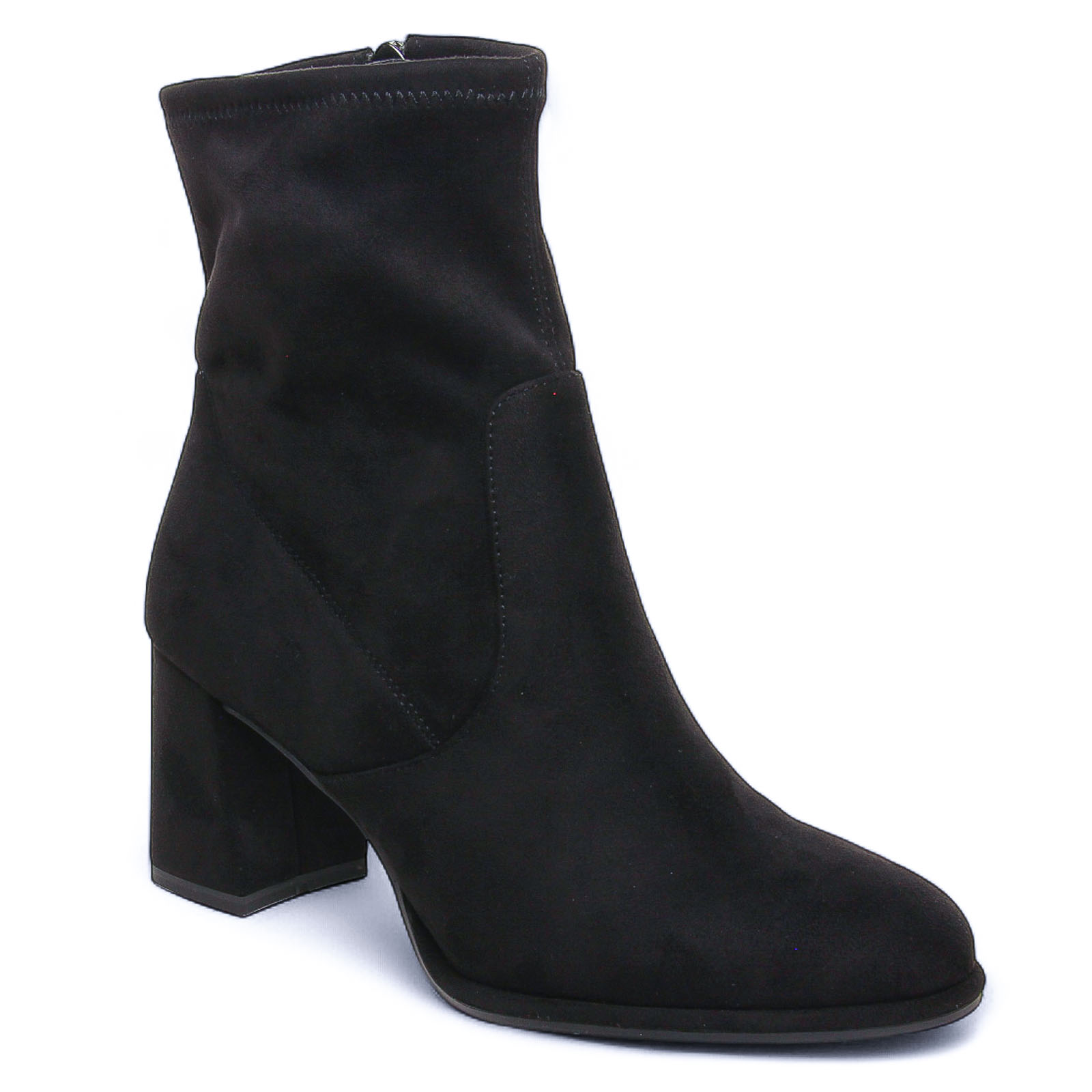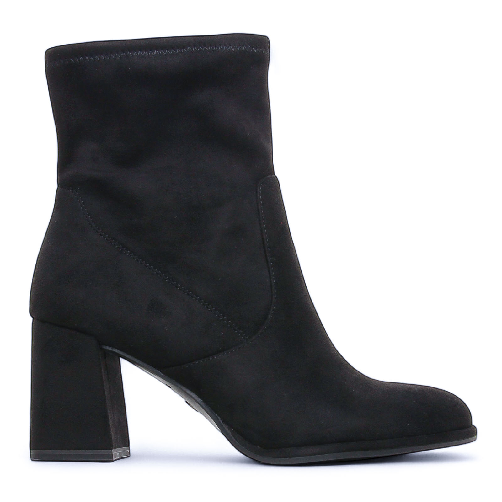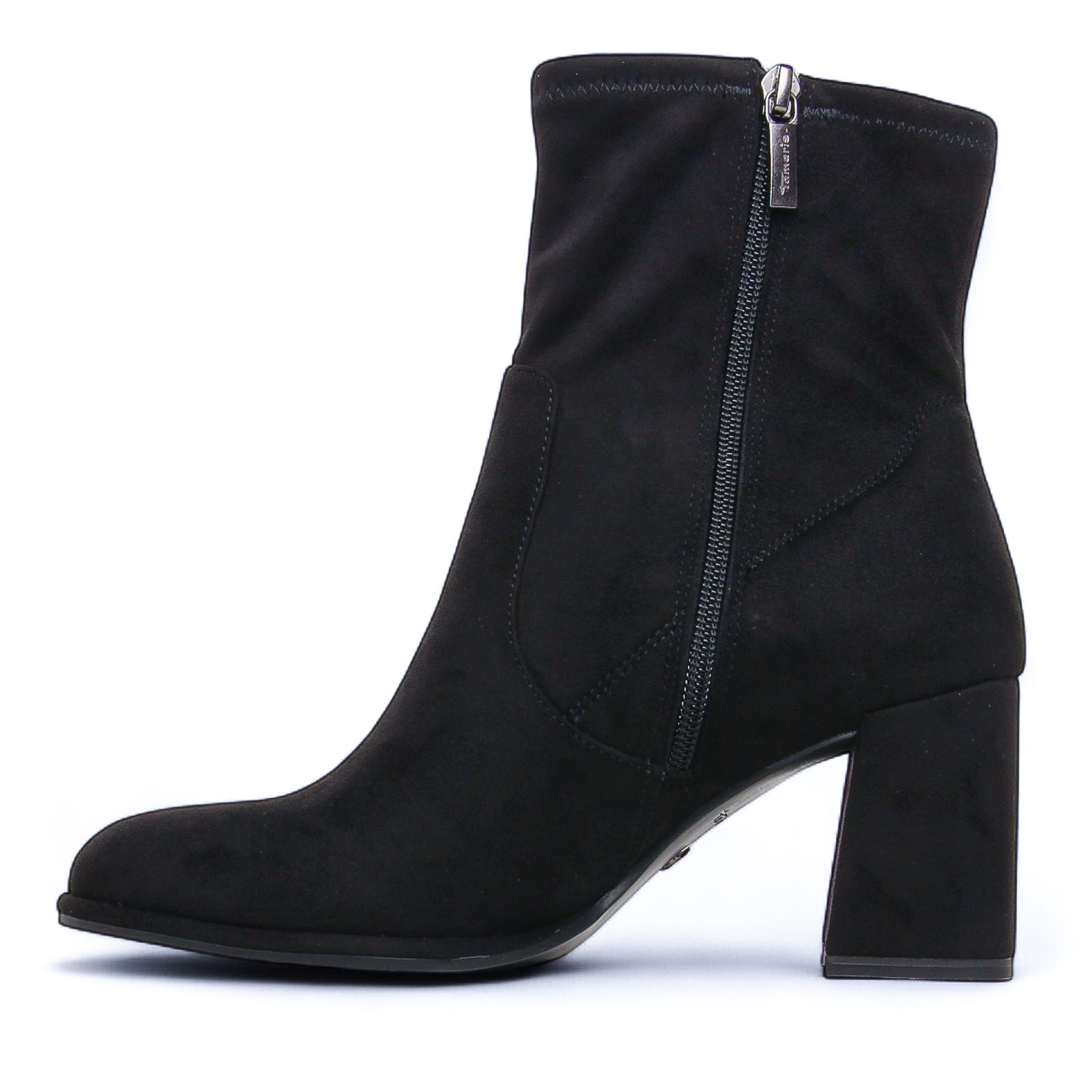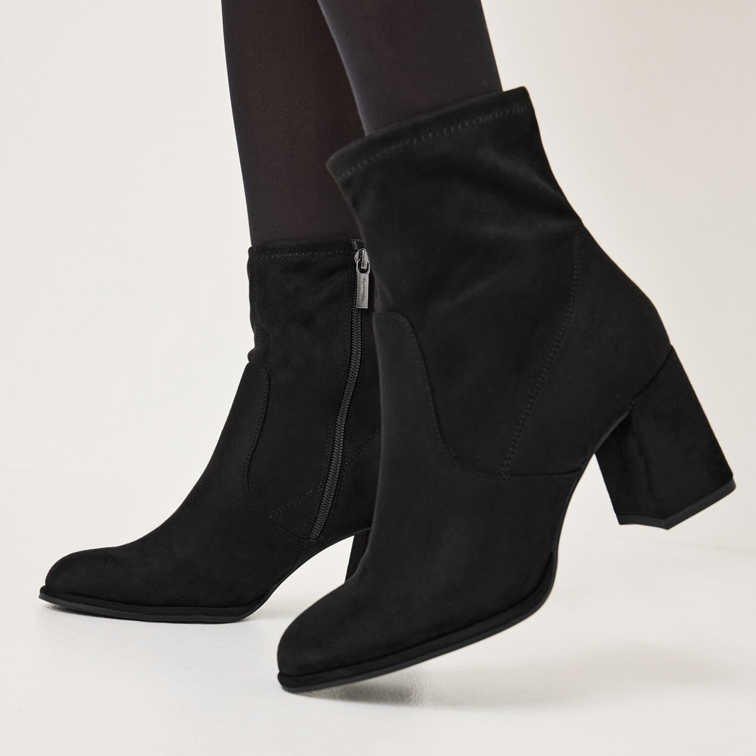 Boots Talon de la marque Tamaris de couleur noir. Sobre et chic, cette bottines en velours stretch tendance aura une place de choix dans vos tenues d'automnes hiver, un bout rond, une fermeture pratique à zip, une première confortable Touch it et un talon antichoc qui raviront les femmes en quête de confort de marche !