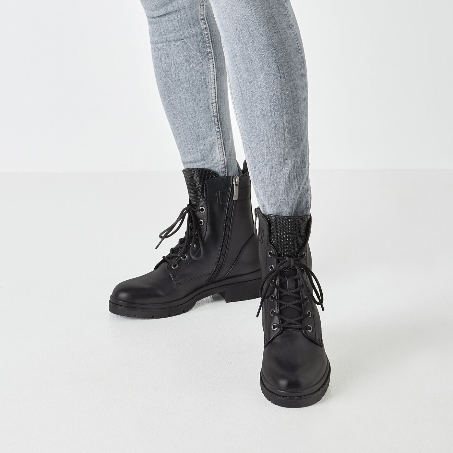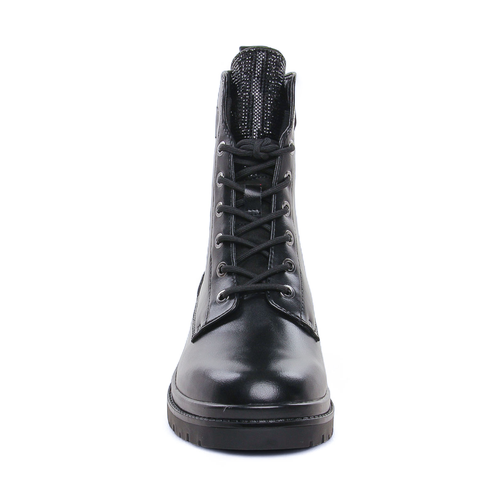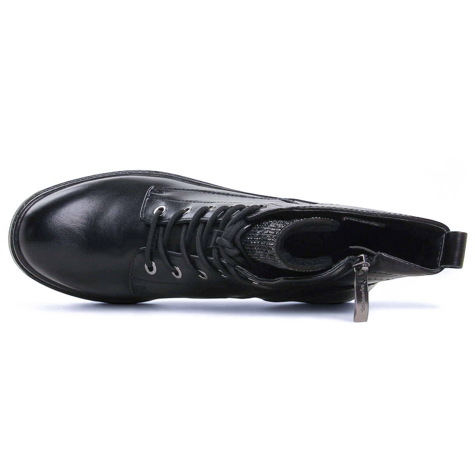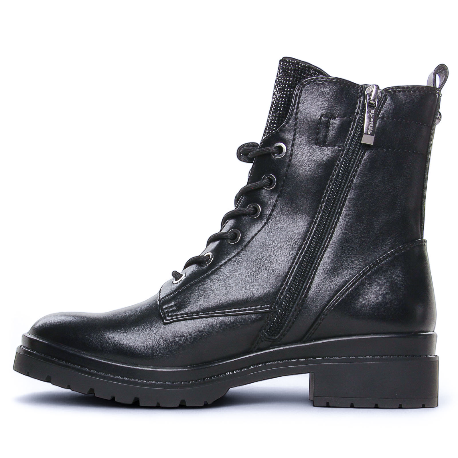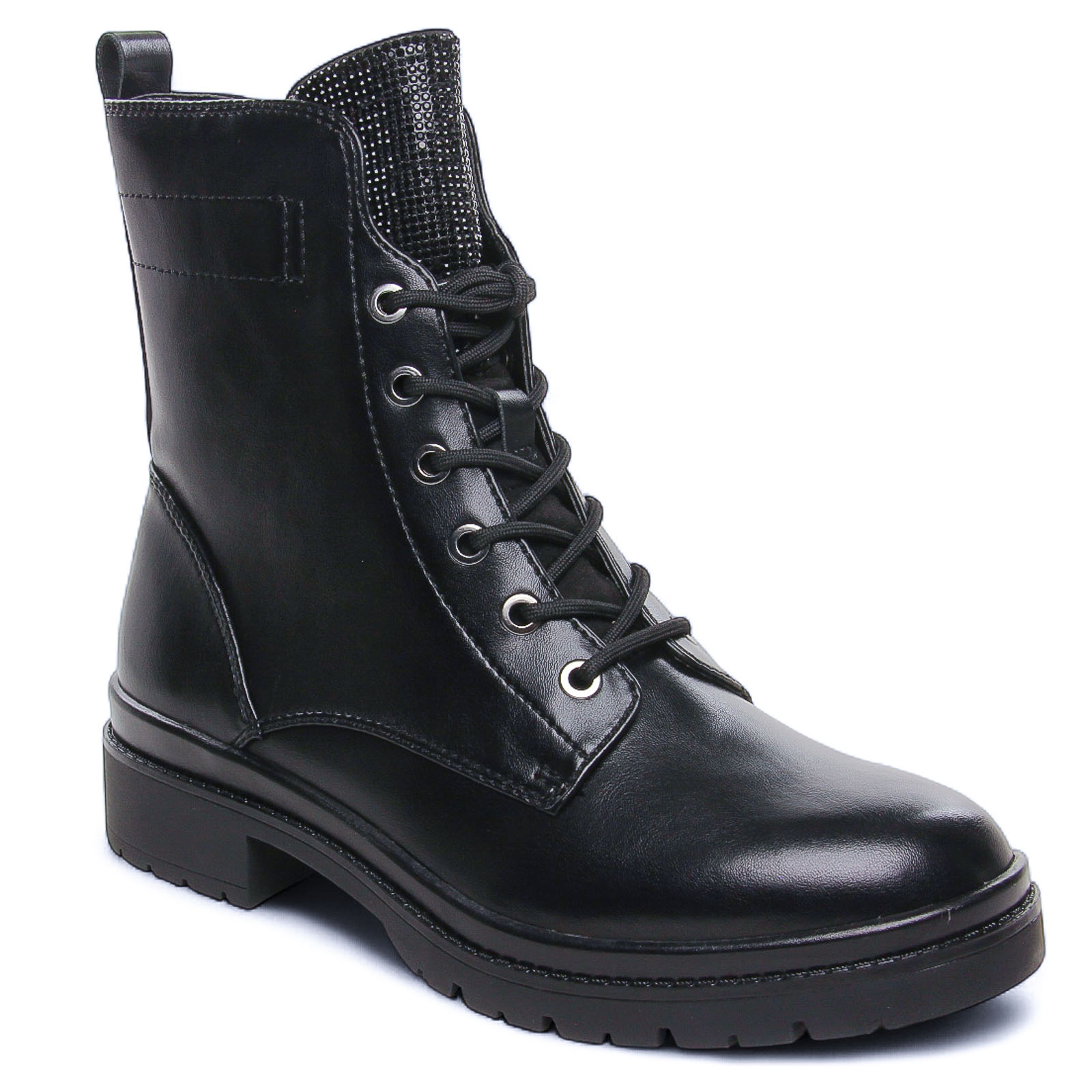 Bottines À Lacets de la marque Tamaris de couleur noir strass. Superbes bikerboots en simili cuir lisse noir de la gamme de chaussures véganes de chez Tamaris, une première ergonomique Touch it hyper confortable et amovible si besoin, bottines glam'rock ornées de strass type clous sur sa languette, bottines Tamaris qui reviennent pour cette nouvelle collection automne hiver.