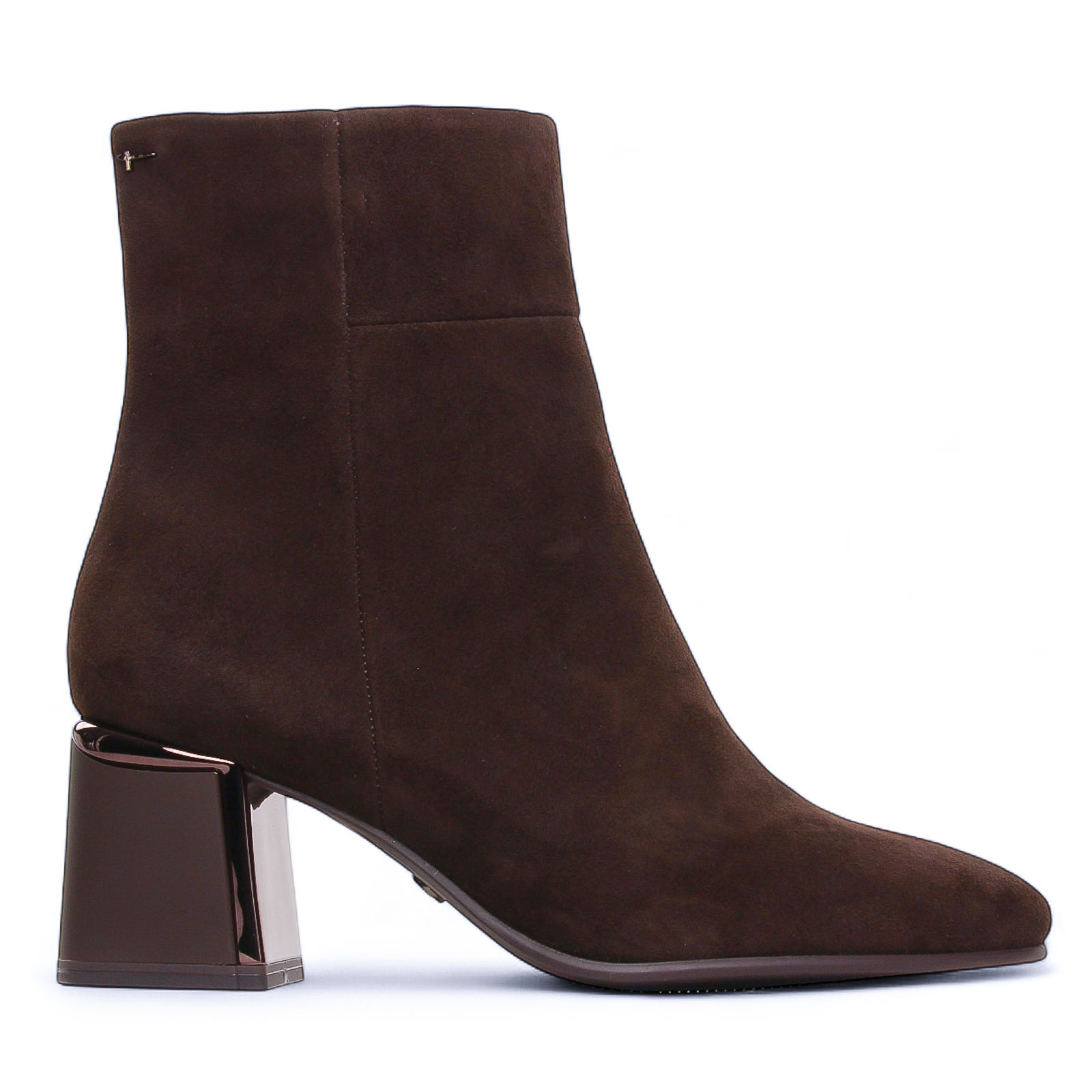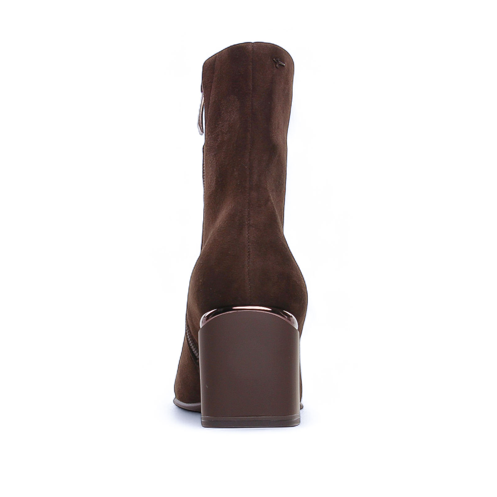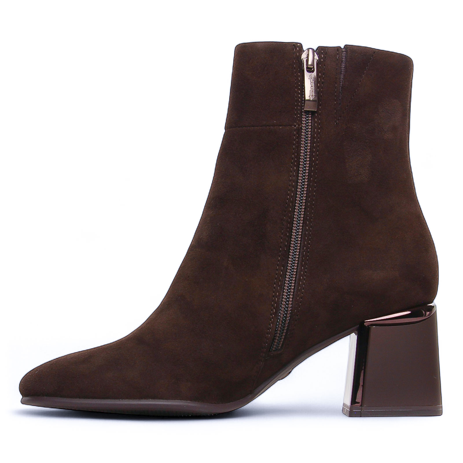 Boots Talon de la marque Tamaris de couleur mocca. Superbes et élégantes boots en cuir, une tige en velours nubuck dans une teinte mocca, un bout rond et un talon bloc original avec son empiècement métallisé, pour le confort un talon antichoc, une semelle souple souple antiglisse et une première Touch It hyper confortable !