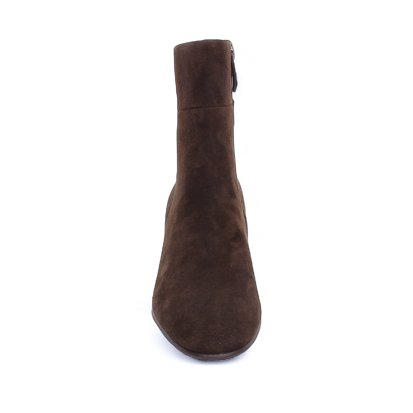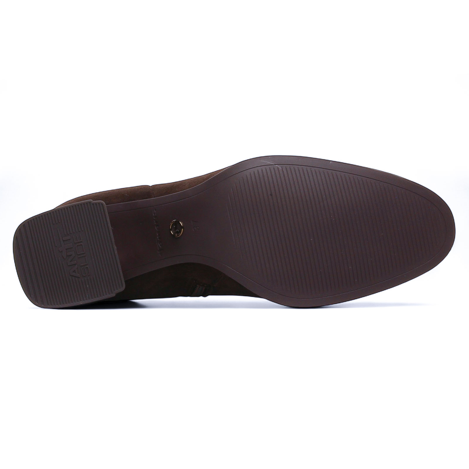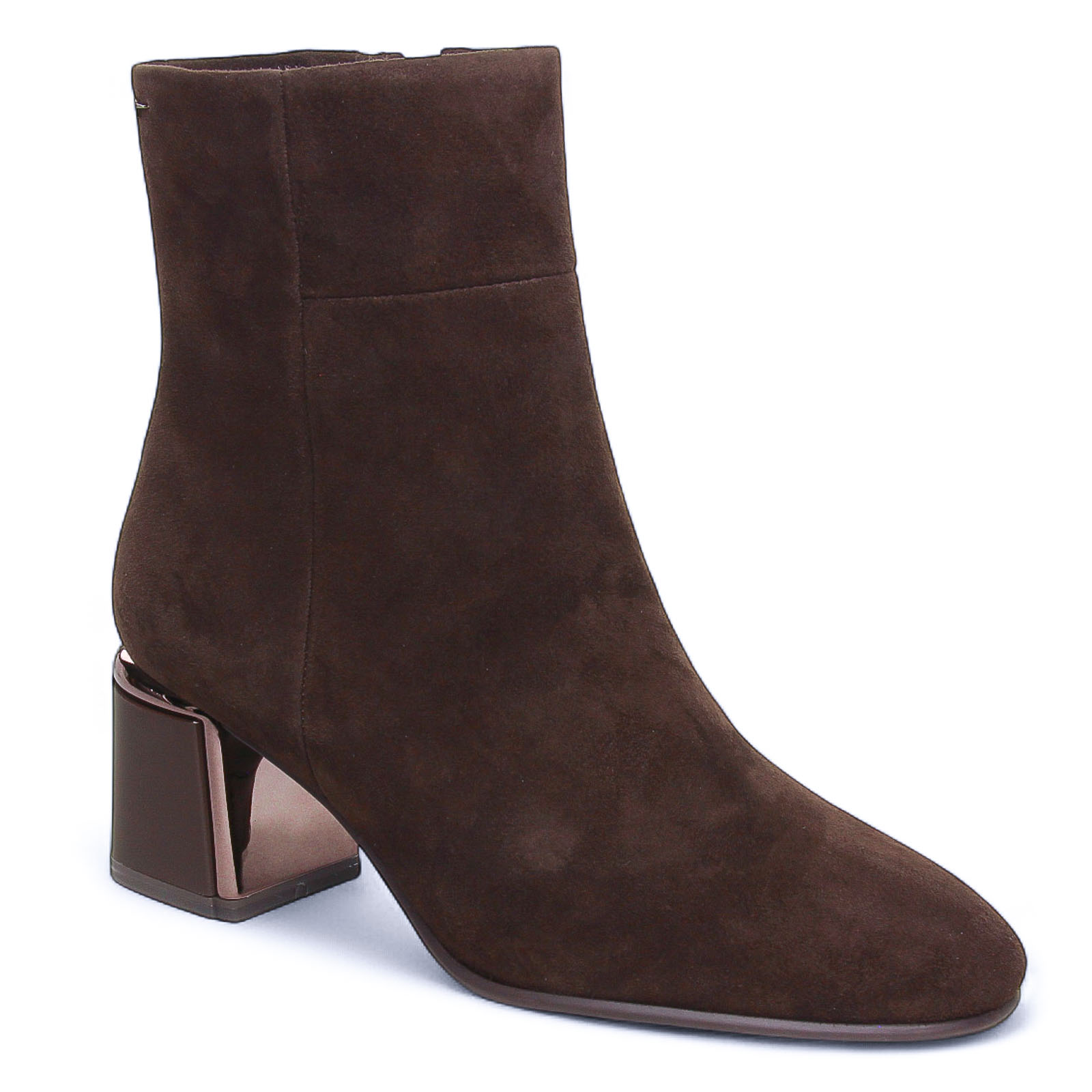 Boots Talon de la marque Tamaris de couleur mocca. Superbes et élégantes boots en cuir, une tige en velours nubuck dans une teinte mocca, un bout rond et un talon bloc original avec son empiècement métallisé, pour le confort un talon antichoc, une semelle souple souple antiglisse et une première Touch It hyper confortable !