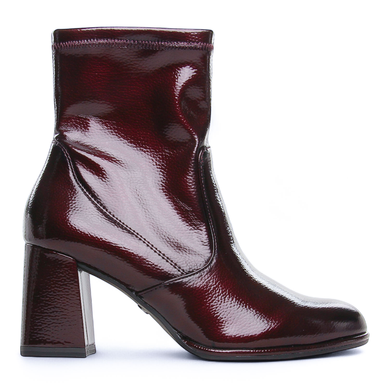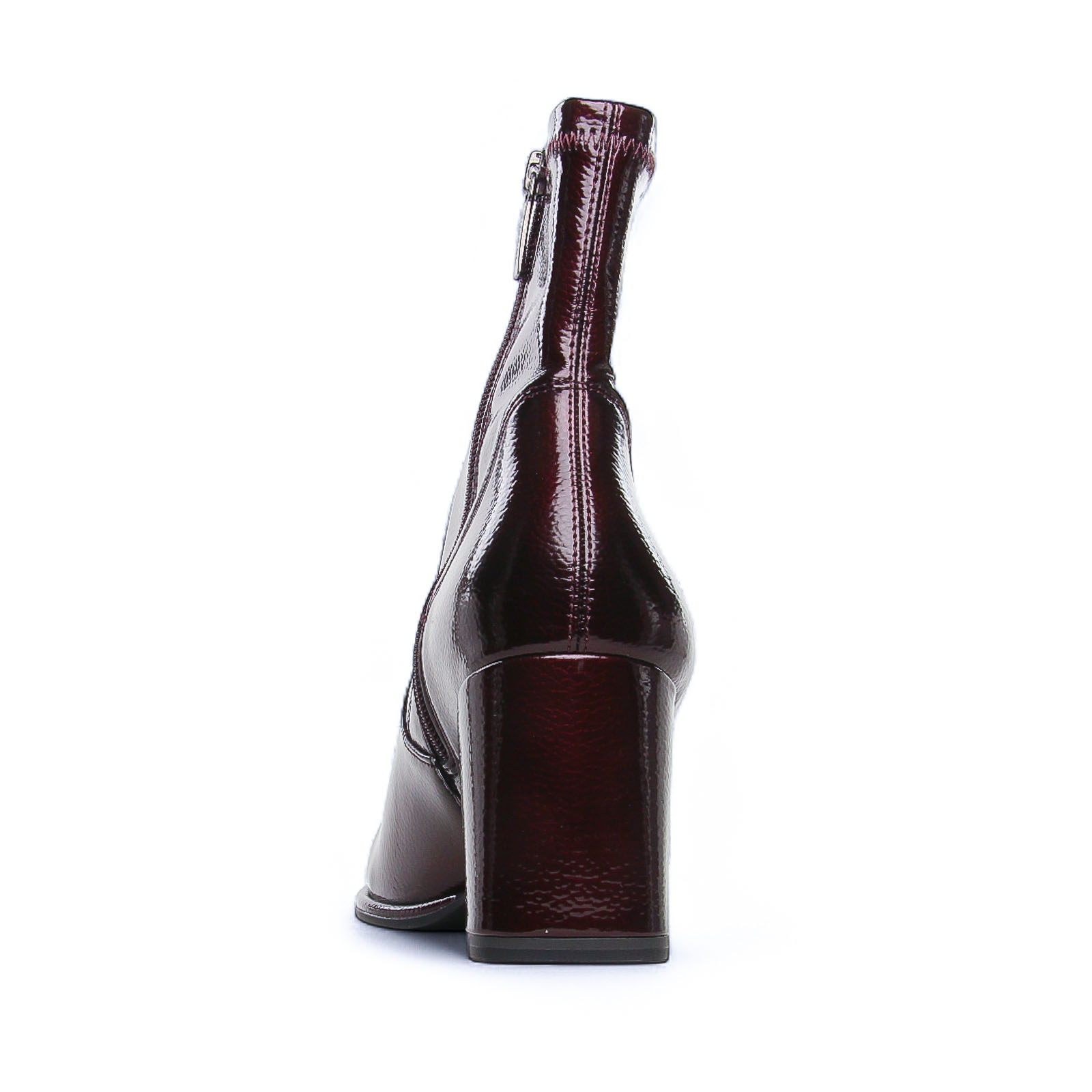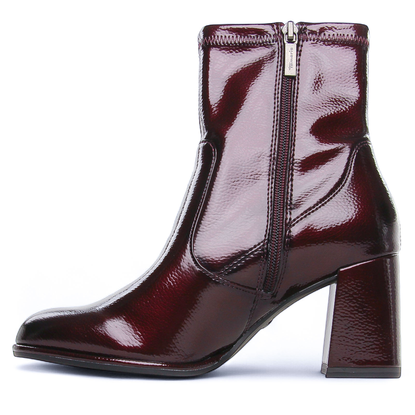 Boots Talon de la marque Tamaris de couleur bordeaux. Un simili cuir synthétique vernis habillement cousues, un zip sur le coté intérieur, un talon haut de 7.5 cm et une semelle anti-glisse, élégantes et glamours craquez pour ces boots vernis à talon haut à un prix plus que raisonnable, collection Vegan de chez Tamaris automne hiver 2025.