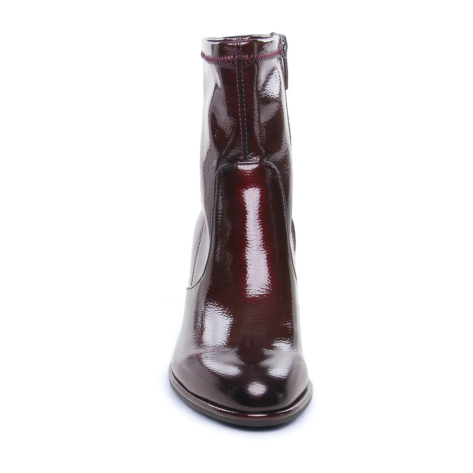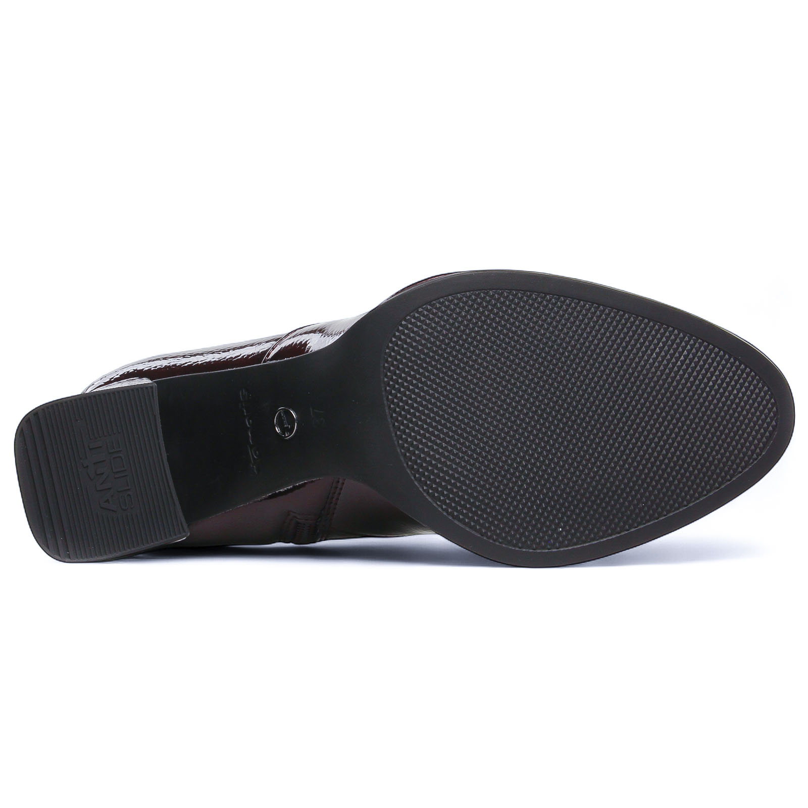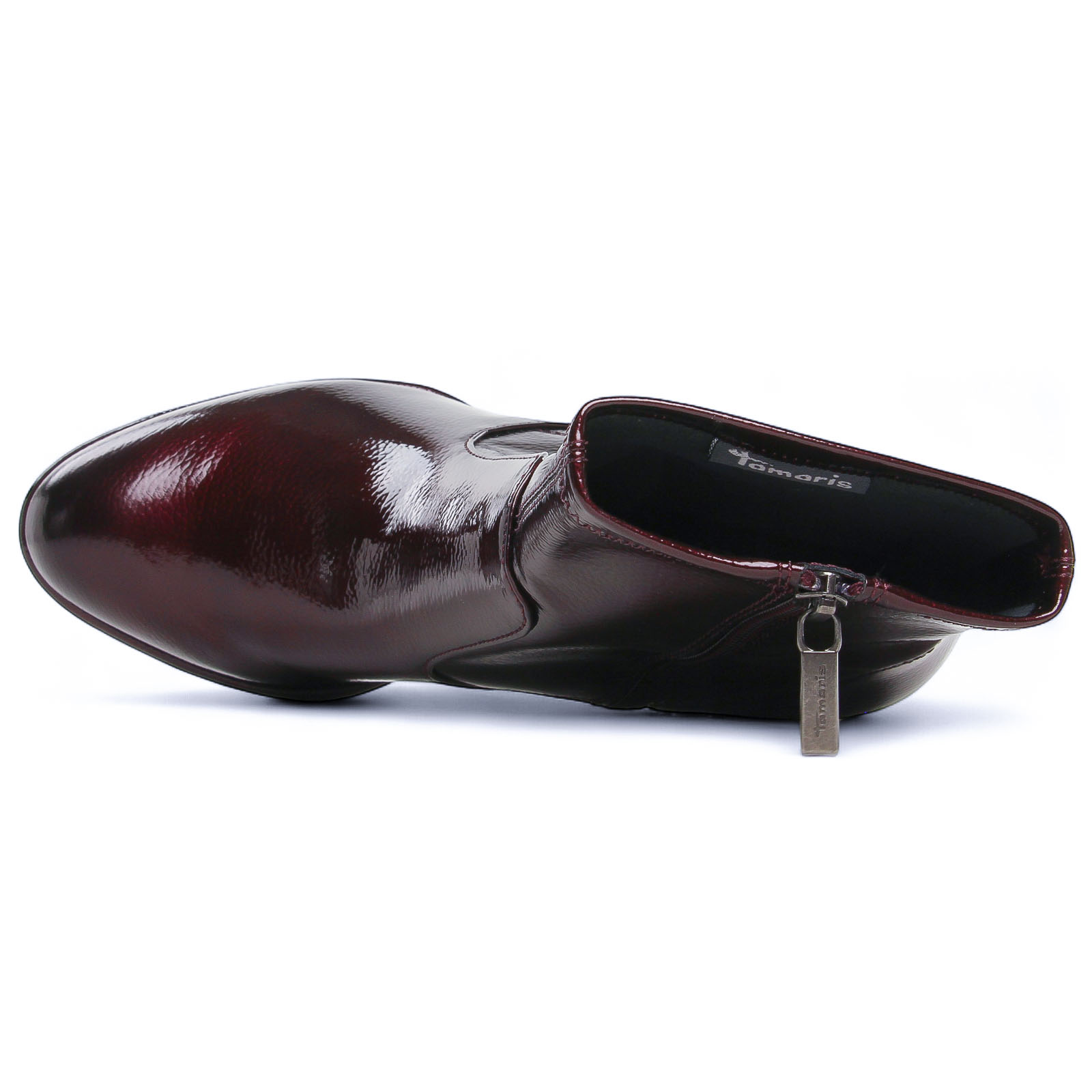 Boots Talon de la marque Tamaris de couleur bordeaux. Un simili cuir synthétique vernis habillement cousues, un zip sur le coté intérieur, un talon haut de 7.5 cm et une semelle anti-glisse, élégantes et glamours craquez pour ces boots vernis à talon haut à un prix plus que raisonnable, collection Vegan de chez Tamaris automne hiver 2025.