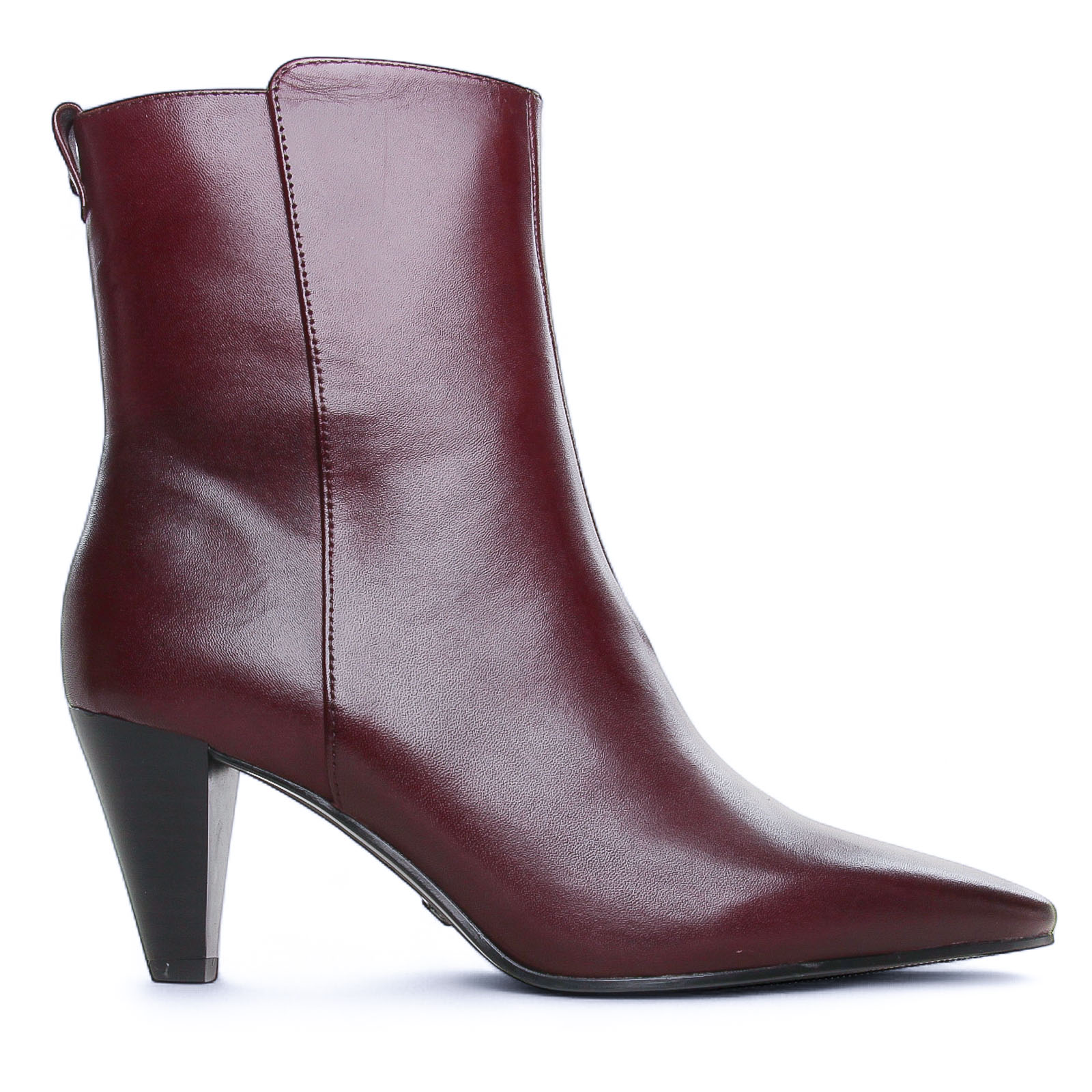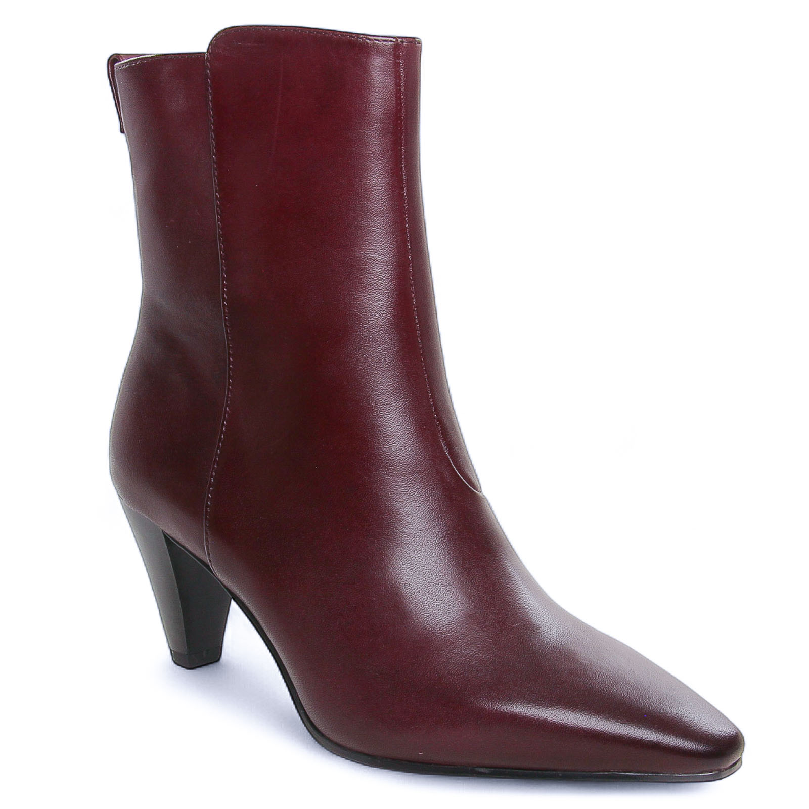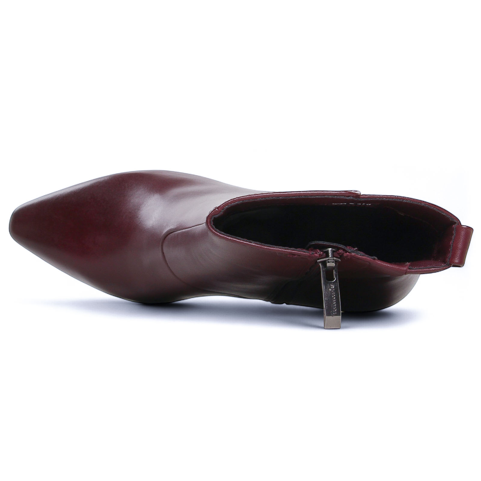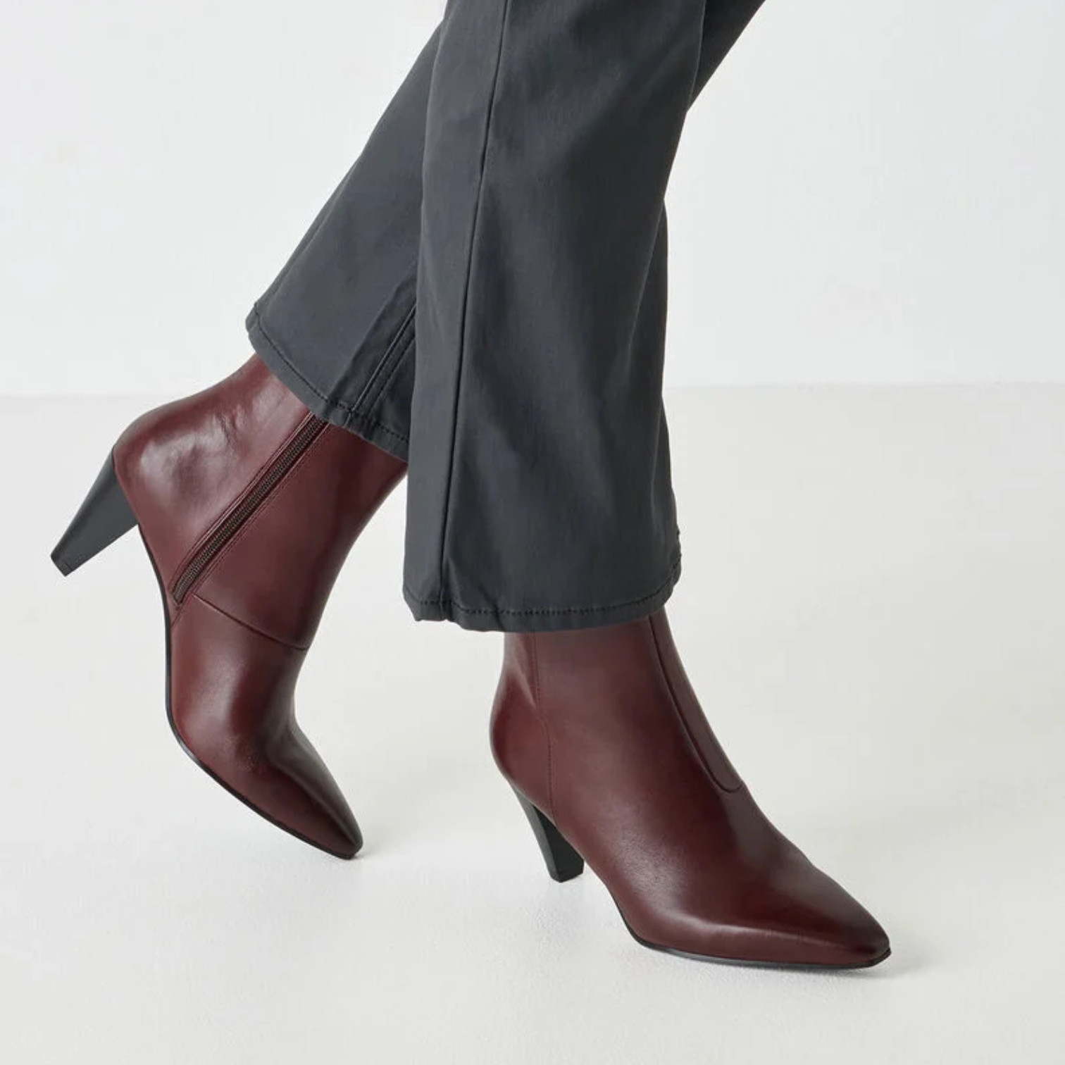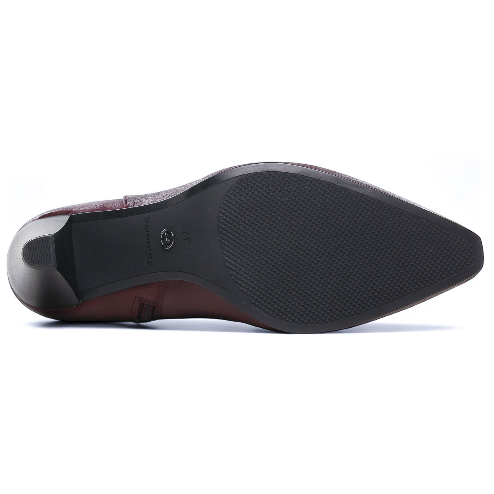 Boots Talon de la marque Tamaris de couleur bordeaux. Lignes fines et un bout pointu pour ces magnifiques bottines à tige haute en cuir lisse de couleur bordeaux, une doublure textile, boots confortables avec sa première Touch It et son talon antichoc, bottine nouvelle collection Tamaris automne hiver 2025.