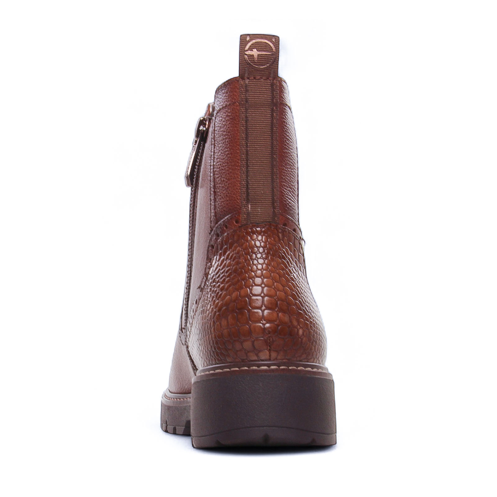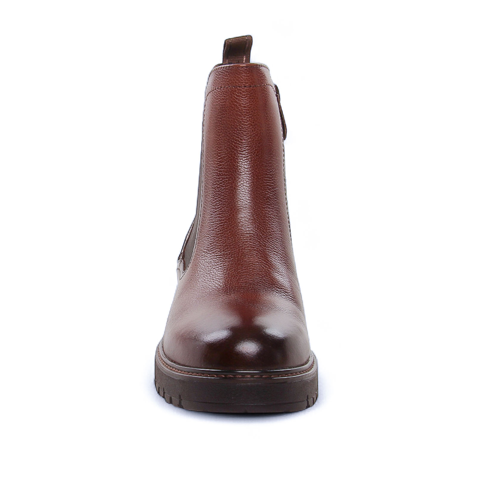 Boots Élastiquées de la marque Tamaris de couleur marron. Une tige cuir gros grain avec une semelle épaisse noire crantée débordante pour ajouter une touche moderne et rock au style classique chic de la boots Chelsea, bottine à tige haute doublée polaire, une tige en cuir noir ou marron cognac, un contrefort en simili croco, ces jolies bottines Chelsea reviennent pour cette nouvelle collection automne hiver 2025 de la marque allemande Tamaris.