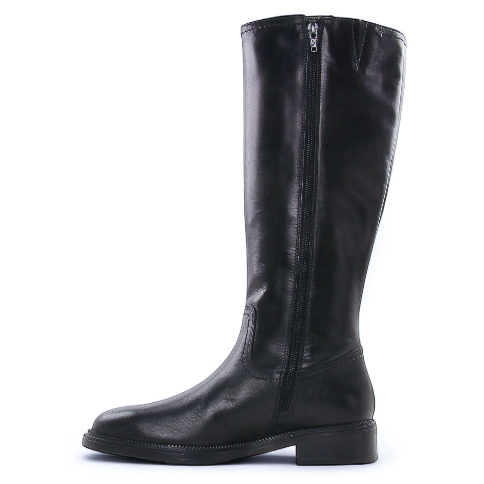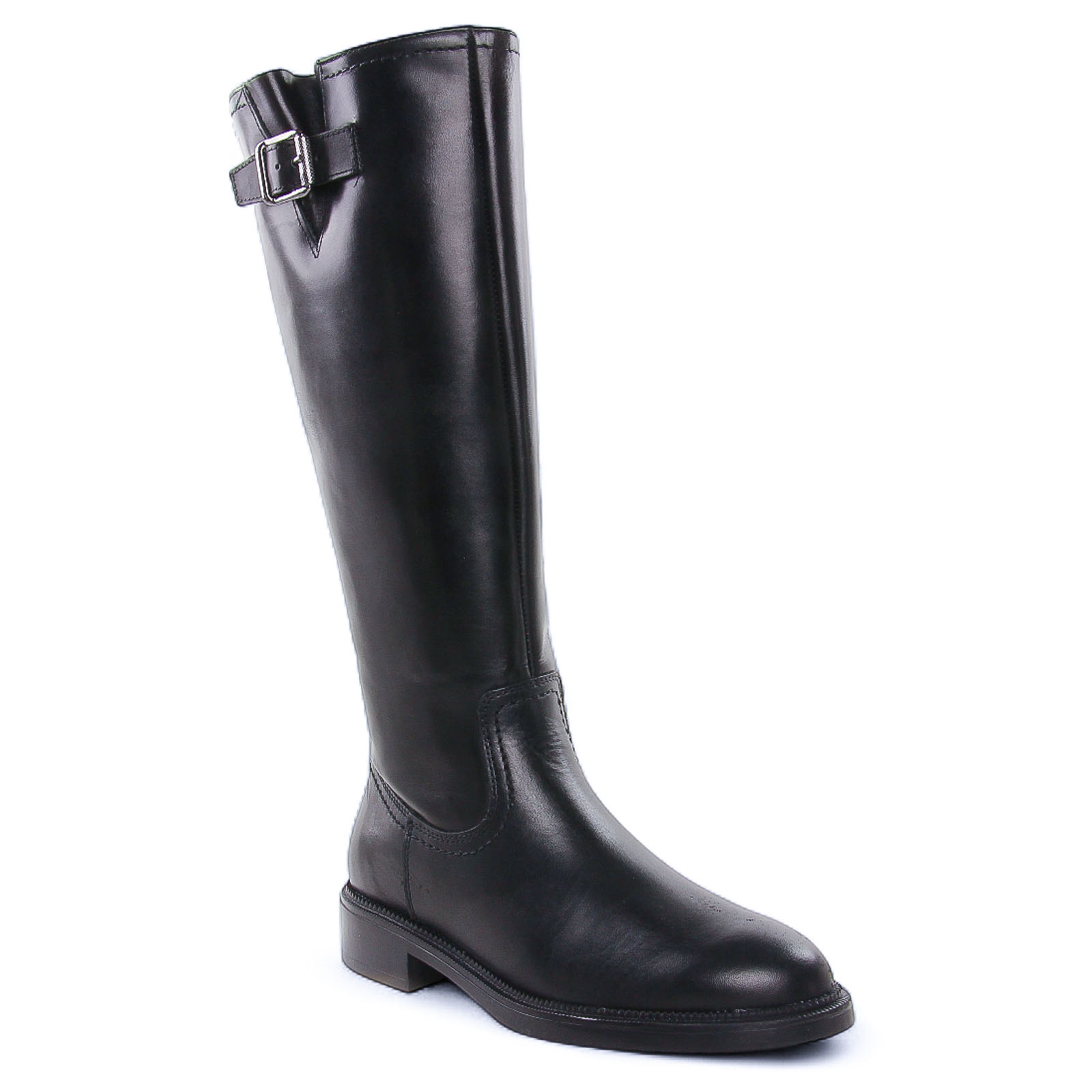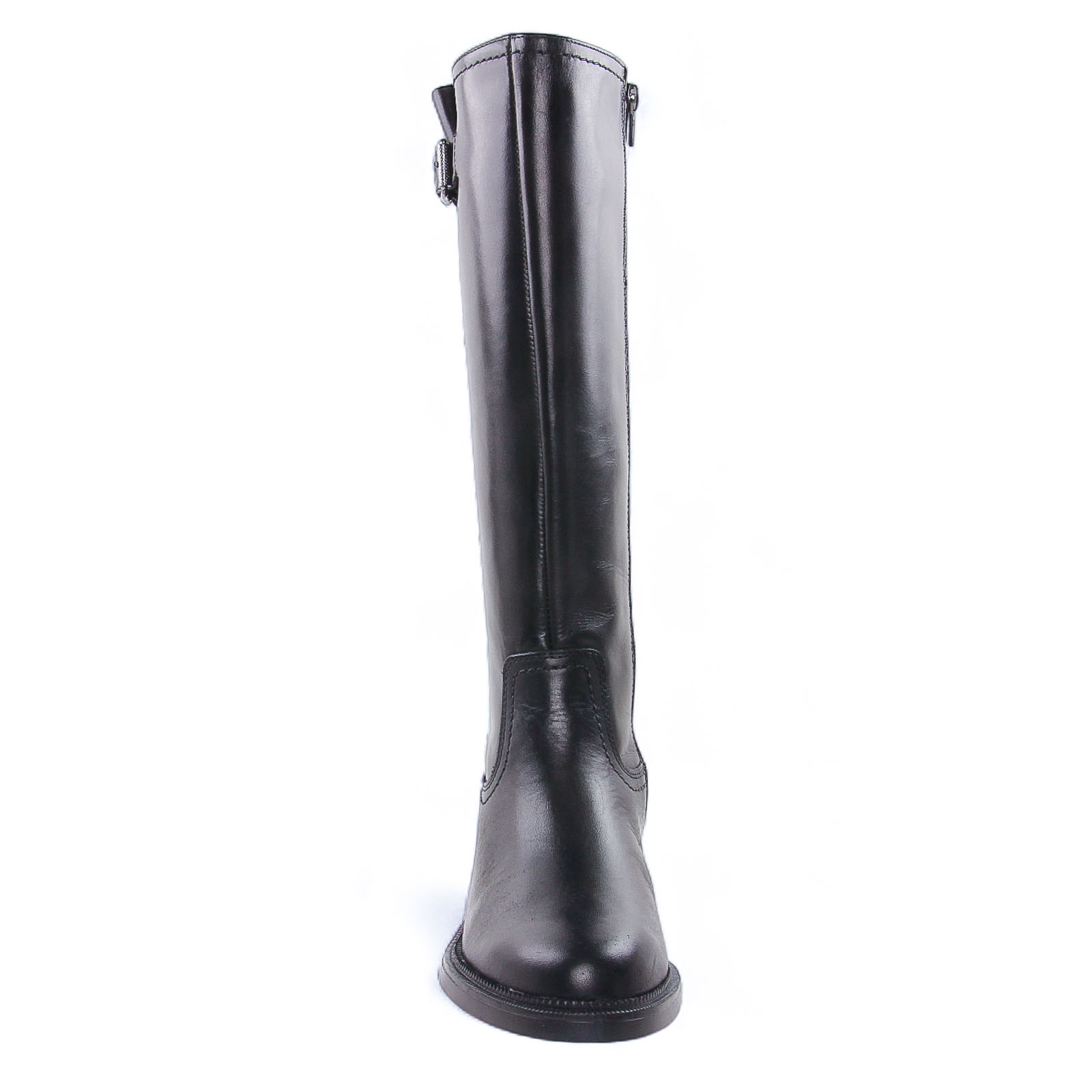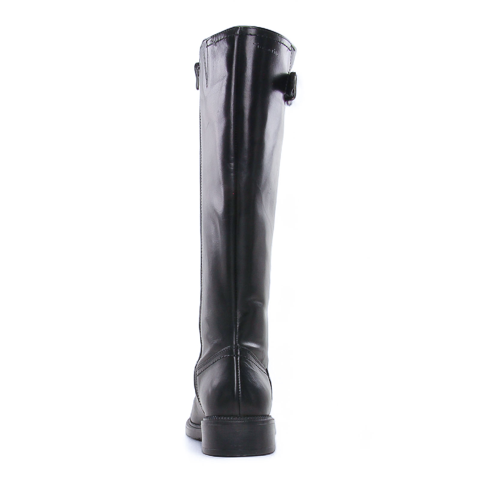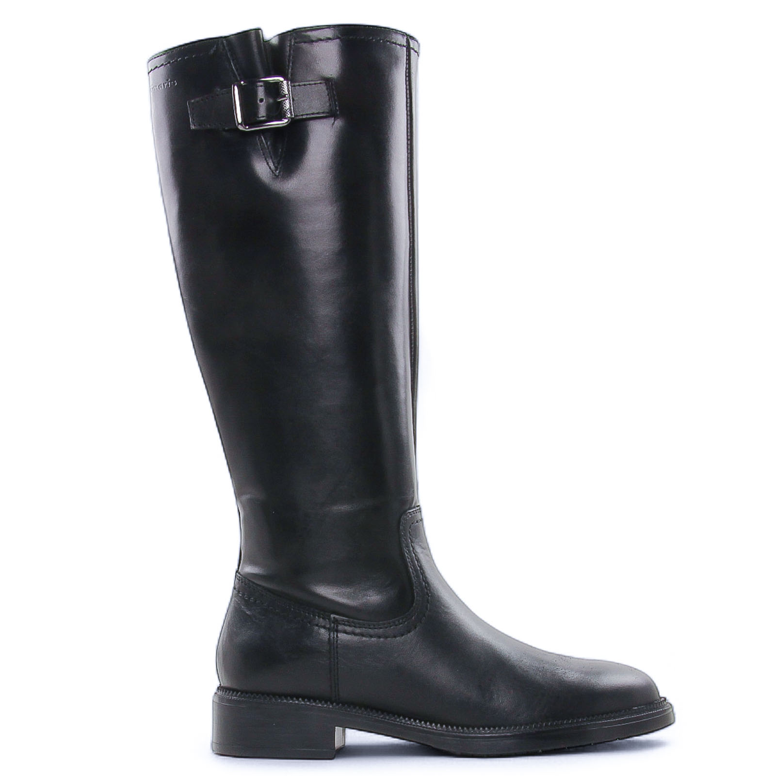Bottes de la marque Tamaris de couleur noir. Superbes bottes en cuir noir, un beau cuir lisse, une tige haute hauteur 36cm au dessus du coup de pied, une boucle métal argenté fantaisie en haut de la tige, une première de propreté confort Touch it à mémoire de forme.