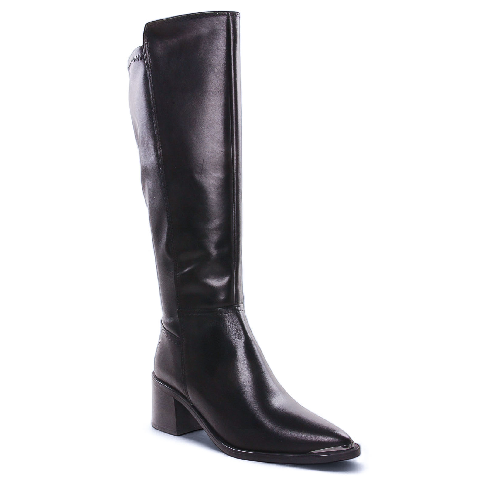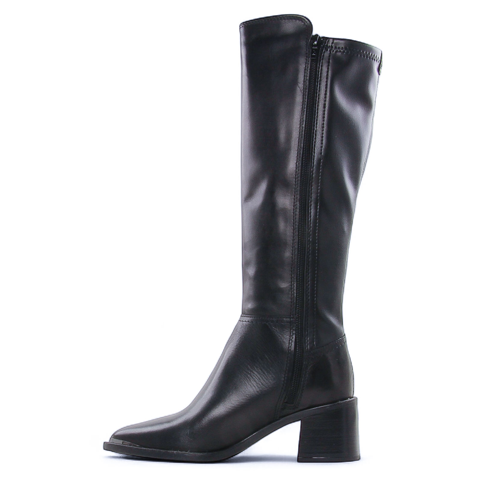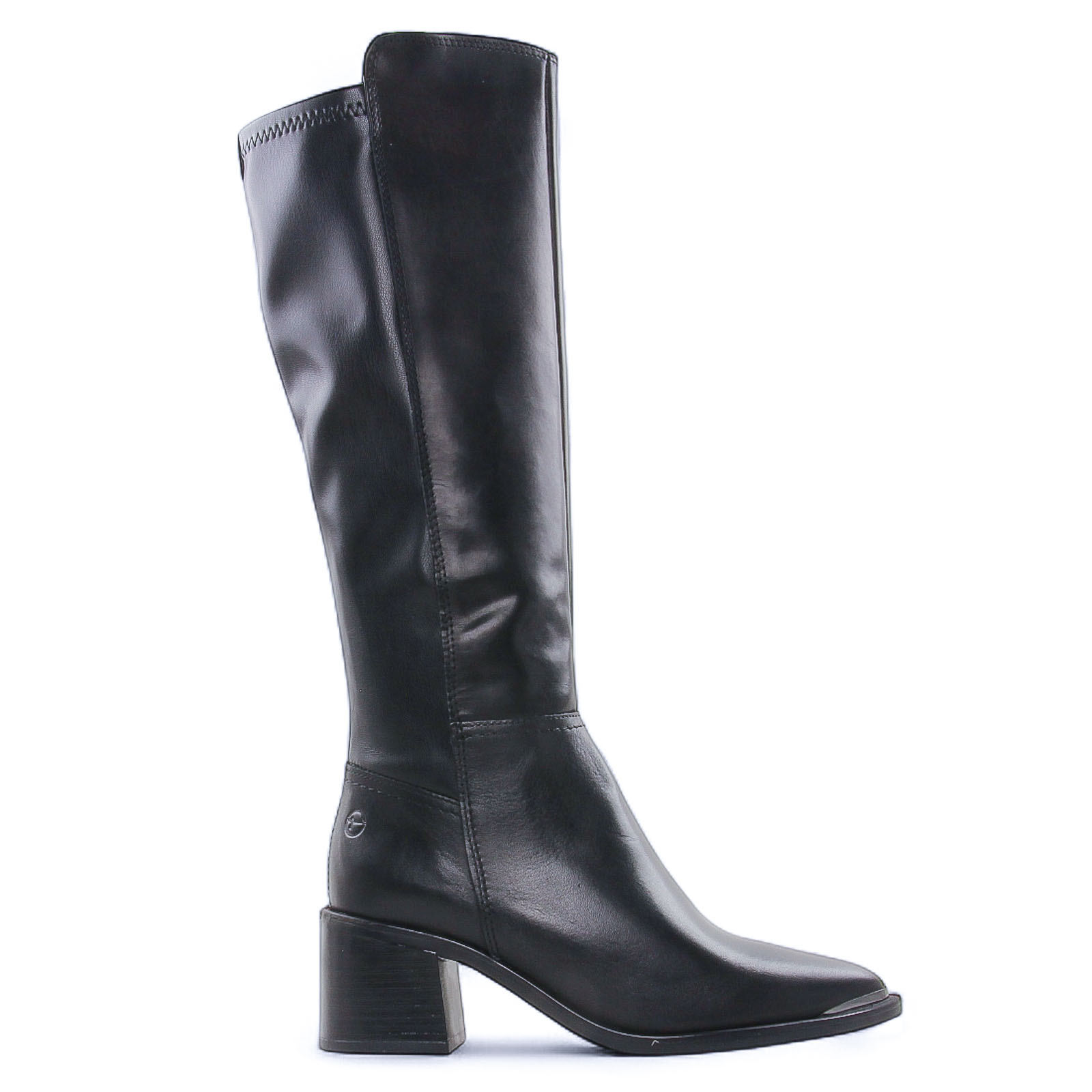 Bottes Stretch de la marque Tamaris de couleur noir. Tige stretch à l'arrière et en cuir à l'avant, un bout pointu pour plus une féminité affirmée, talon Anti-shokk pour une botte confort même avec un talon haut de 6 cm, une doublure et première textile.