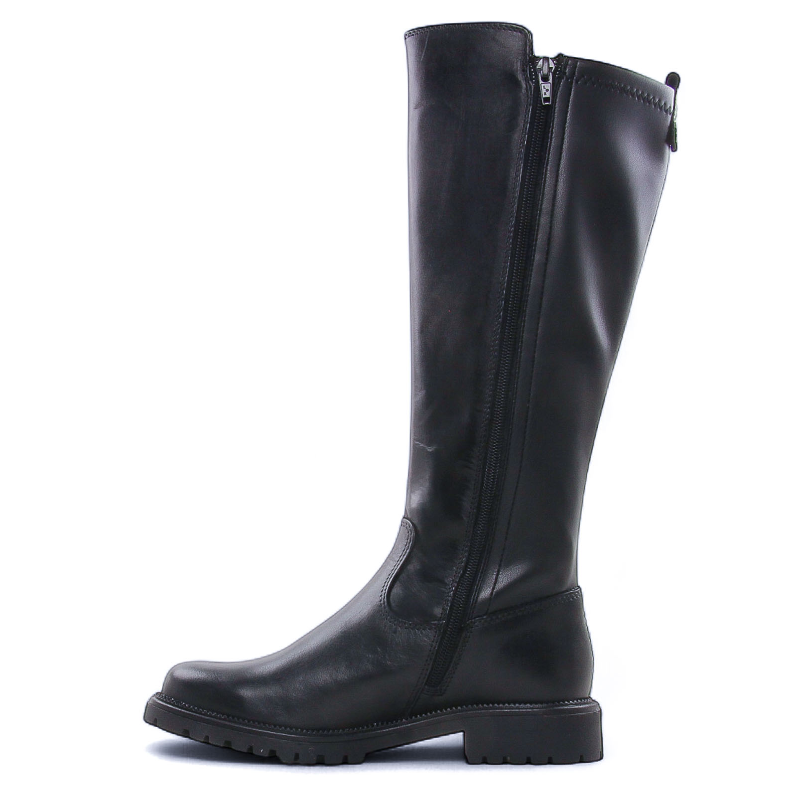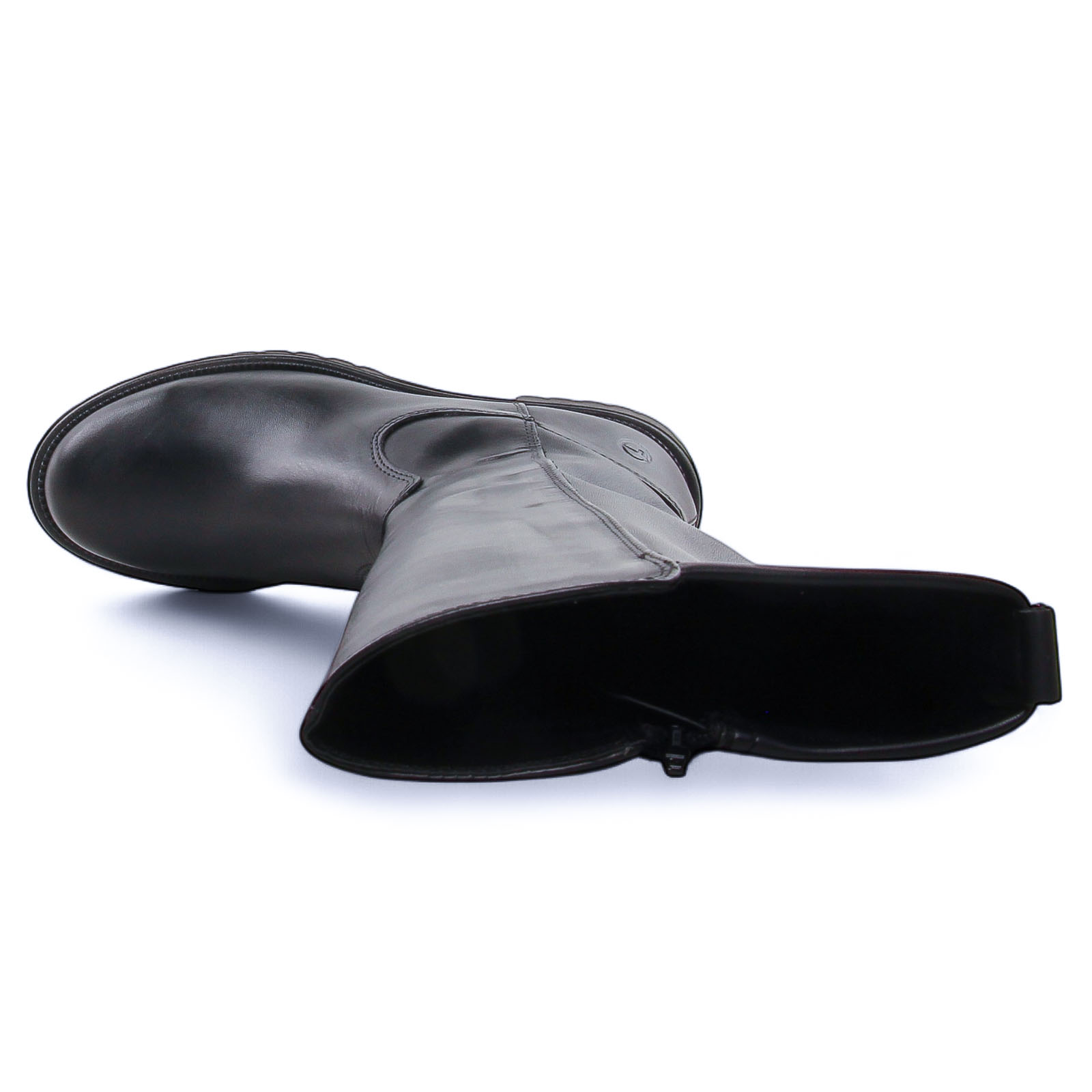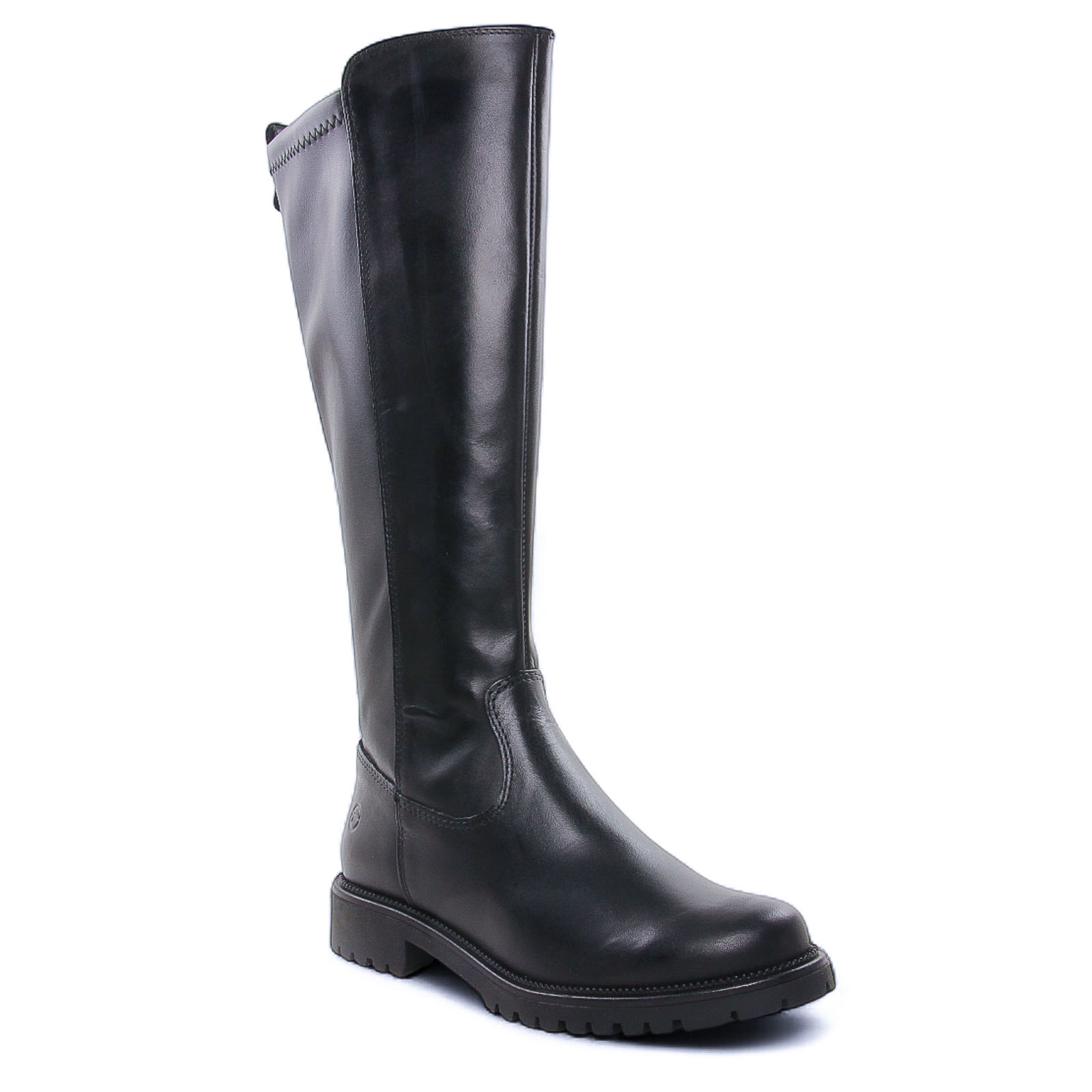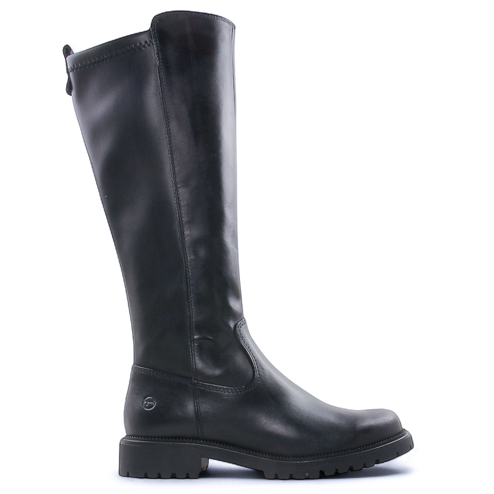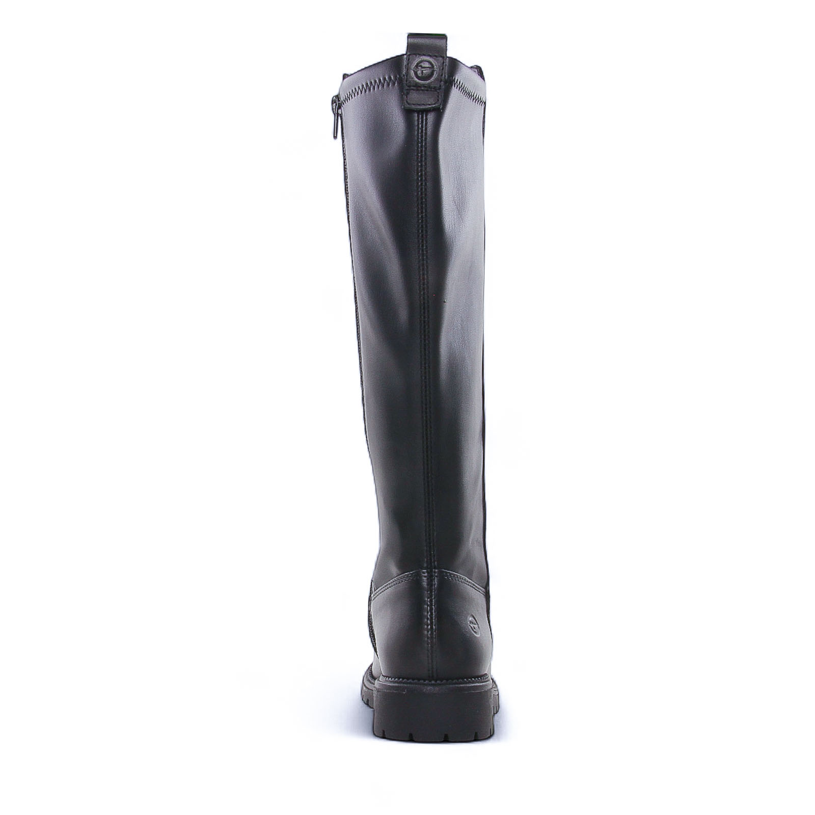 Bottes de la marque Tamaris de couleur noir. Bottes casual Tamaris nouvelle collection hiver 2025, tige haute de 36 cm environ au dessus du coup de pied, botte avec une tige bi-matiere cuir et stretch à l'arrière du mollet, une première de propreté Touch it confortable et semelle robuste en gomme souple, un petit talon bloc de 3 cm de hauteur.