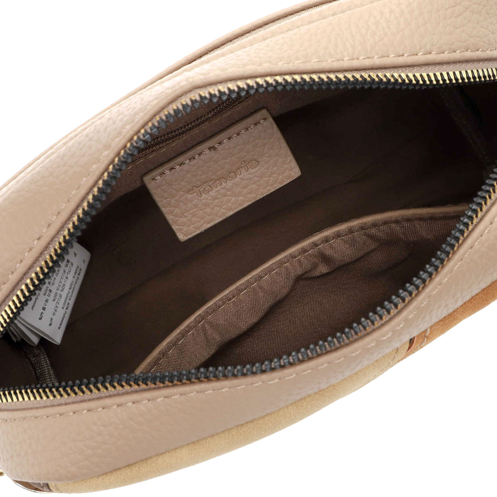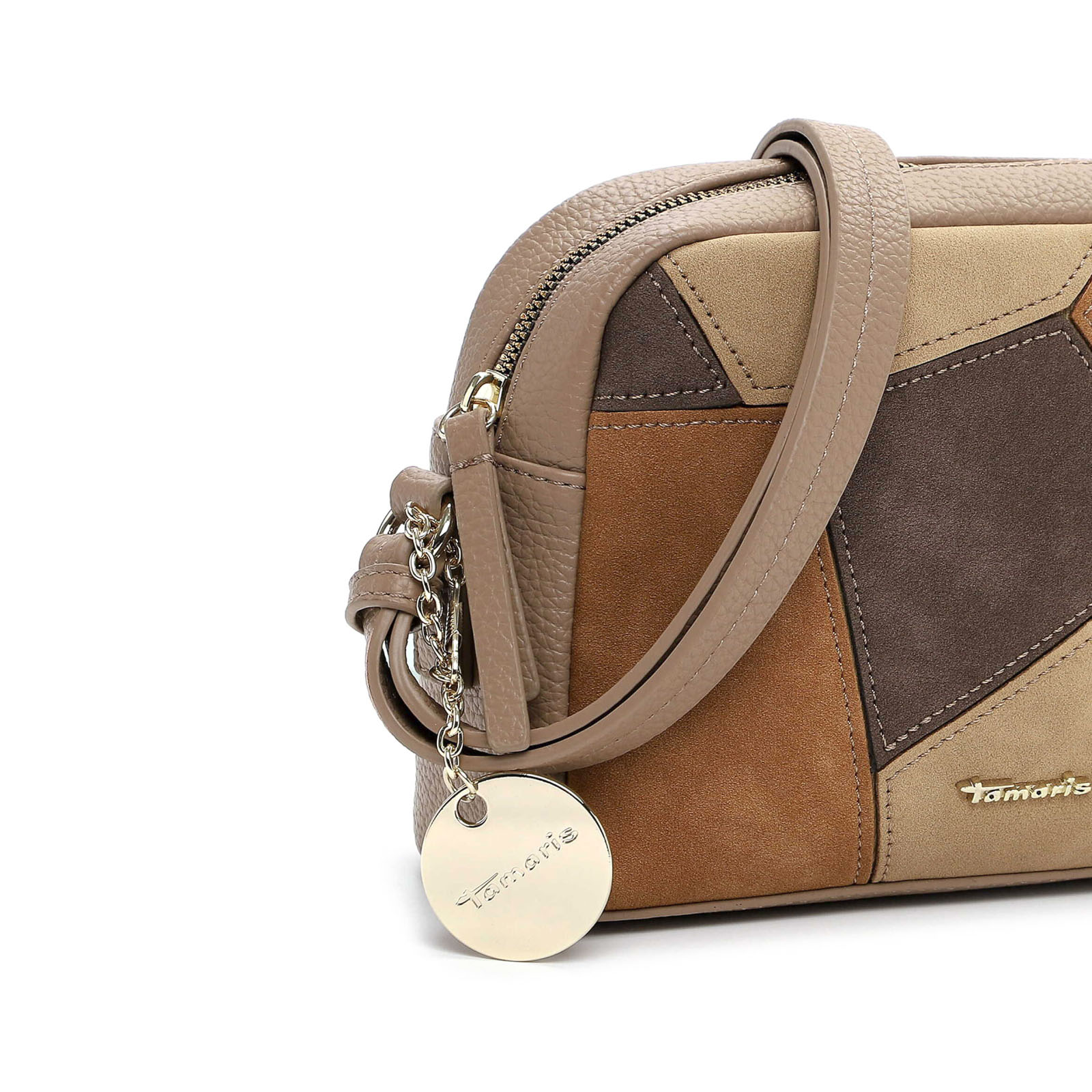 Sac À Main de la marque Tamaris de couleur marron. Petit sac à bandoulière avec un design style patchwork dans des teintes automnales mariant un simili nubuck et un simili cuir, un sac élégant avec une bandoulière de 140 cm, un petit prix pour beaucoup de style, merci Tamaris !