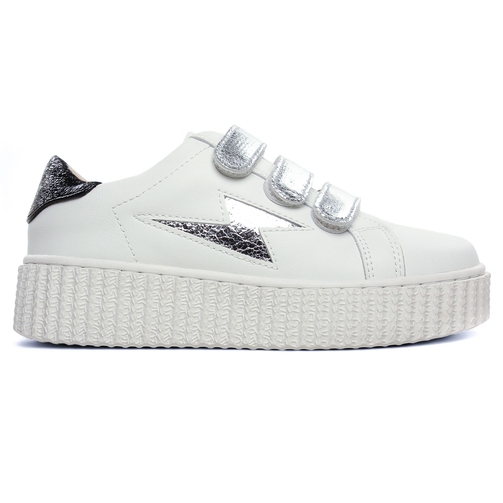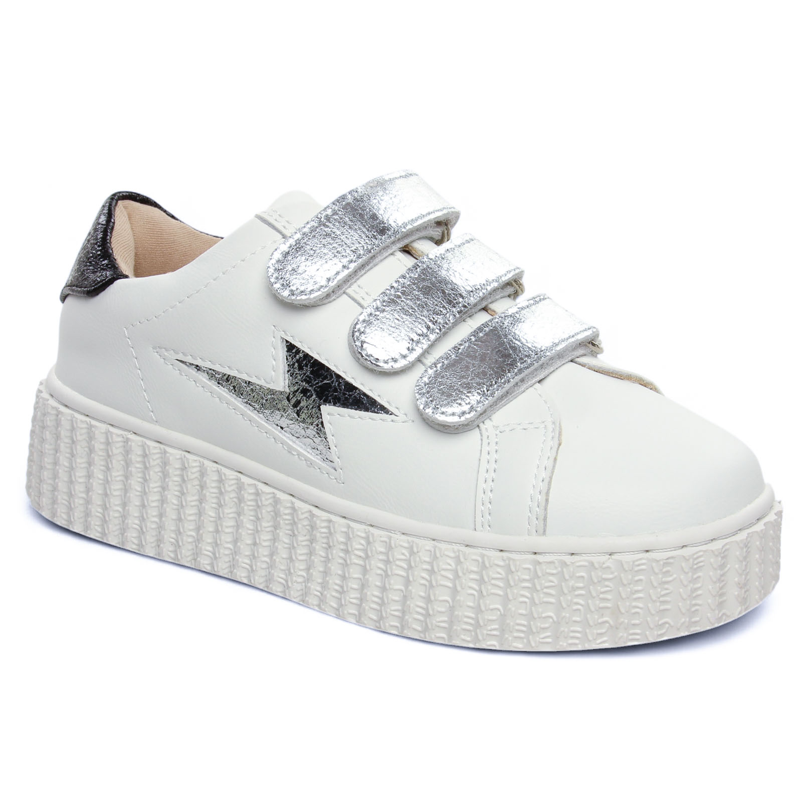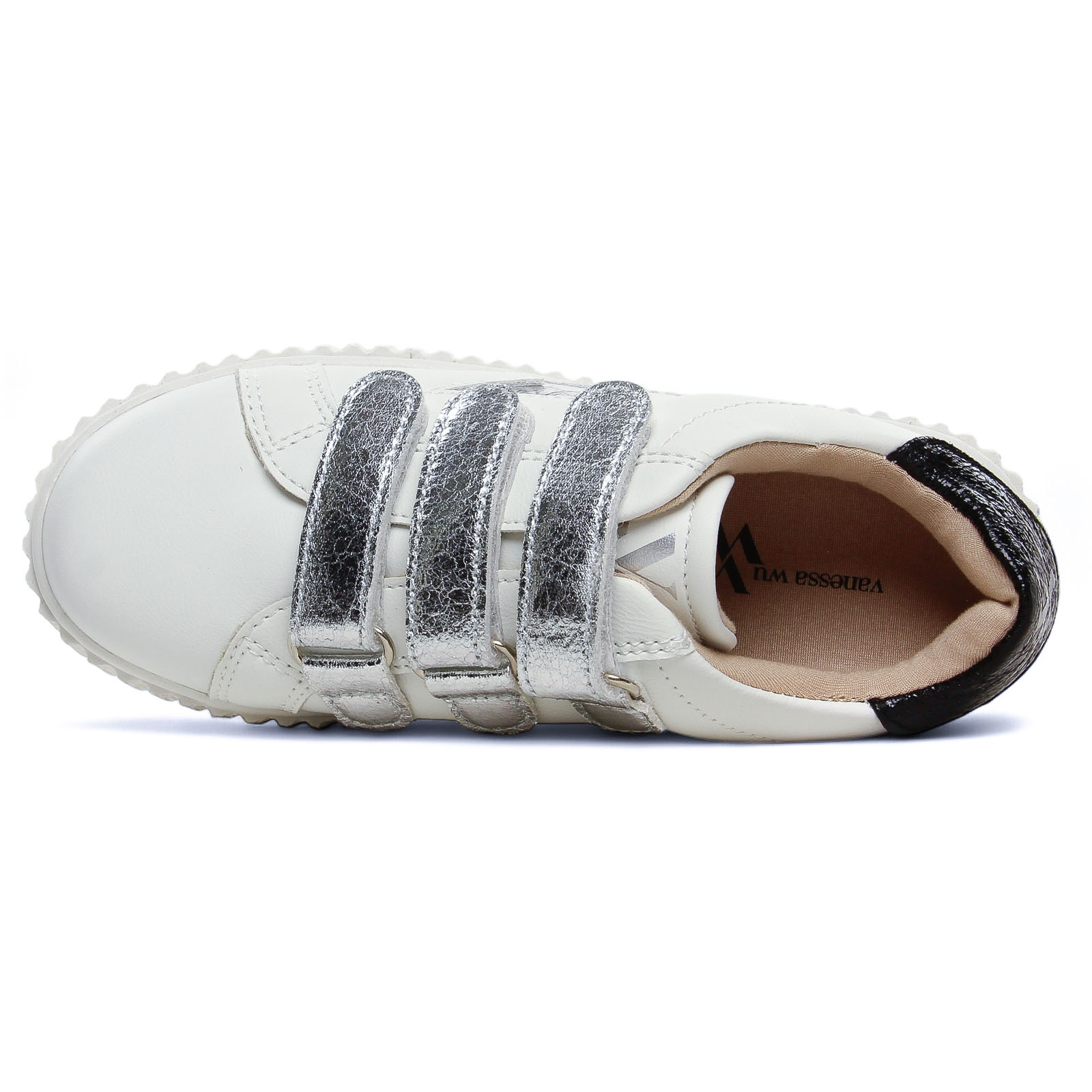 Baskets Enfants de la marque Vanessa Wu de couleur blanc argent. Baskets éclair pour enfant signées Vanessa Wu, triple scratchs metalisés et semelle plateforme, deux versions disponibles une blanche et dorée et une autre blanche et argent.
