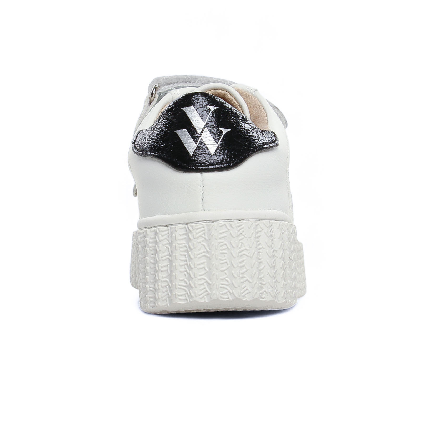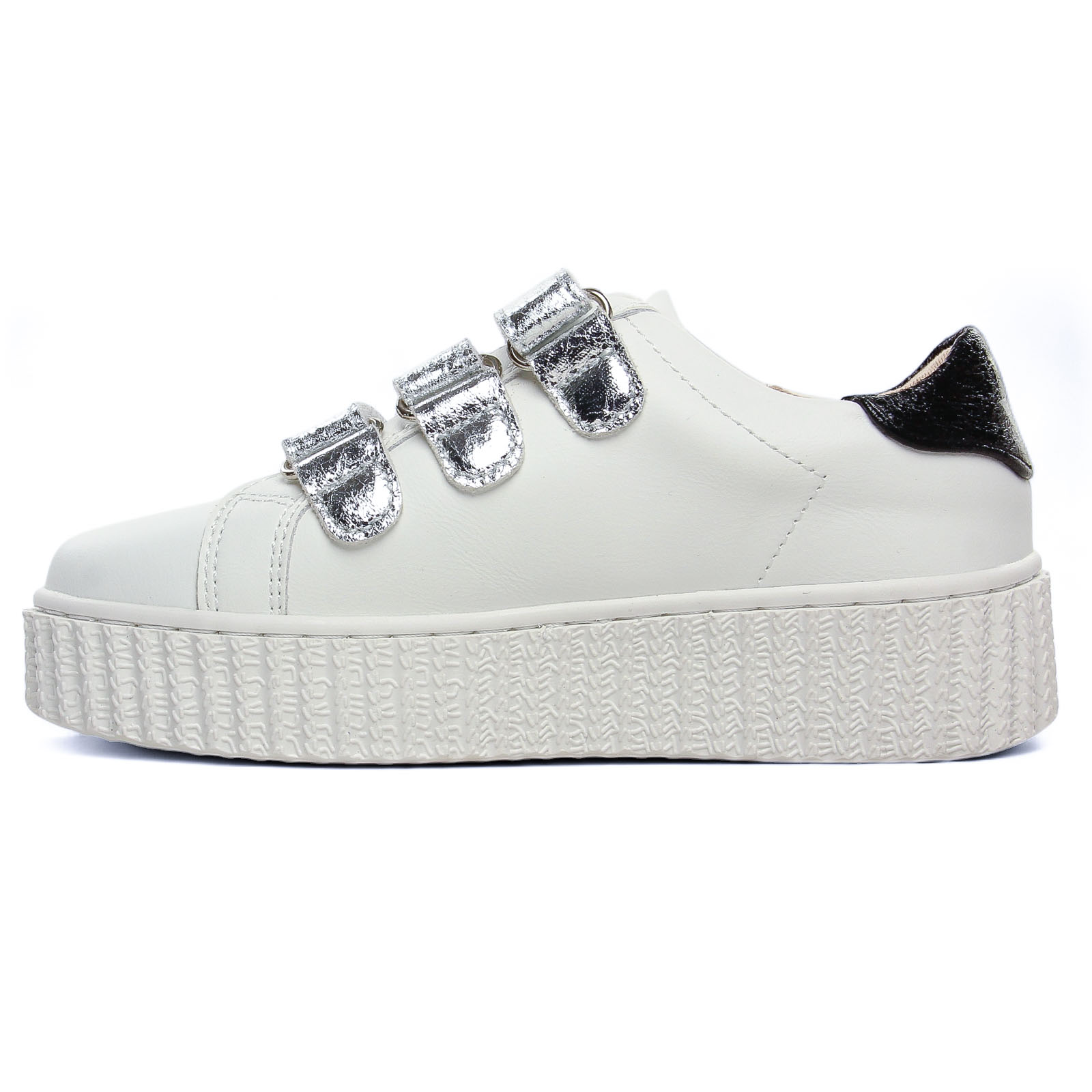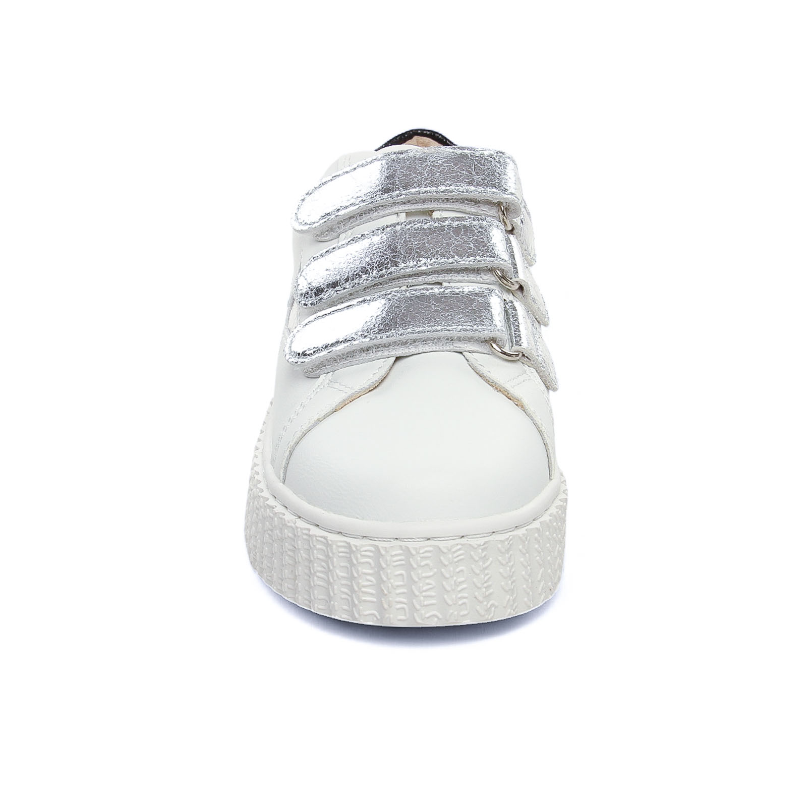 Baskets Enfants de la marque Vanessa Wu de couleur blanc argent. Baskets éclair pour enfant signées Vanessa Wu, triple scratchs metalisés et semelle plateforme, deux versions disponibles une blanche et dorée et une autre blanche et argent.
